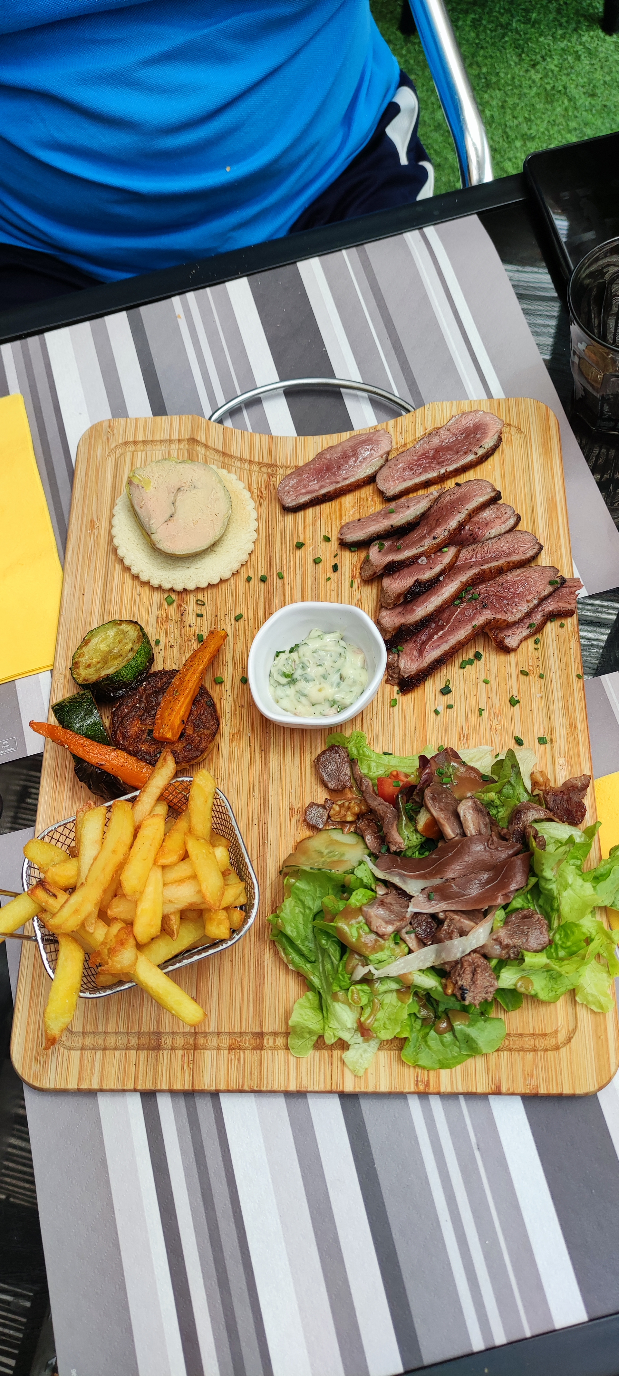 Accueil agréable et chaleureux. Table en terrasse, vert et cosy. On a choisit la planche périgourdine. Généreuse et gourmande. Foie gras fait maison. Les produits sont frais. Délicieux 😋 Nous recommandons vivement !