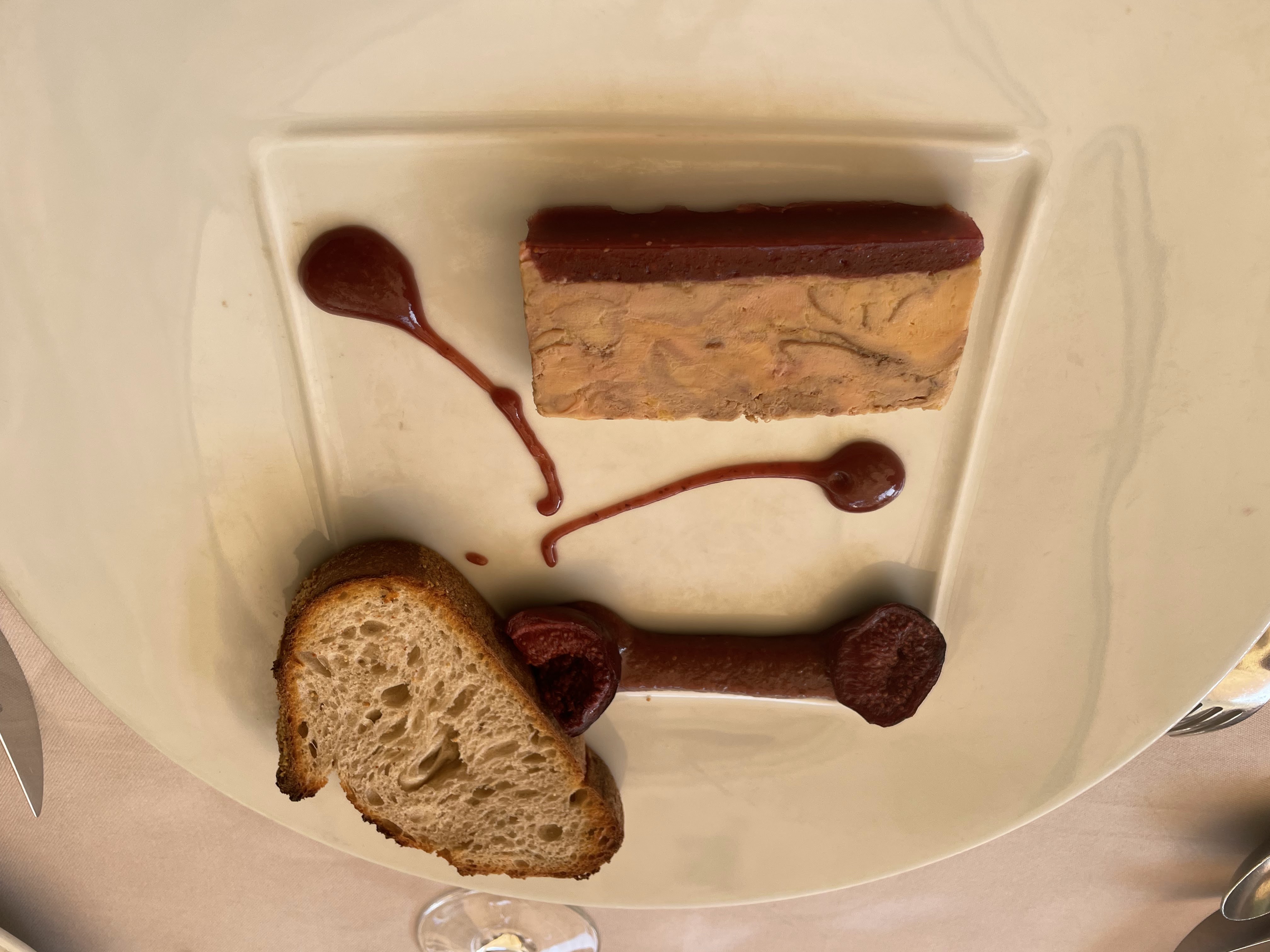 En septembre sur la terrasse . Très agréable Bon service Pas mal de personnel Presque trop rapide Entrée plat dessert à 57€ Vu l emplacement et les plats c est raisonnable Un bon foie gras Comme le faux filet Finger à la figue correct Avec apéritif , café . 255€