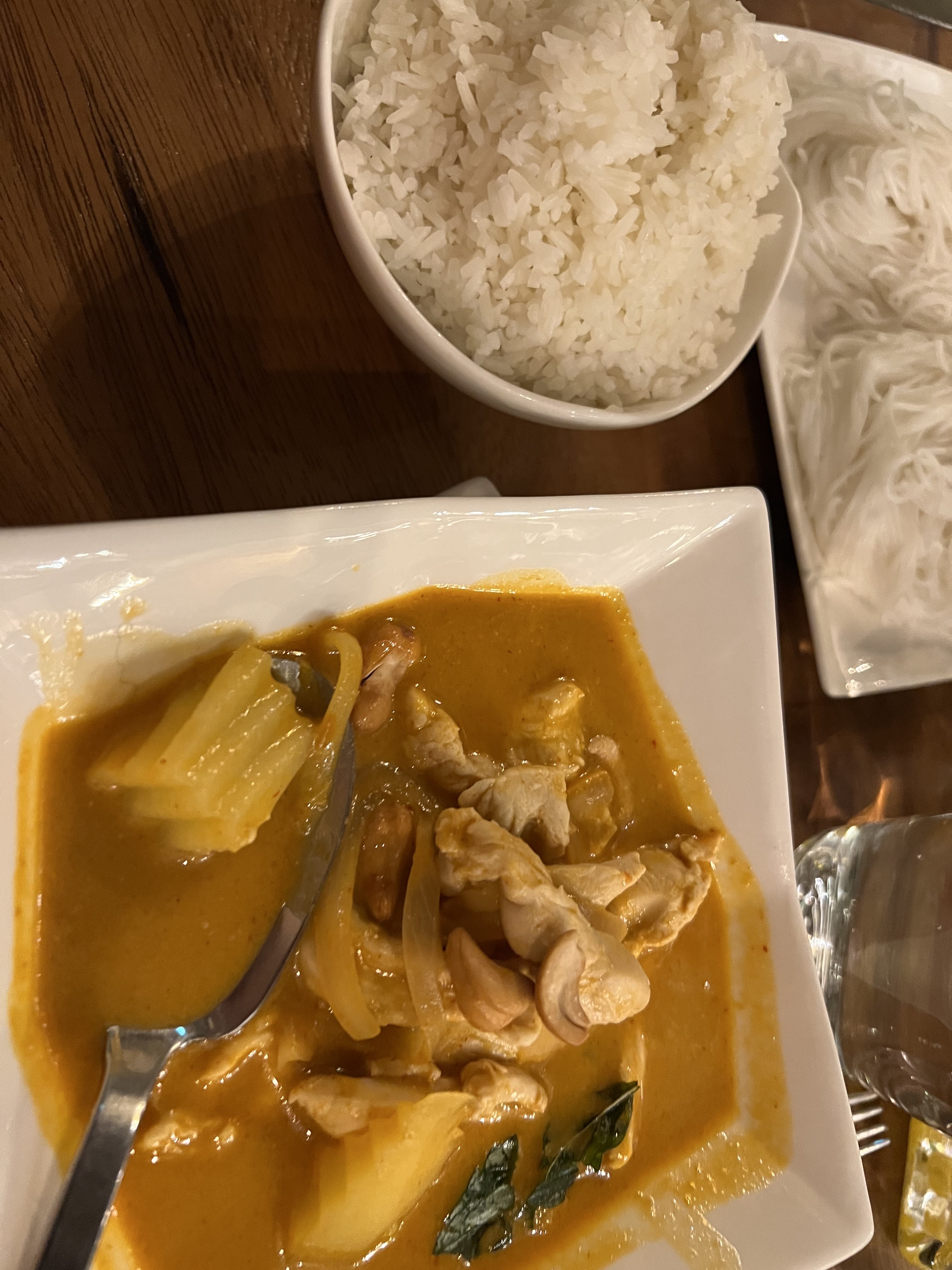 La nourriture n'était pas bonne du tout surtout pour le prix, le pat thaï était moelleux, le massaman avait des pommes de terre pas assez cuites et la sauce était vraiment aqueuse. De plus, le serveur que nous avions était vraiment désagréable et nous a donné une attitude (soufflant et soufflant) car nous ne l'entendions pas bien, même s'il parlait très doucement et avec un fort accent. À la fin, il a en quelque sorte précipité notre ami pour débarrasser la table pendant que certains d'entre nous payaient la facture. Inutile de dire que l'expérience n'était pas à la hauteur de ce à quoi nous nous attendions compte tenu de toutes les bonnes critiques ici.