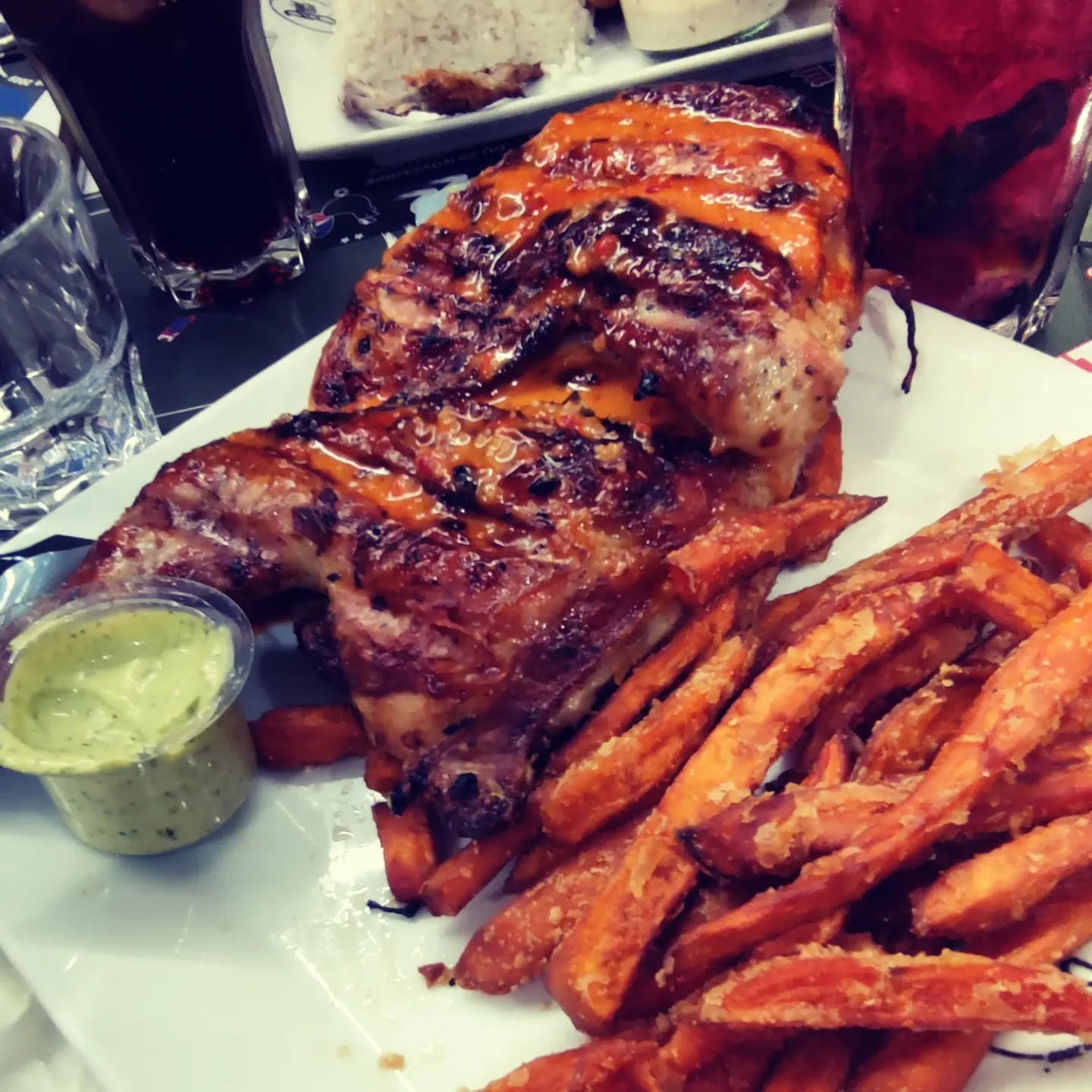 Voici un avis que vous pouvez laisser pour le restaurant : --- **Note : 2/5** Je suis allé manger dans ce restaurant et j'ai commandé un demi-poulet rôti avec des potatoes douces pour 14,5€. Malheureusement, j'ai été très déçu par la taille de la portion. C'était beaucoup trop petit pour le prix payé. Il n'y avait ni riz ni autre accompagnement, ce qui rendait le repas insatisfaisant et bien trop cher pour ce qui était offert. Je ne recommande pas cet endroit pour ceux qui cherchent un bon rapport qualité/prix.