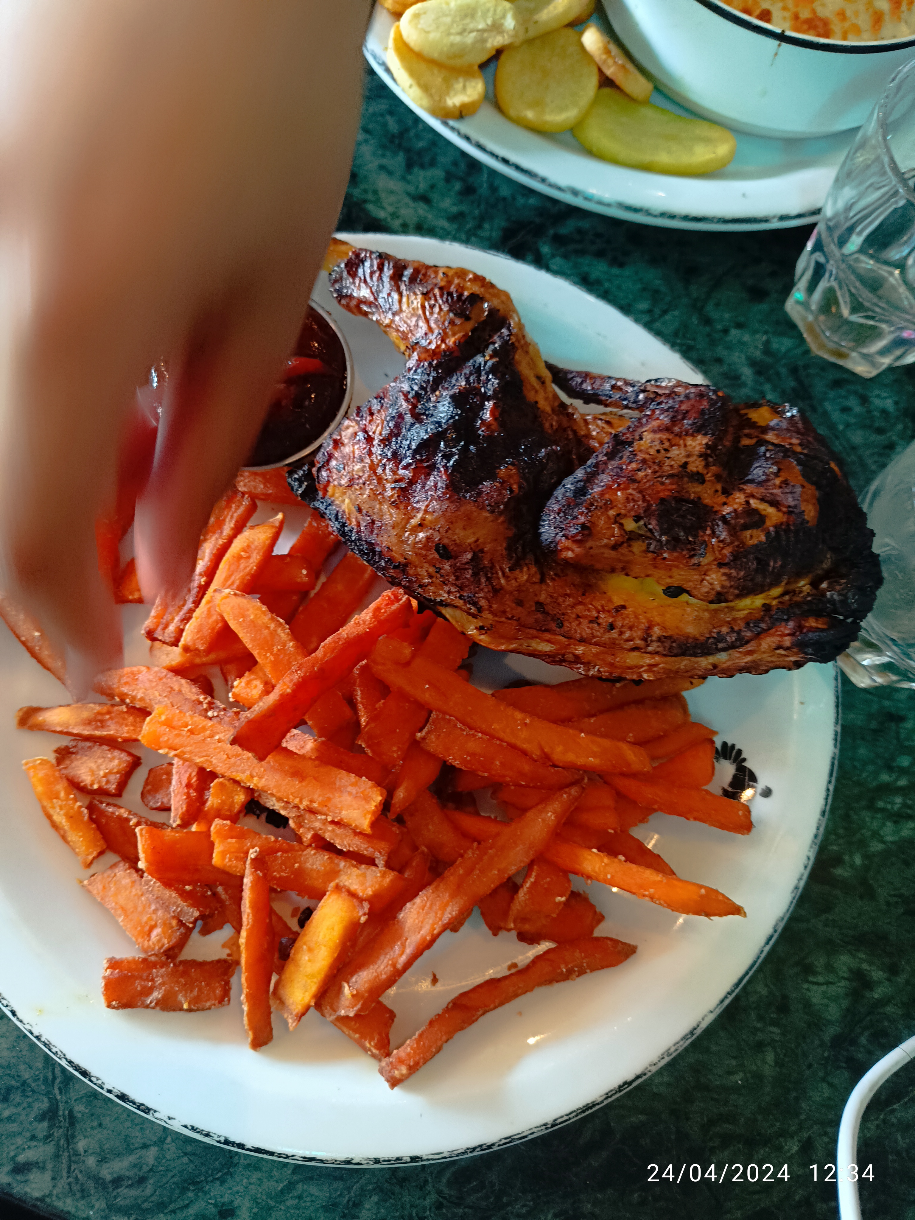 Le poulet est très bon mais la portion est trop petite on dirait des cailles. Pour le prix qu'on paye je trouve que c'est abusé. Il faut payer le supplément pour les patates douces et les sauces. Le personnel est très désagréable, ils papotent ensembles au lieux de faire leur travail. Le service est très très lent et il manque un peu de professionnalisme de la part des serveurs. La ou on était, au dessus de nous, pendaient des toiles d'araignées 😮💨😮💨 Bref, j'ai donné une étoile car on ne peut pas donner moins.