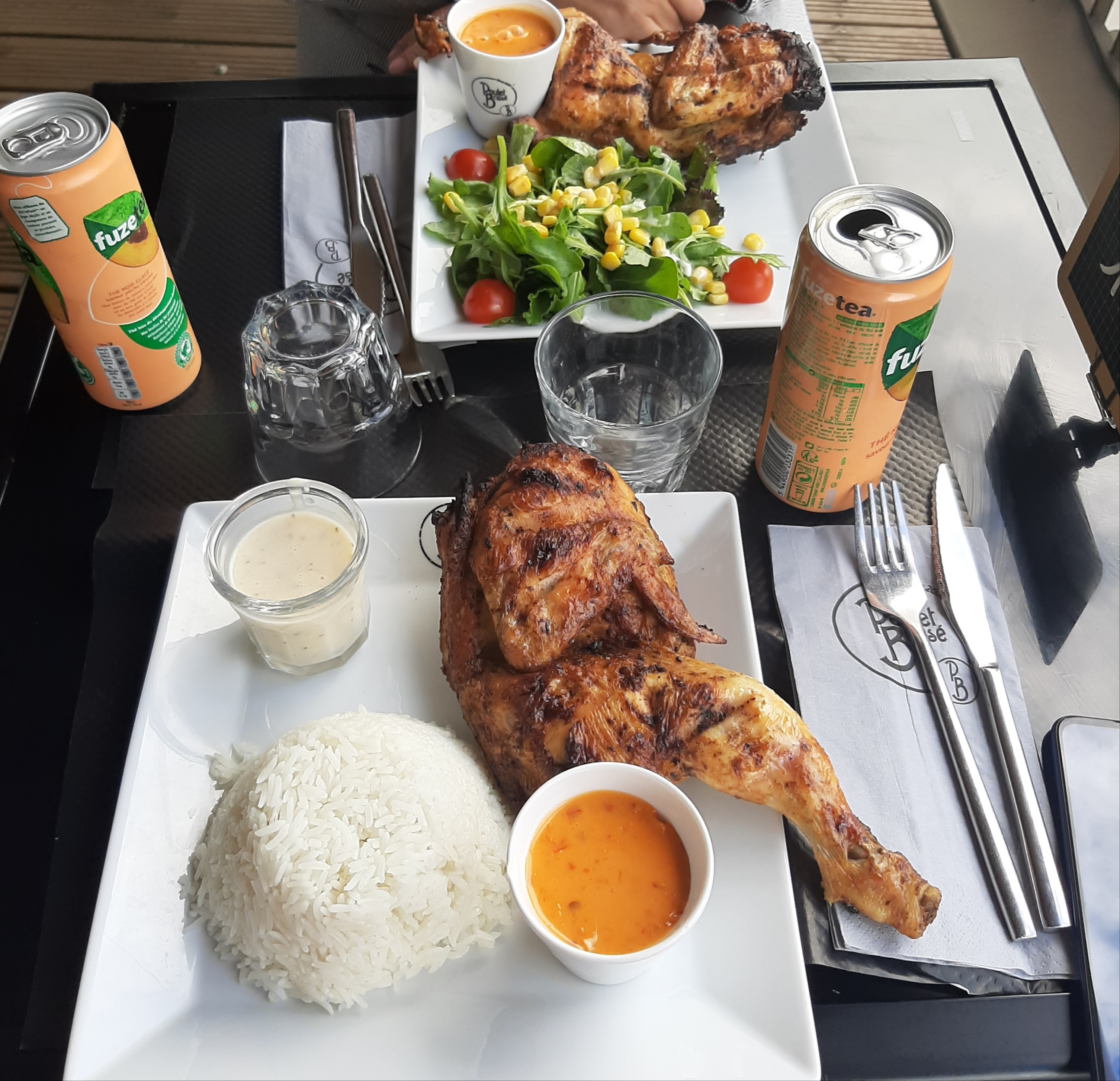 Un régal! J'y suis allée deux fois de suite et je n'ai pas été déçue. Le restaurant est spacieux et décoré avec goût. On s'y sent bien. Le personnel est avenant, très aimable. La carte à un large choix (poulet braisé, burgers, salades, tenders, wings etc...). J'ai pris un demi poulet avec du riz et des alokos. Les portions sont généreuses. Les sauces étaient excellentes (préférence pour la sauce curry-cumin). J'ai essayé également la salade césar mais je suis moins fan car le fromage avait un goût un peu spécial. Pas d'avis concernant les desserts car je n'en ai pas pris. Le service a été rapide et les tarifs sont raisonnables. Je recommande.