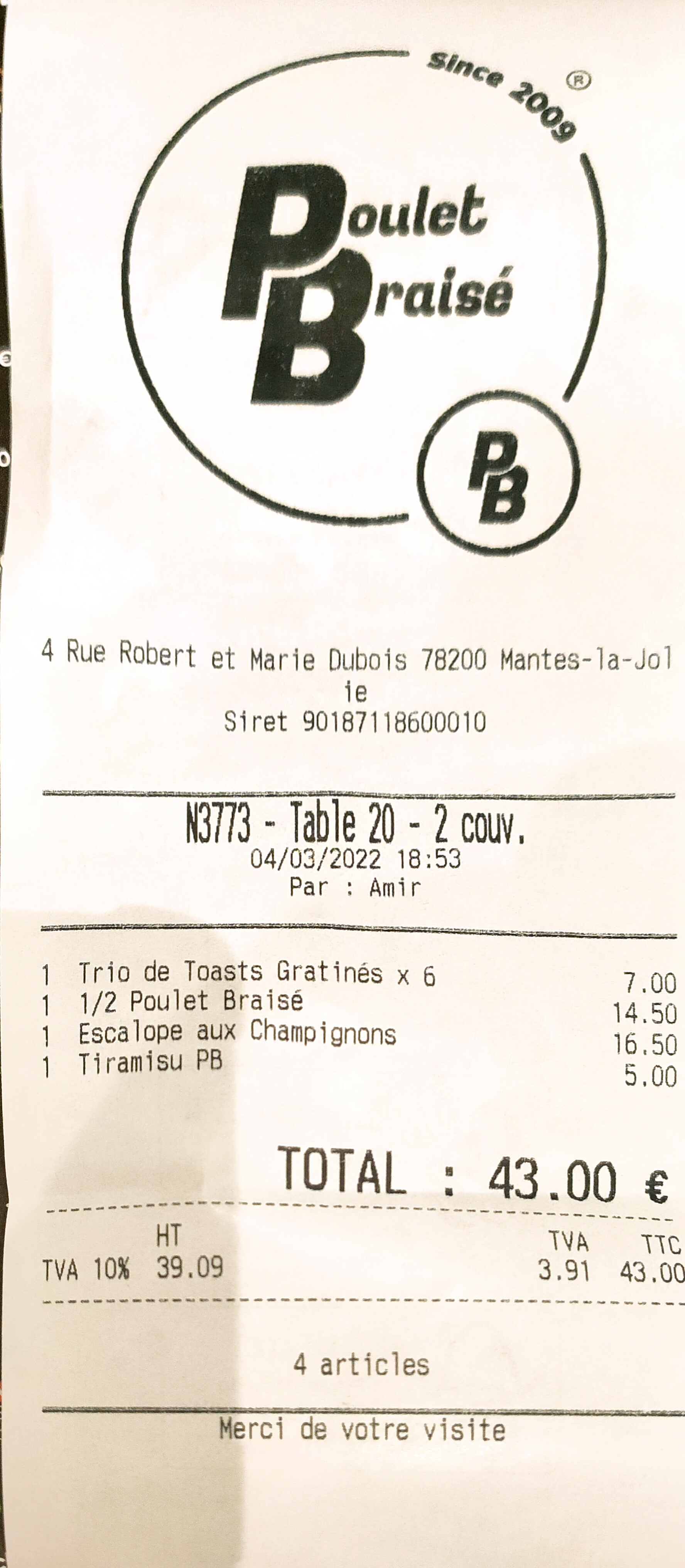 Moi qui sors presque jamais manger à l'extérieur, ce fut une occasion de tester du poulet braisé suite à des conseils. Et bien j'en ressors ravi et vraiment bien mangé. Je recommande PB mantes la jolie et d'ailleurs nous avons commandé à nouveau