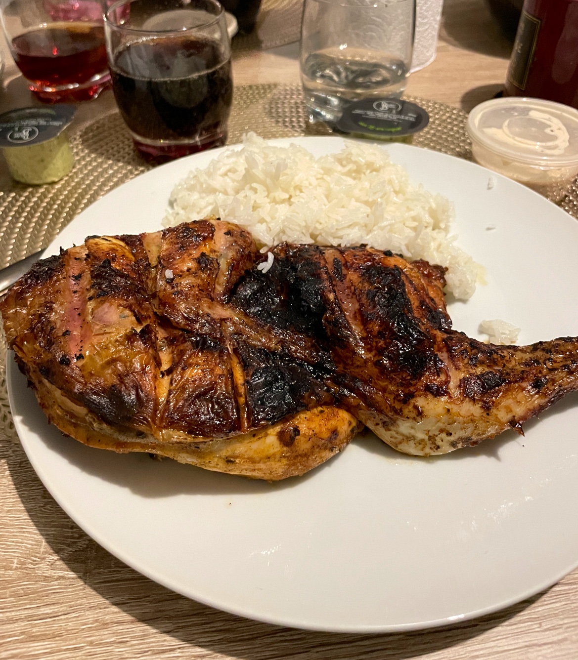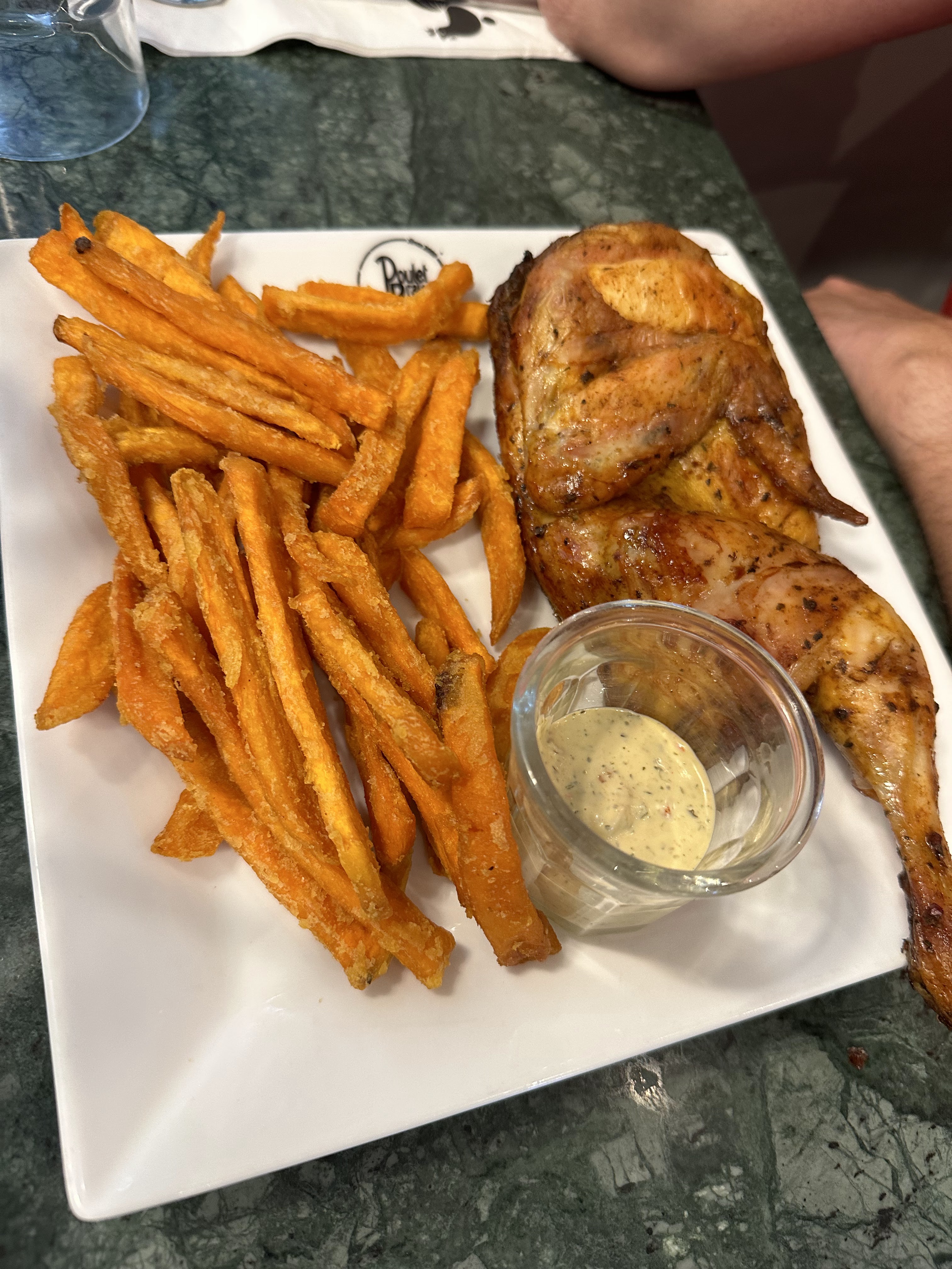 Bonjour, C'est ma 1ere commande. Honnêtement, c'est super bon le poulet. Je le recommande avec la sauce verte. C'est 1 délice. Les quantités sont correctes pour le prix dépensé. En plus accueil au top. A la caisse un jeune homme hyper sympathique, serieux et tres consciencieux. Il contrôle les paquets pour vérifier qu'il n'ya pas d'oublis. Restaurant propre et décor agréable. Serieux, gardez la recette du poulet grillé et la recette des sauces. Mais surtout gardez les proportions de poulet car c'est ce qui fait la différence. Personnellement, vu le prix payé je ne m'attendais pas à avoir une quantité moindre ( ma note aurait été vraiment sévère j'avoue ) !! Merci Cordialement