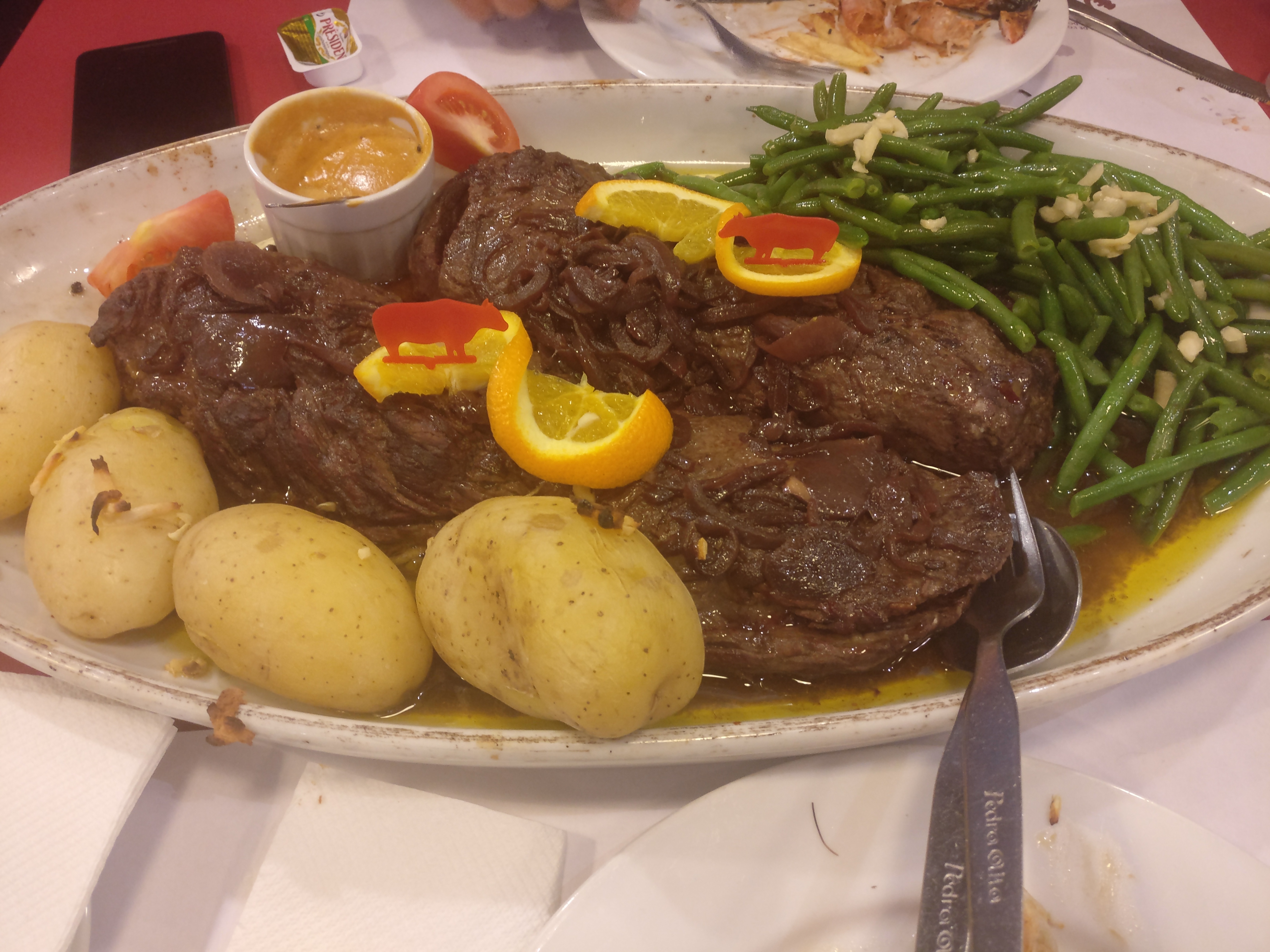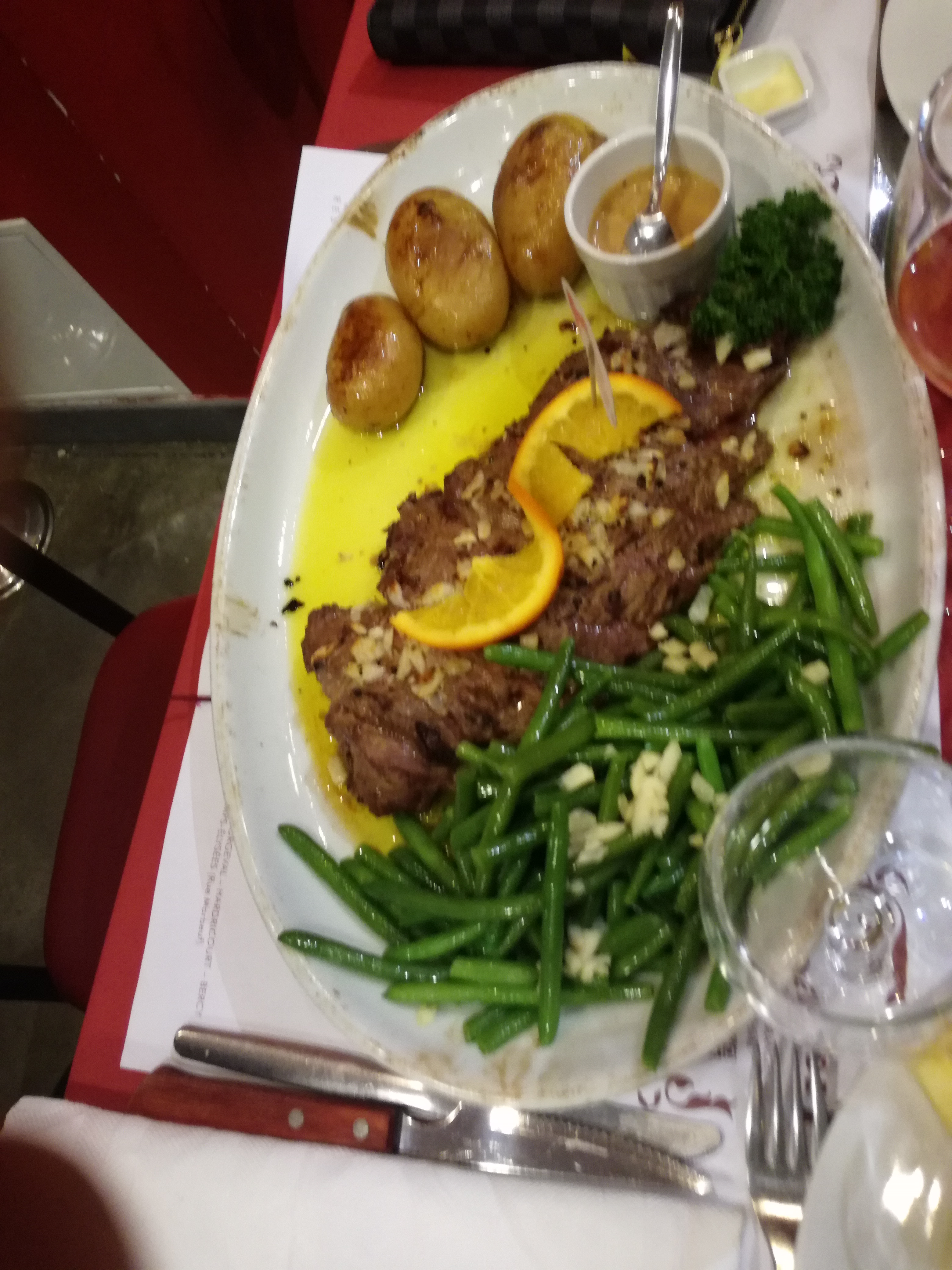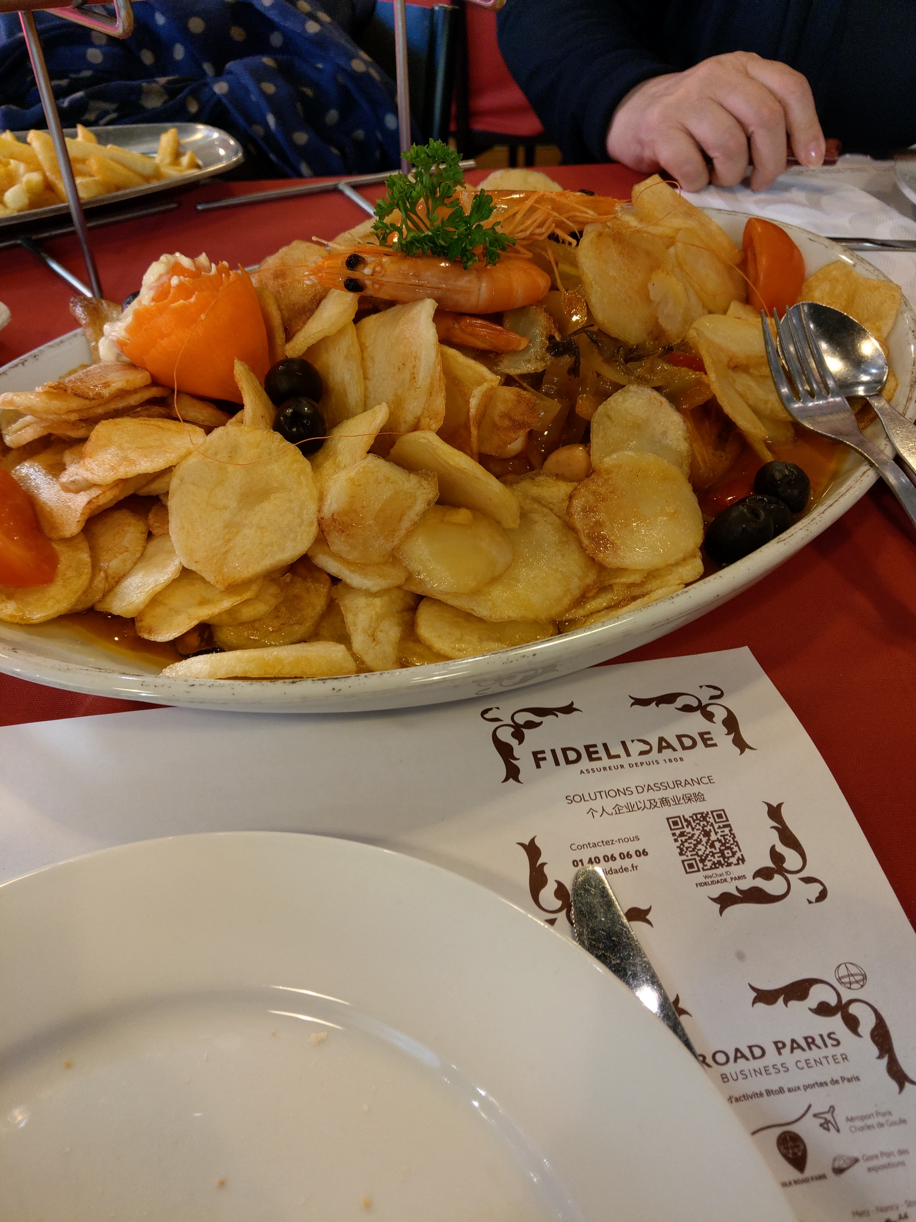 Ayant lu les commentaires, j'angoissais un peu d'y être invitée. Et bien non, tout s'est très bien passé :les serveurs aimables, pas très rapides mais tout à fait excusés compte tenu de l'affluence (pour un dimanche soir !), et des assiettes comme je n'en avais jamais vues. Heureusement, pas d'entrées. Ma commande, une brochette de rumsteak bien tendre, prévue pour une personne, aurait nourri trois bons appétits. J'ai eu du mal à la soulever seule pour retirer la broche. Les frites pas terribles, mais ça valait mieux, sinon pas possible de finir la viande. La morue pour 1 personne approchait le kilo, accompagnée de beaucoup de chips maison (meilleures que les frites), de deux grosses crevettes et de la mayo. Le restaurant a tout prévu : si vous ne finissez pas, des doggy bags sont disponibles (et j'en ai vu passer beaucoup). La 2ème brochette de porc de mon mari a fait le bonheur du chien à notre retour.