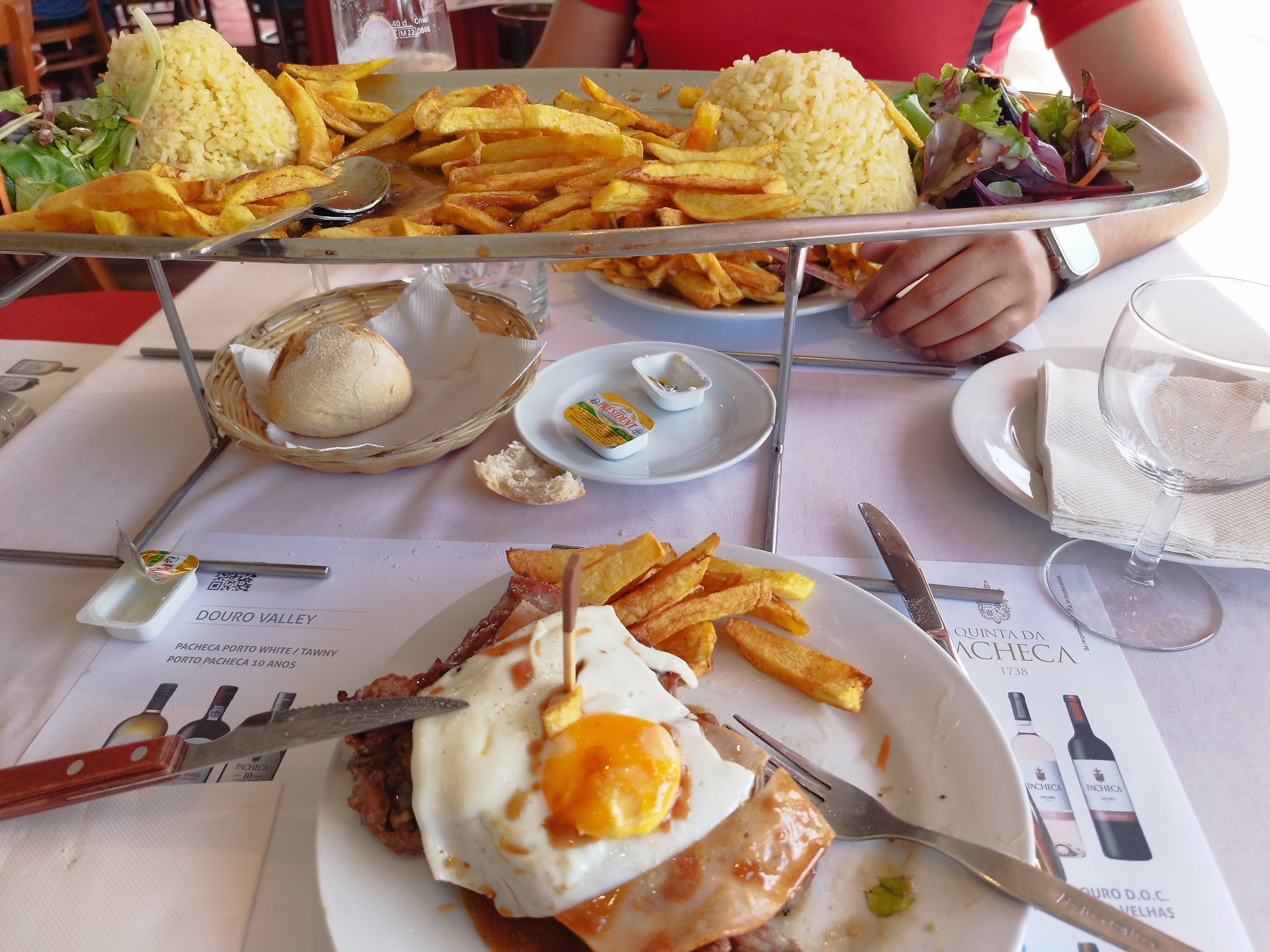 Portions gargantuesques ! Comme au Portugal apparemment. Demi-dose -> censé être pour 1 personne... plutôt pour 2 Dose -> idem mais pour 3/4 Doggy bag plus que conseillé ! Pour le reste, cuisine riche typique du Portugal, axée sur grillades et fruits de mer. C'est riche et gourmand ! Service rapide et efficace même quand il y a du monde ; pas sûr qu'ils prennent les réservations