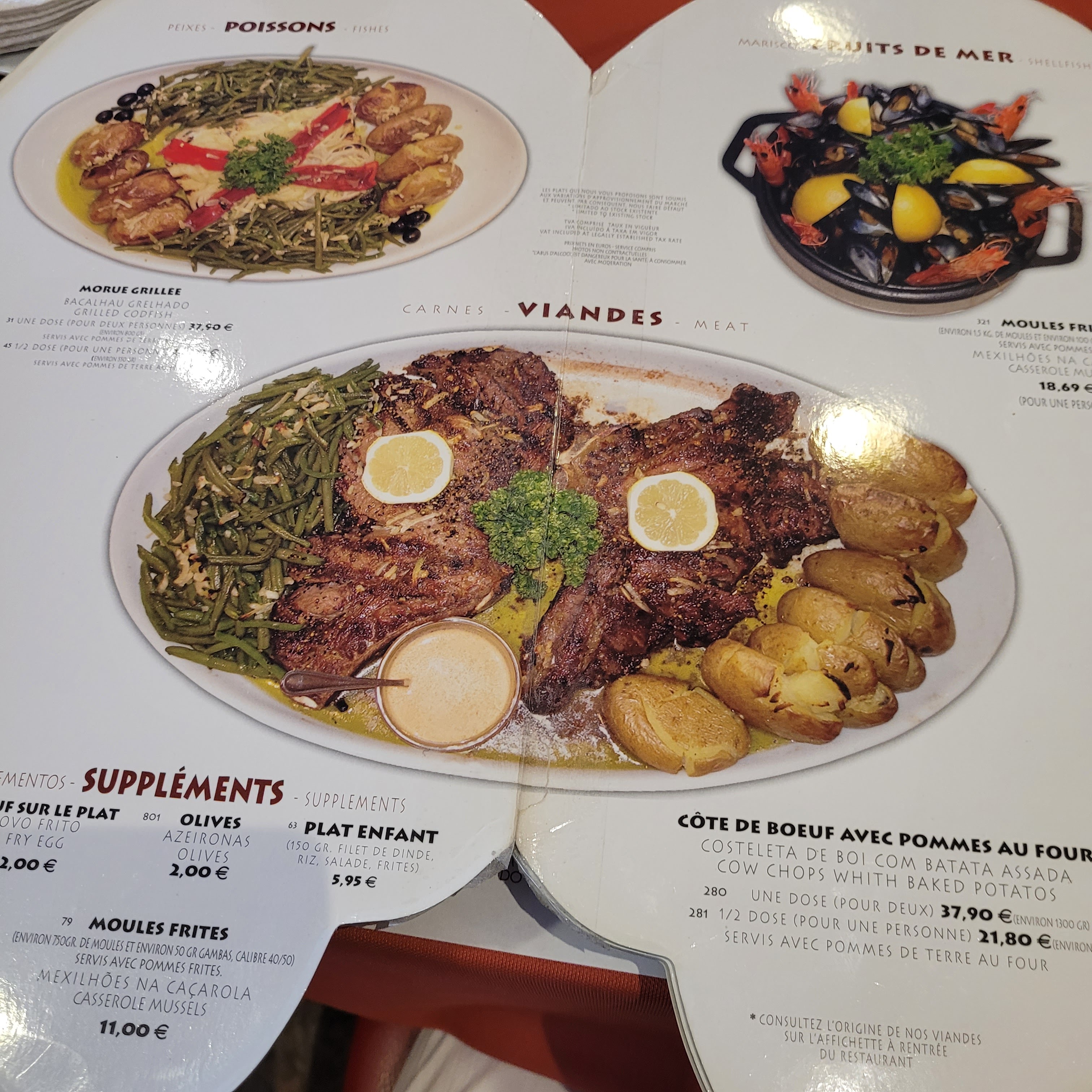 Restaurant où il faut arriver le ventre vide et on repart le ventre plein. Heureusement, on peut demander à emporter les restes. Le plat très copieux le moins cher et le faux filet à 13,90 euros. Il y a un plateau de fruits de mer d'oléron: huîtres, gambas, moules... pour 18,90 euros. J'ai jamais pu prendre de dessert qui sont aussi très copieux. L'indémodable bakalau(morue) avec ses chips maison...