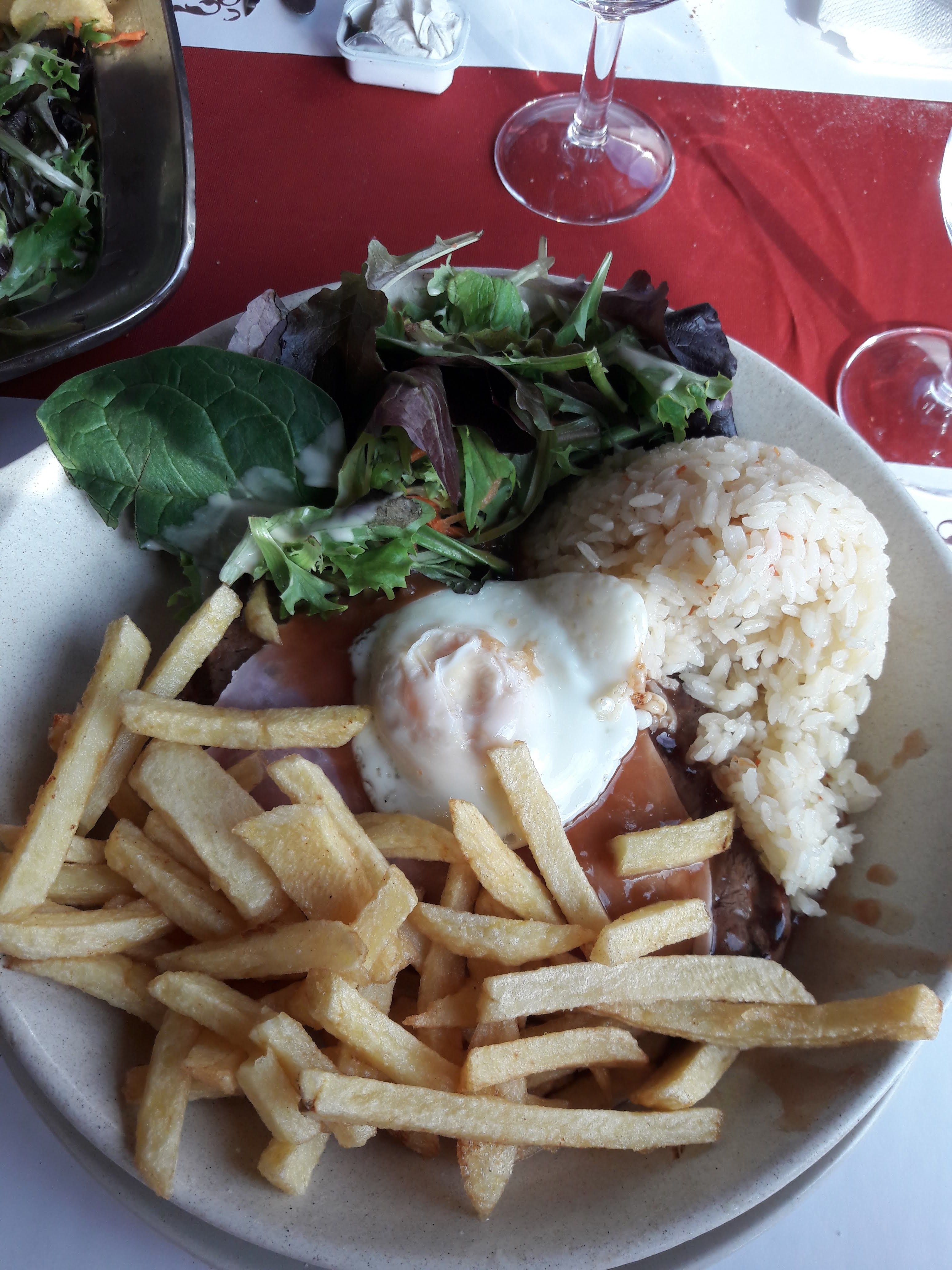 Plutôt déçu par notre passage dans ce restaurant : 4 adultes, 1 morue grillée pour 2 qui était très fade, et baignait dans l'huile. 1 Faux filet/oeuf rempli de nerfs et pas de couteau à viande pour s'en sortir. 1 mix boeuf crevette correct Le tout très copieux. On a aissé le poisson car finalement insipide malgré la quantité restante. Les frites semblent maison mais sont plutôt sèches/flétries. La carte des desserts où 5 sont indisponibles... Dommage, étant passé une autre fois, où tout était très bien. Au vu du prix final de 140€ environ ça ne devrait pas arriver. Reste un petit plus : si le personnel, bien que très serviable, pouvait être souriant, ça serait super.