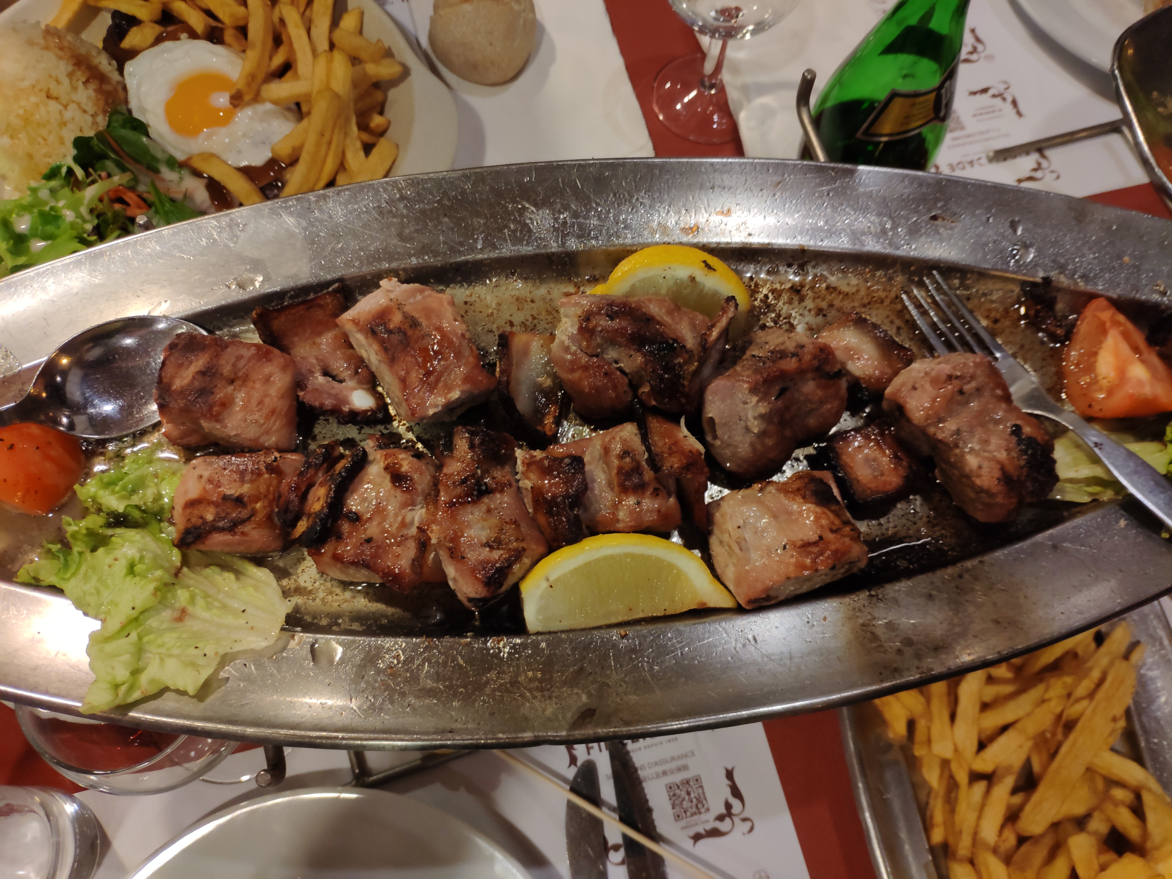 Nous sommes aller sous le conseil d'amis portugais qui nous l'ont vendu comme excellent. Nous y sommes aller à deux, en amoureux. L'endroit est propre, un peu bruyant du au fait que la salle est grande ouverte. Les serveurs, mettent un peu de temps à venir nous prendre la commande mais bon on a su attendre. Nous avons commander mais pas de peau pour nous, la commande n'est pas passé dans l'ordinateur, 45min à attendre alors qu'on voyait des plats défilé sur des tables arrivé après nous. C'est dommage. Sinon, la nourriture est très bonne, les plats sont copieux et on n'a plus de place pour le reste. Je met 3 étoiles puisque j'ai apprécié la nourriture par contre le service je n'ai pas bien compris.... Peu être à retenté dans un meilleur moment ?