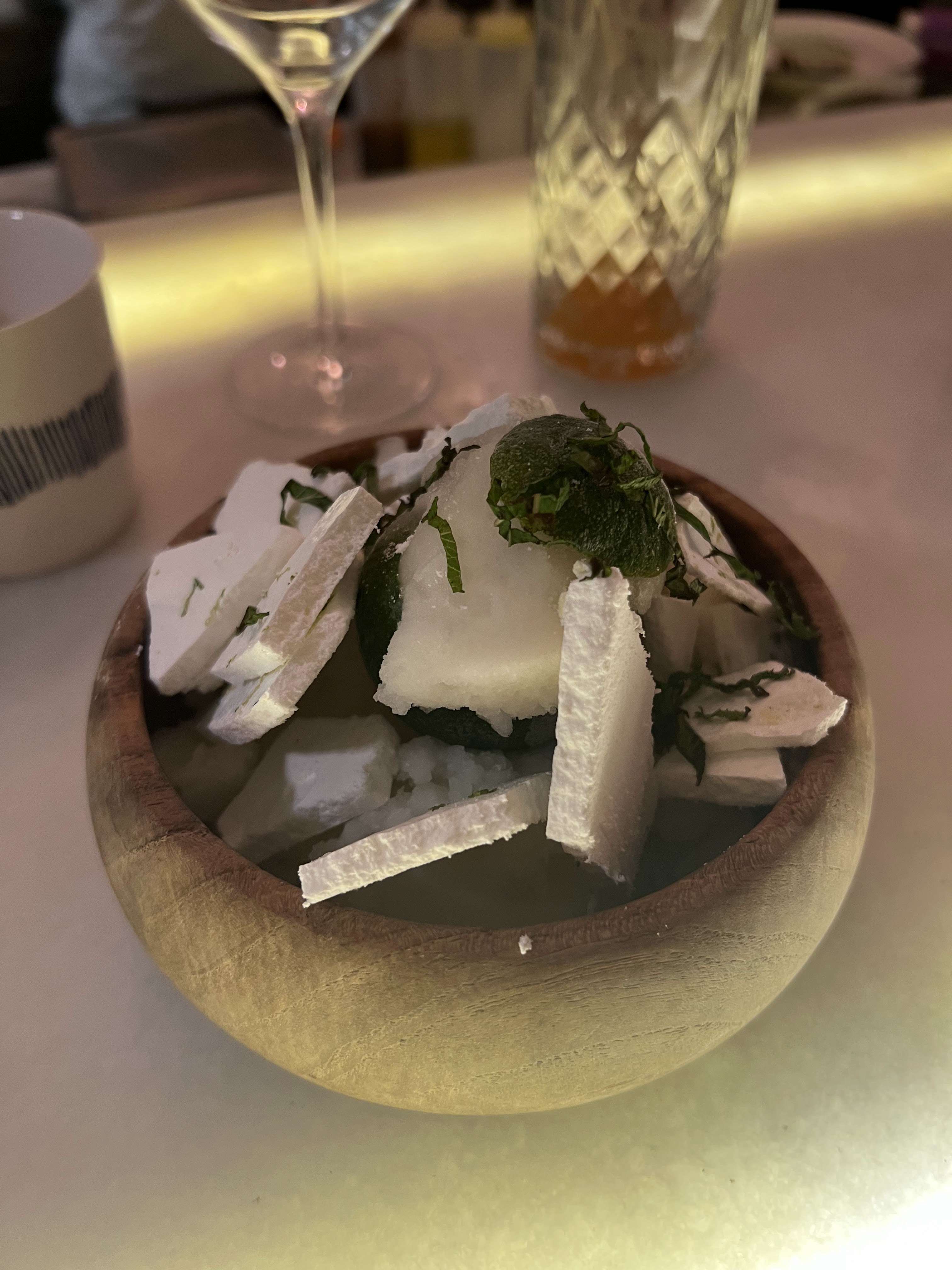 Déco magnifique, service impeccable, plats délicieux et très particuliers! La combinaison des saveurs est parfaite et très originale. À ne pas rater! On a pris un tartare de gambas avec mayonnaise à la vanille, mousse au lime (si je ne me trompe pas) et pistaches (suggestion du jour) ainsi que des seiches panées en entrée; le poisson du jour et le mijoté de poulpe en plat principal et pour terminer la pavlova et la crème brûlée (mais on a oublié de les prendre en photo). Tout était excellent!