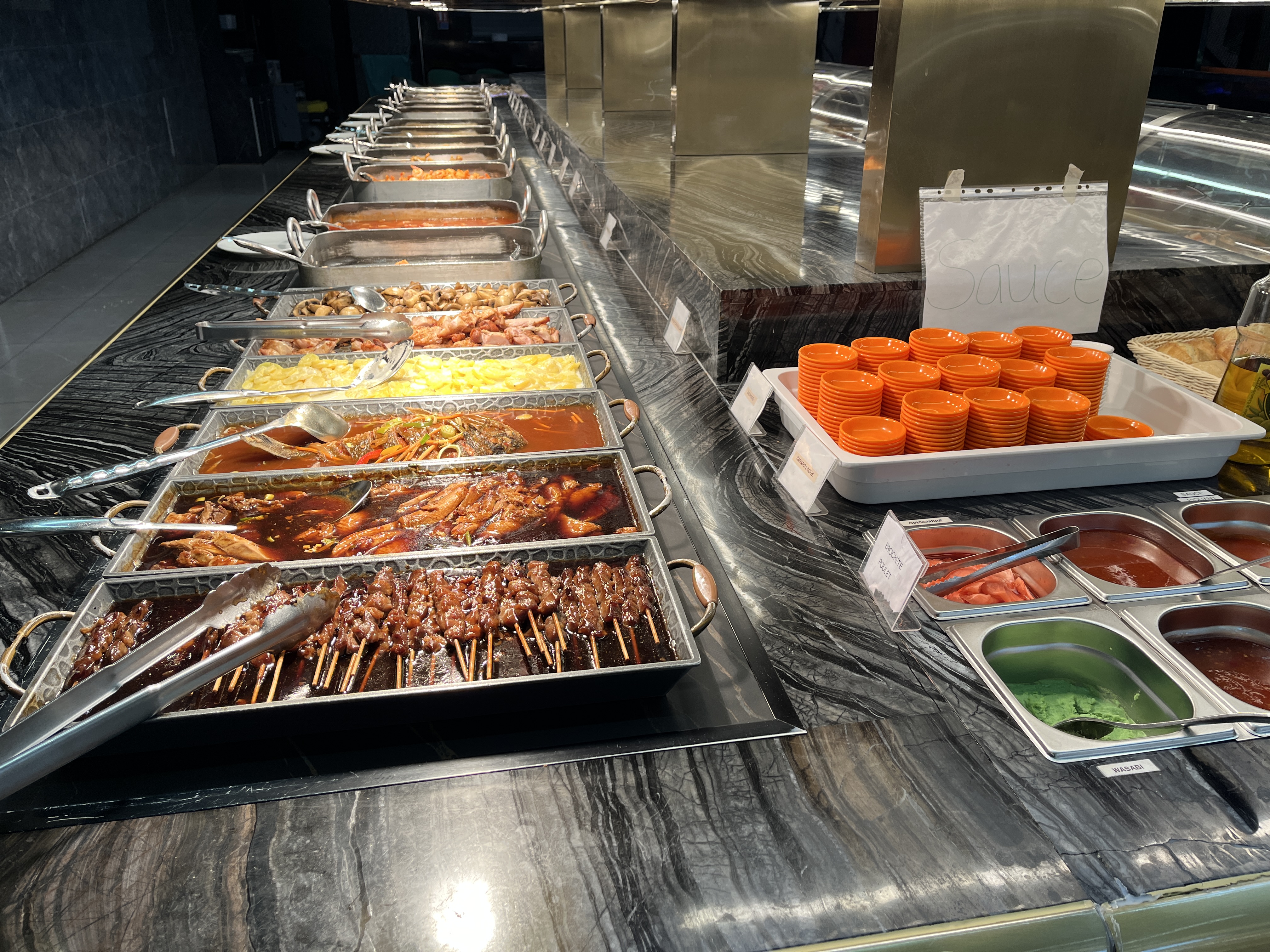 Buffet à volonté classique, la viande et le poisson sont correctes et les plats assez savoureux, satisfaisant dans l'ensemble , ambiance très calme malgré le monde