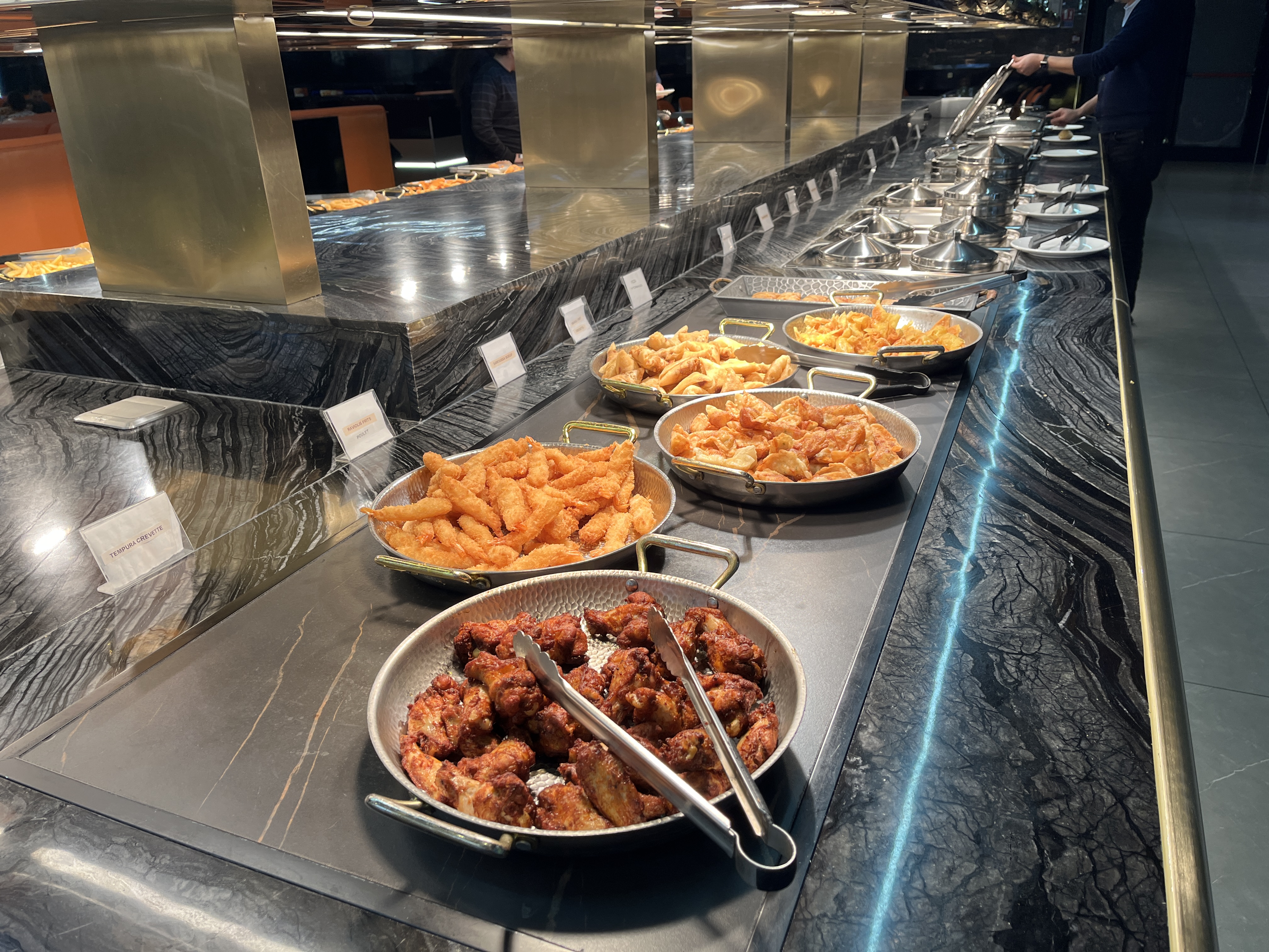 Superbe buffet!!!! Il y en a pour tous les goûts ...viandes, poissons, nems, calamars, fruits de mer, légumes, sushis , desserts, bonbons.... Impossible de tout énumérer tellement c'est bien garni Je recommande fortement, très bon rapport qualité/ prix