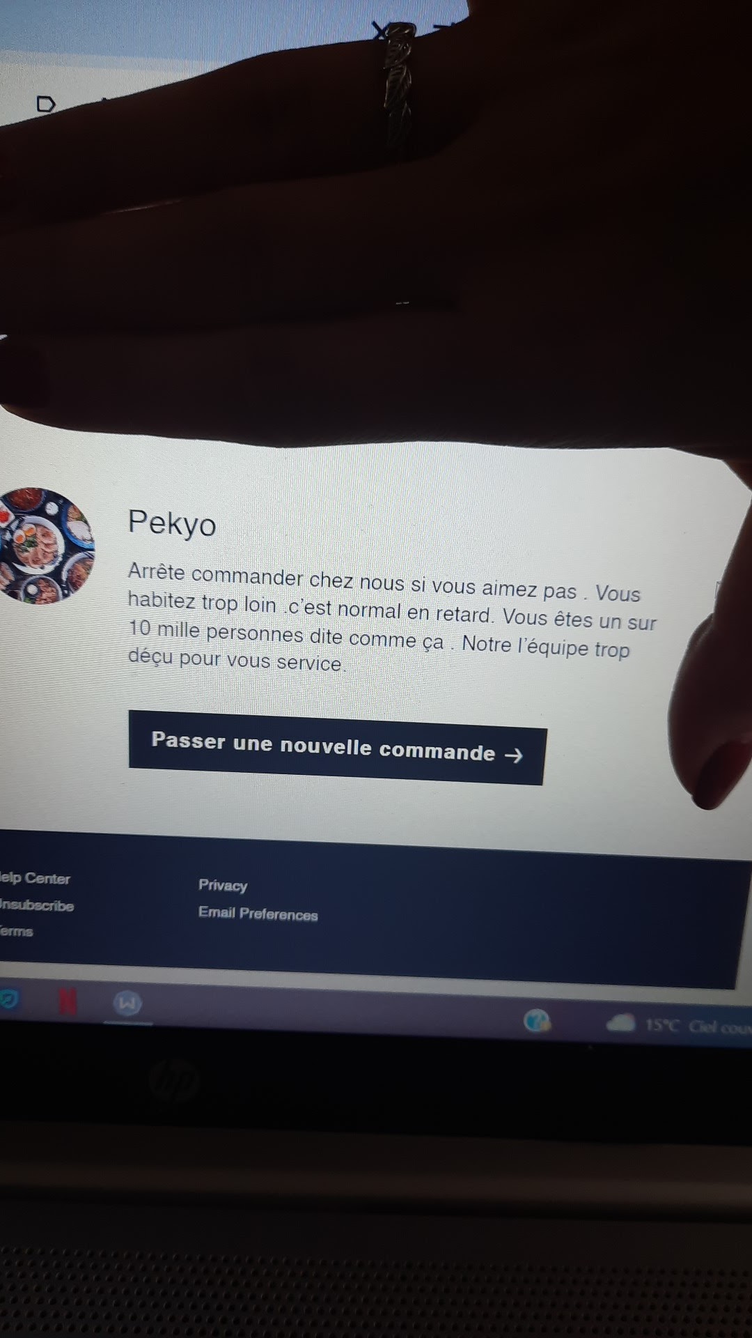 Merci au livreur qui s'appelle Bilel, il a sauvé mon chien qui s'étouffait pendant qu'il me livrait