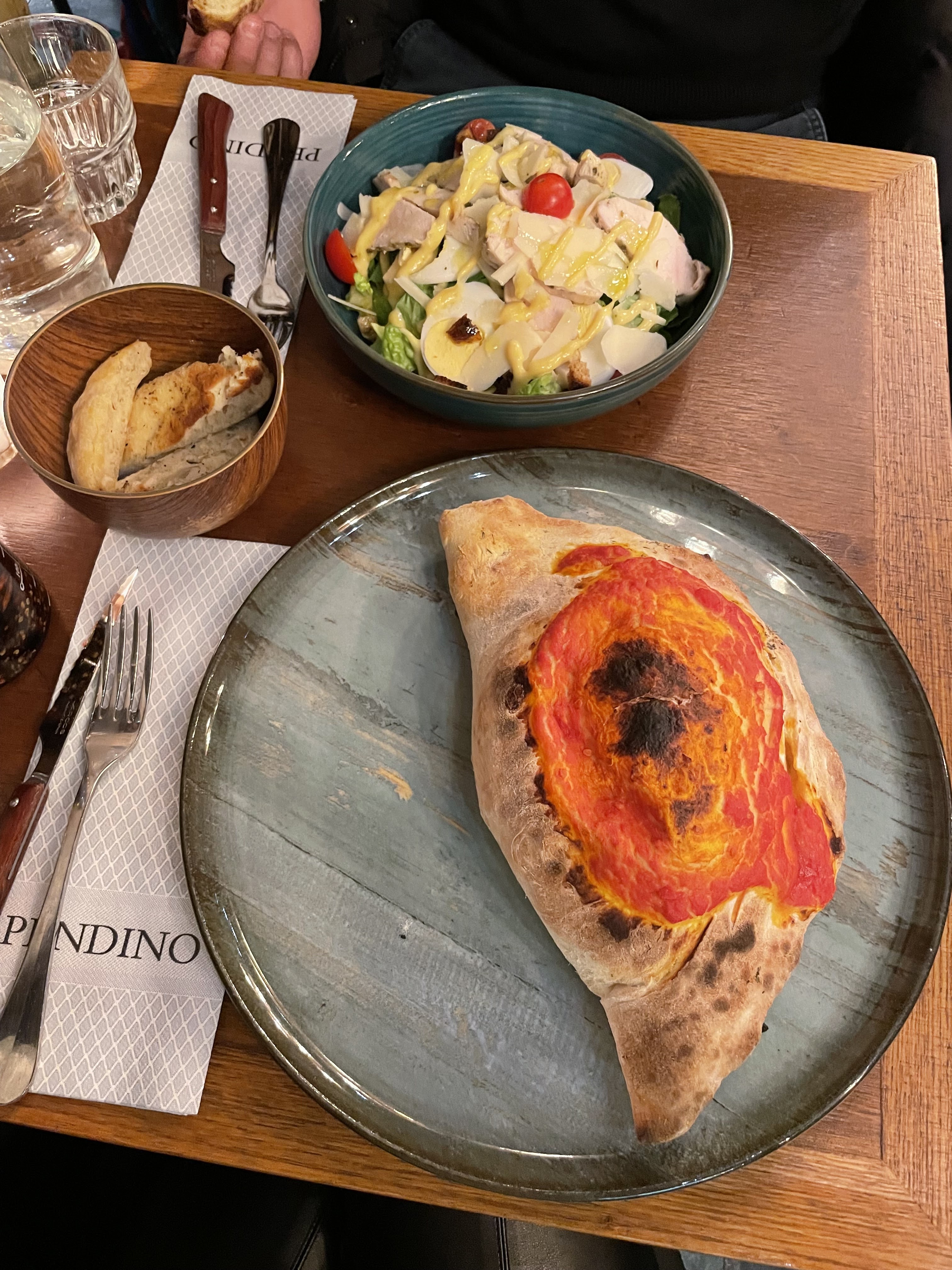 La nourriture était délicieuse! Nous avons commandé 1 pizza calzone, 1 salade César et une grande bouteille d'eau en acier. Les deux étaient délicieux et suffisants pour deux personnes. Le montant total que nous avons payé était d'environ 50 €.