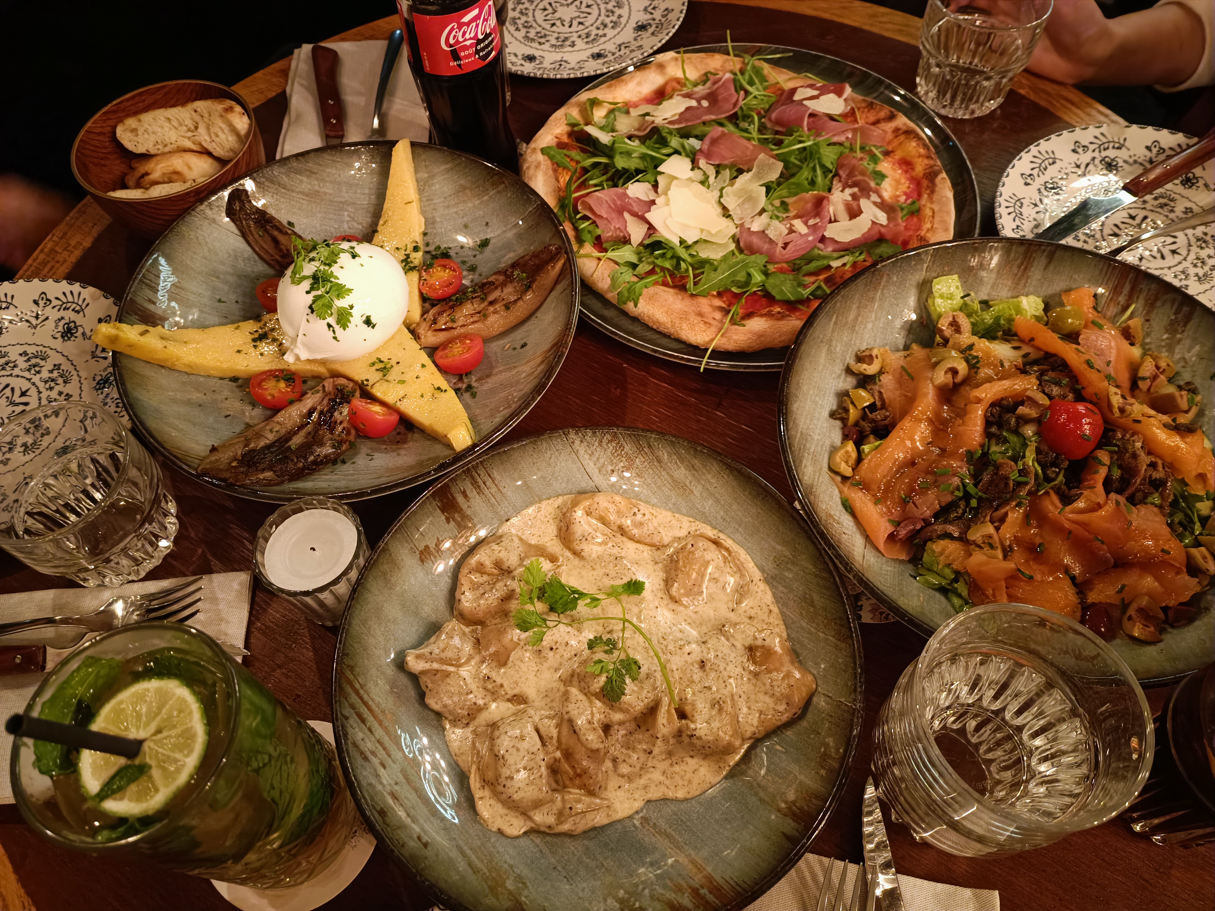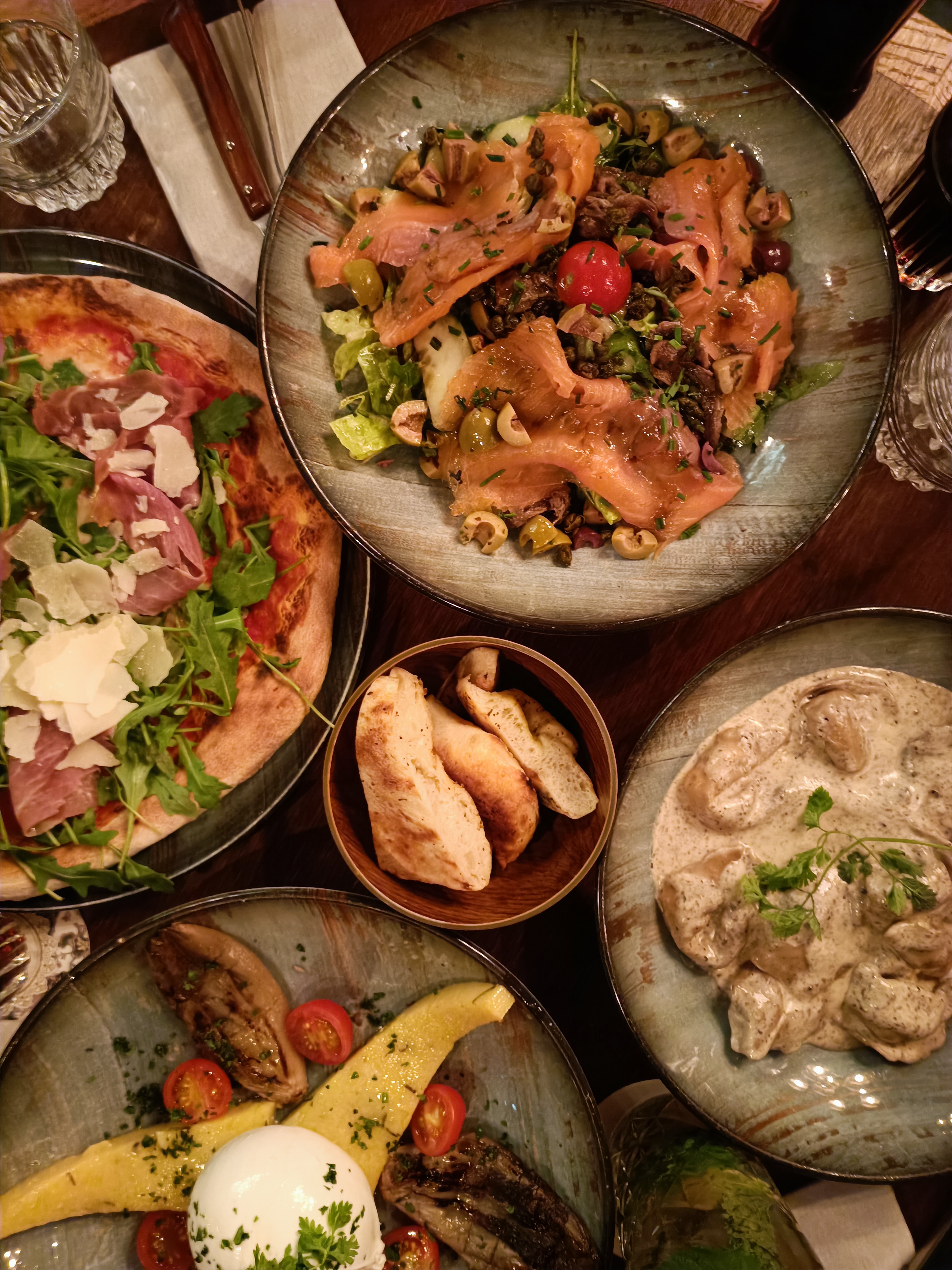 Nous avons commandé une salade de saumon, une entrée burrata, une pizza parme et des tortelli aux cèpes. La pizza et les tortelli étaient vraiment bons, mais les deux premiers plats sont meh. la burrata était médiocre et la salade trop salée à notre goût.