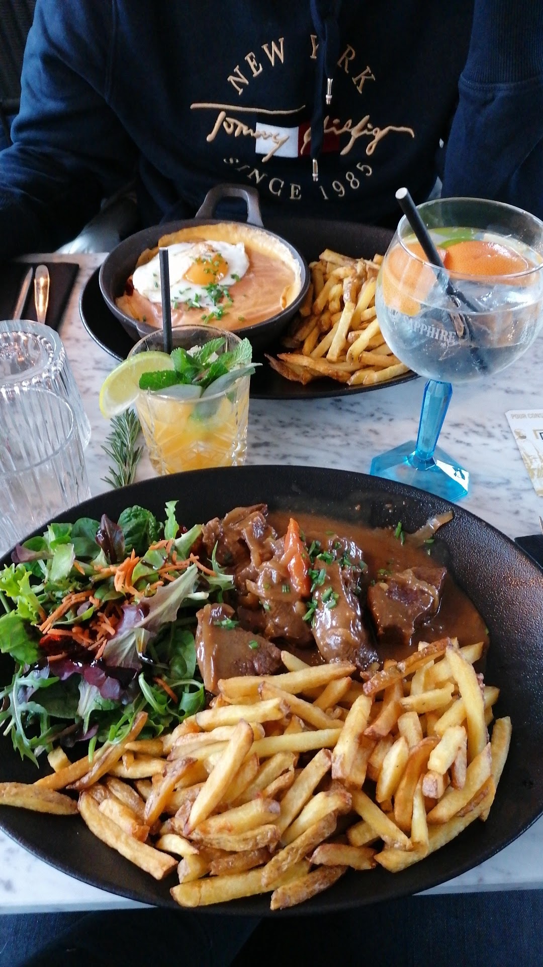 J'ai vraiment réfléchit à savoir si je mettais 3 ou 4 étoiles. En soit les serveurs/serveuses sont très aimables et très serviables mais il y a déjà un couac. On nous demande si on va prendre un apéro. nous disons OUI tout en commandant les plats (vu que l'on nous a demandé si on savait la suite pour après). Les plats sont presque arrivé avec les cocktails/apéro. Cela signifie donc que pour deux bières, un spritz et un autre coktails, il a fallu attendre 25/30 minutes... C'est long... Il se fait soif... Ma belle soeur a demandé de réserver un fondant au chocolat pour le dessert ... Le plus drôle est tout de même qu'il soit arrivé AVANT nos boissons... Dernier détail du service : mon frère a du réclamer à deux reprises pour enfin avoir sa bière pendant le repas. Autant vous dire qu'il l'a eu au dessert.... Parlons repas. J'ai demandé un burger avec une viande saignante, je l'ai eu bleu... Alors que l'on me répondre de retourner en salle aurait voulu dire avoir mon burger au moment du dessert... Donc non... Après 40 min d'attente, j'ai faim... Dessert, ma femme et ma belle-soeur ont demandées fondant au chocolat. Un l'était , l'autre était dure/cuit. Le cuistot ne s'est pas dit que la présentation n'était pas la même dans les deux assiettes qu'il envoie ? Dame blanche => pas ouf le chocolat. Par contre, la glace est bonne. La serveuse s'est tout de même excusé de la latence du service de ce soir mais je dois avouer que c'était pas rapide tout de même... D'autres restaurants ont moins de serveur avec un service tout aussi quali'. Mais c'est tout de même appréciable de voir qu'ils se soucient de leur service et de leurs clients !!! :) Franchement, le cadre est vraiment sympa ainsi que les serveurs/serveuses. Mais niveau qualité / prix ( cher... Je mettrais €€€ au lieu de €€ ... ) C'est pas au rendez-vous. Je pense que si je reviens c'est plus pour apéro qu'autre chose malheureusement.