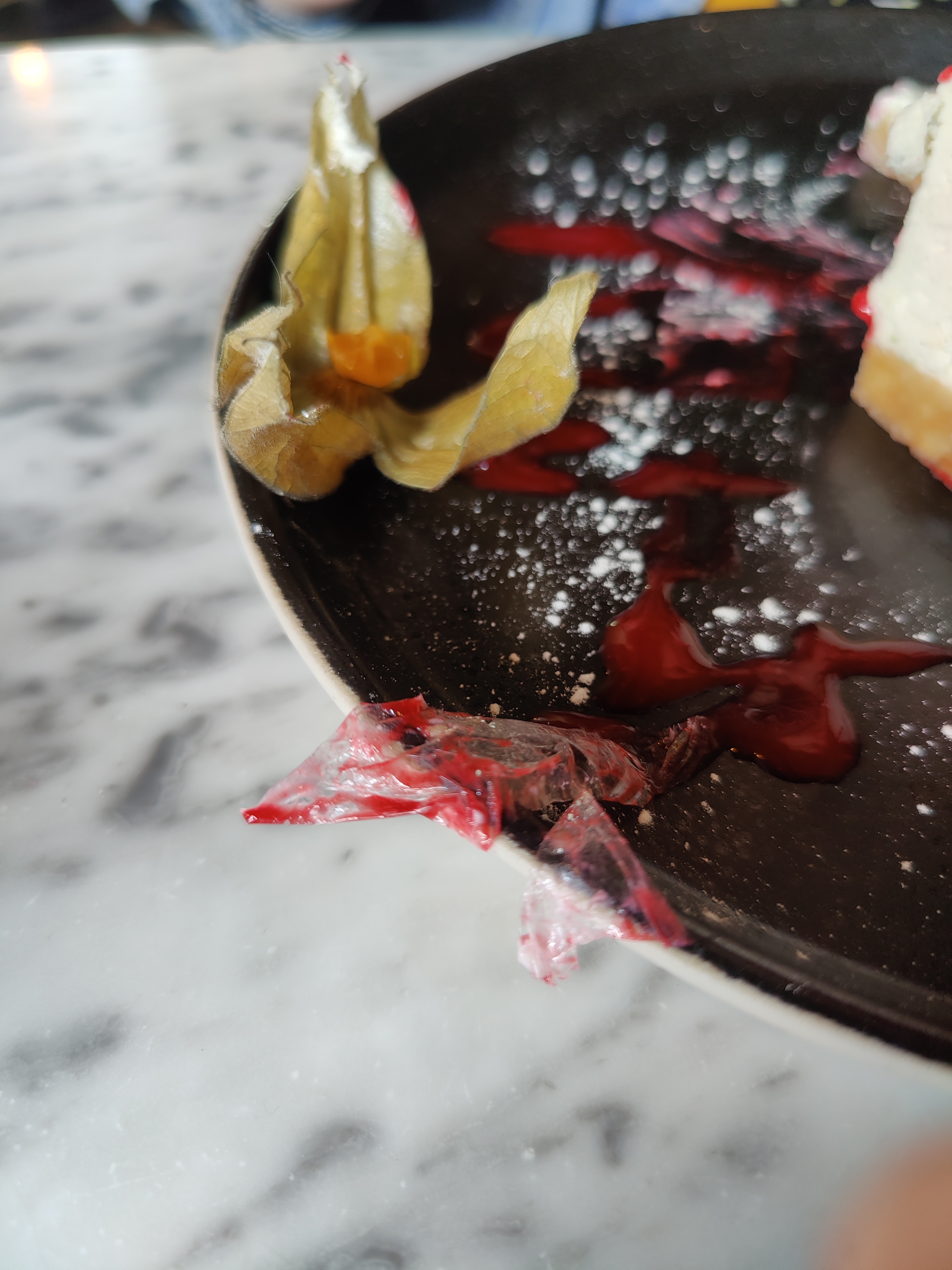 On a commandé 6 choses: Cocktail St Germain : très bien rien à redire. Sangria Maison: Vin rouge glacé. Je n'ai jamais goûté une sangria comme ça de ma vie. Gin tonic: commandé trois fois et jamais reçu du repas. Burger: très bien. Encore mieux si j'avais reçu le ketchup demandé deux fois. Foie gras: aucun goût. Remballé deux fois (la première fois le serveur ne nous est jamais revenu) Cheesecake: morceau de plastique sous le gâteau. Il faut enlever le film de vos produits que vous achetez déjà préparé. Excuses bien reçues du manager mais malheureusement c'est assez choquant de voir ça dans un restaurant.