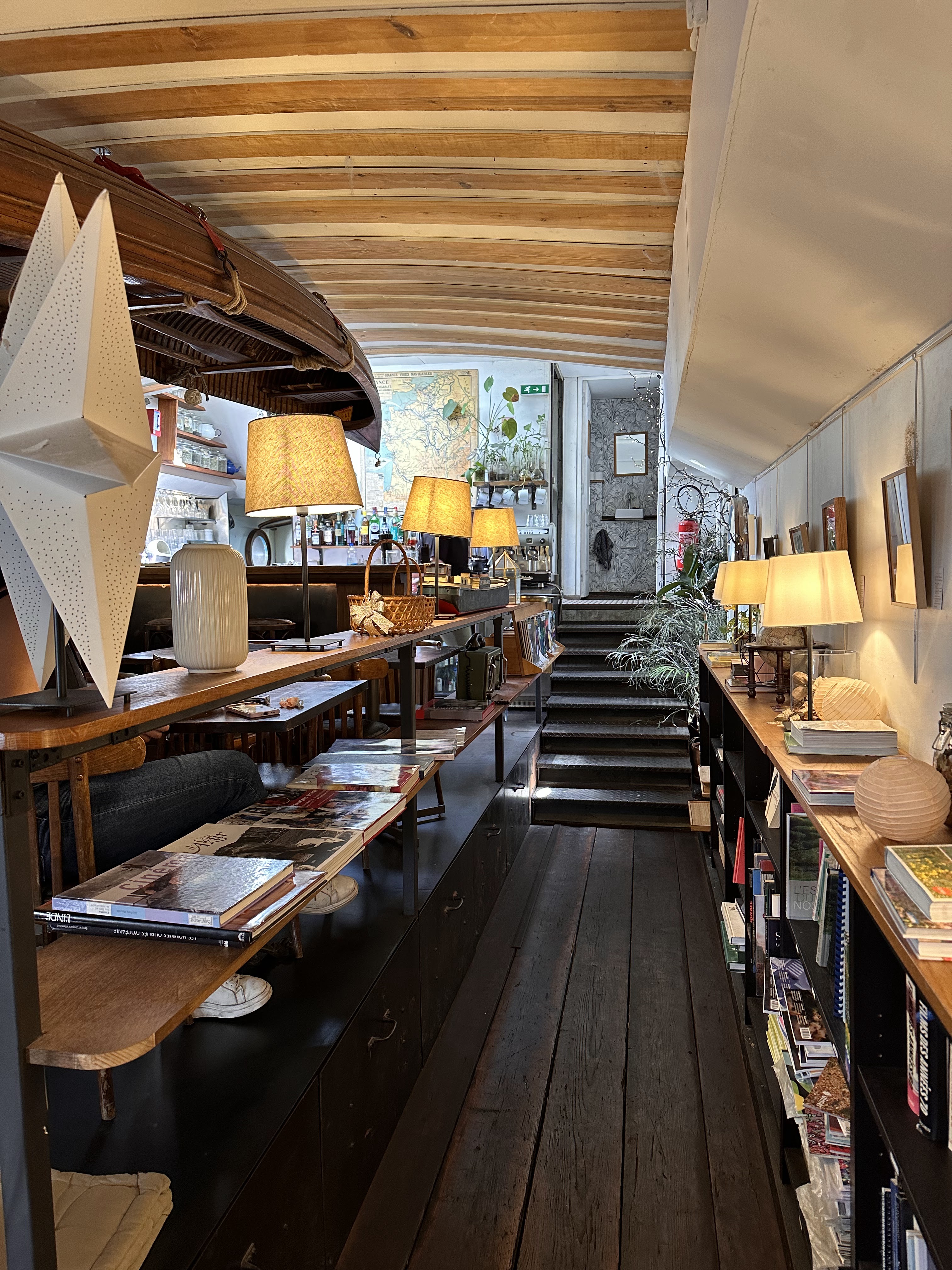 Une péniche-librairie-restaurant, quel joli concept ! Fond spécialisé en livres sur les plantes et la nature, très beau cadre, le brunch le dimanche est délicieux !