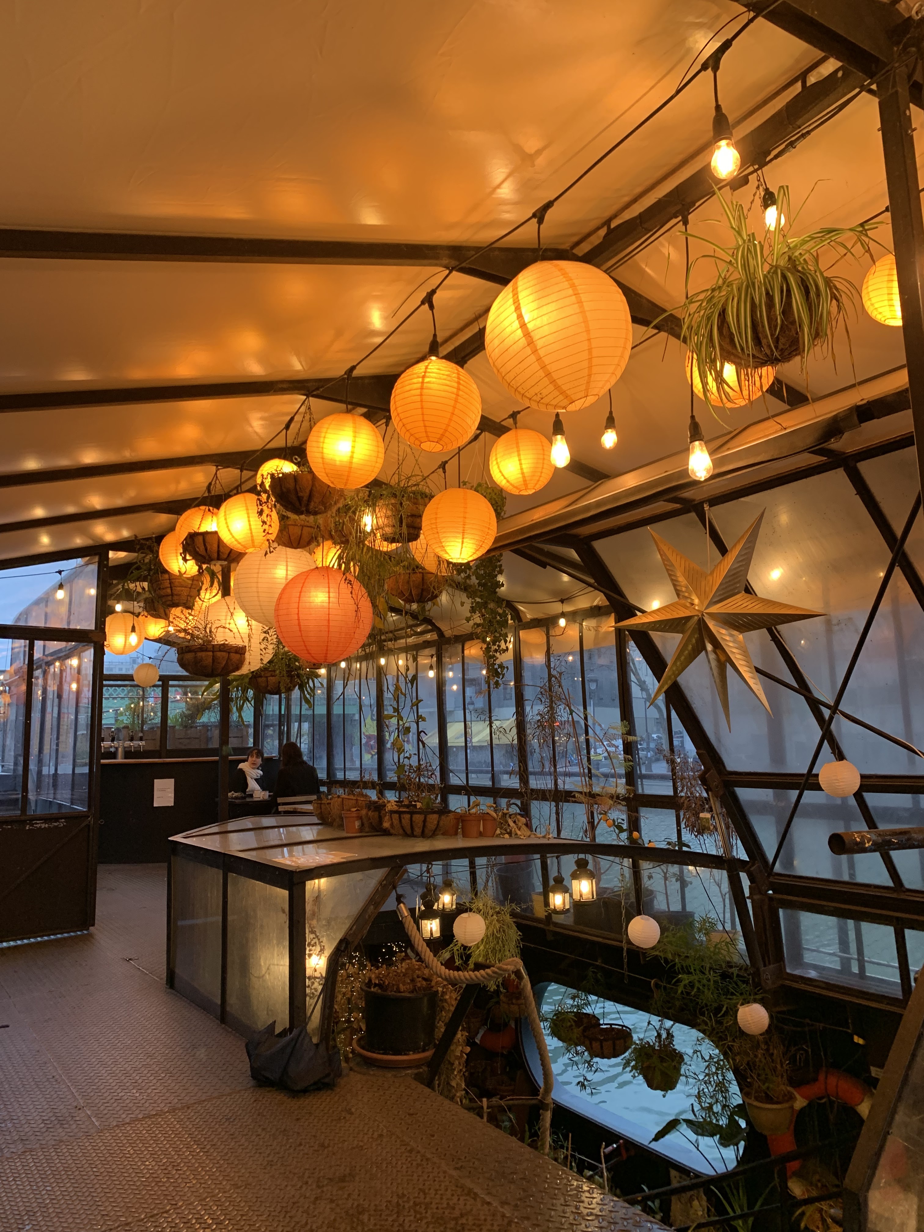 Très agréable sur le canal, beaucoup de plantes et très jolie décoration, surtout au bar en bas, bibliothèque remplie de livres sur les plantes, très bon cheese cake et thé glacé sur la terrasse de la péniche, belle vue sur le canal, staff super