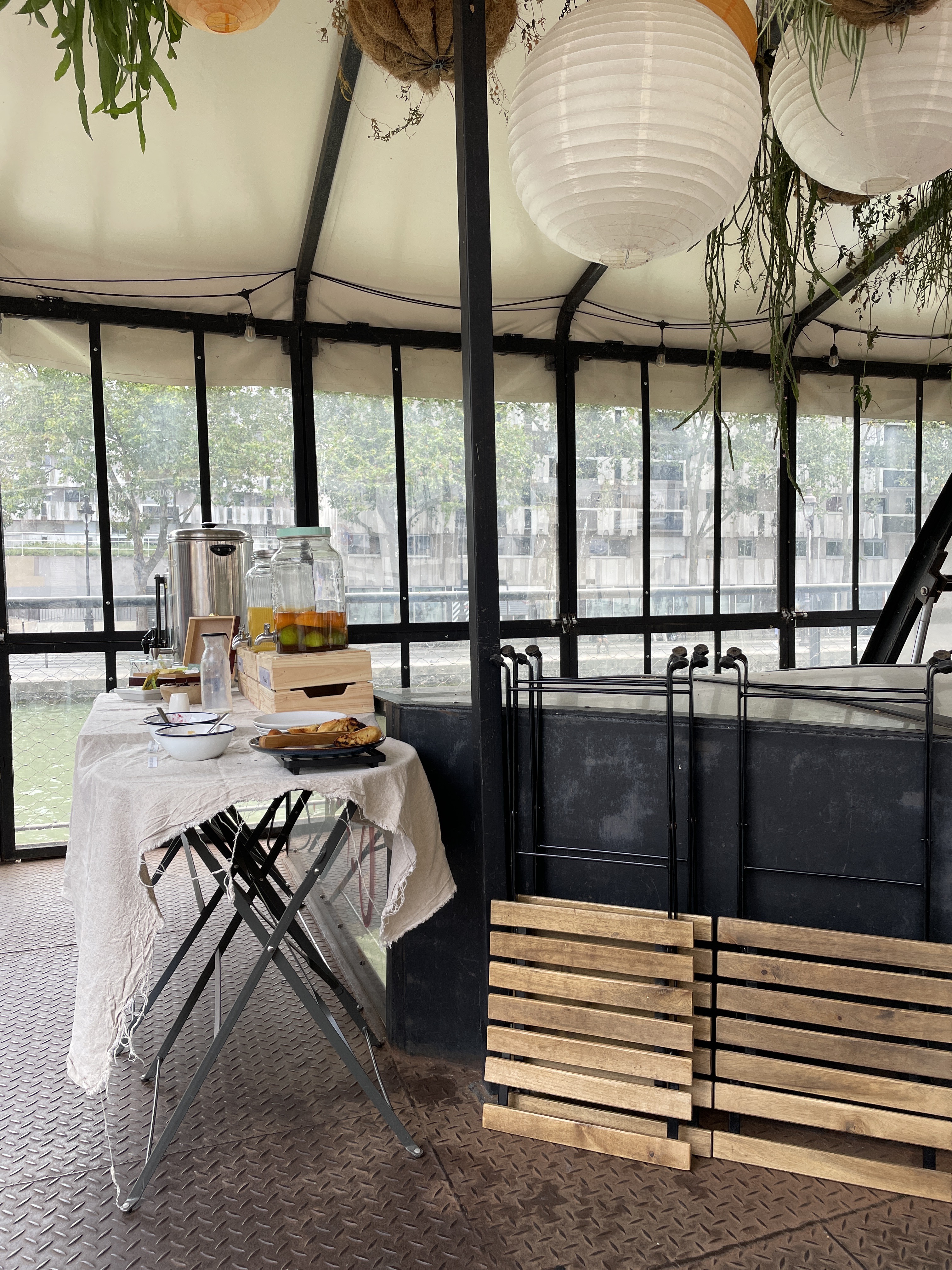 Un brunch sur l’eau le week-end, et un restaurant de poisson en semaine, uniquement le midi. Vous pouvez aussi privatiser cette péniche pour vos soirées. Une péniche avec un toit-terrasse abrité, idéal pour prendre un verre entre amis, par tous les temps. Et dans le corps de la péniche, une ambiance de grand salon plein de livres et de plantes, à la décoration et à l’ambiance chaleureuse. Merci pour votre accueil