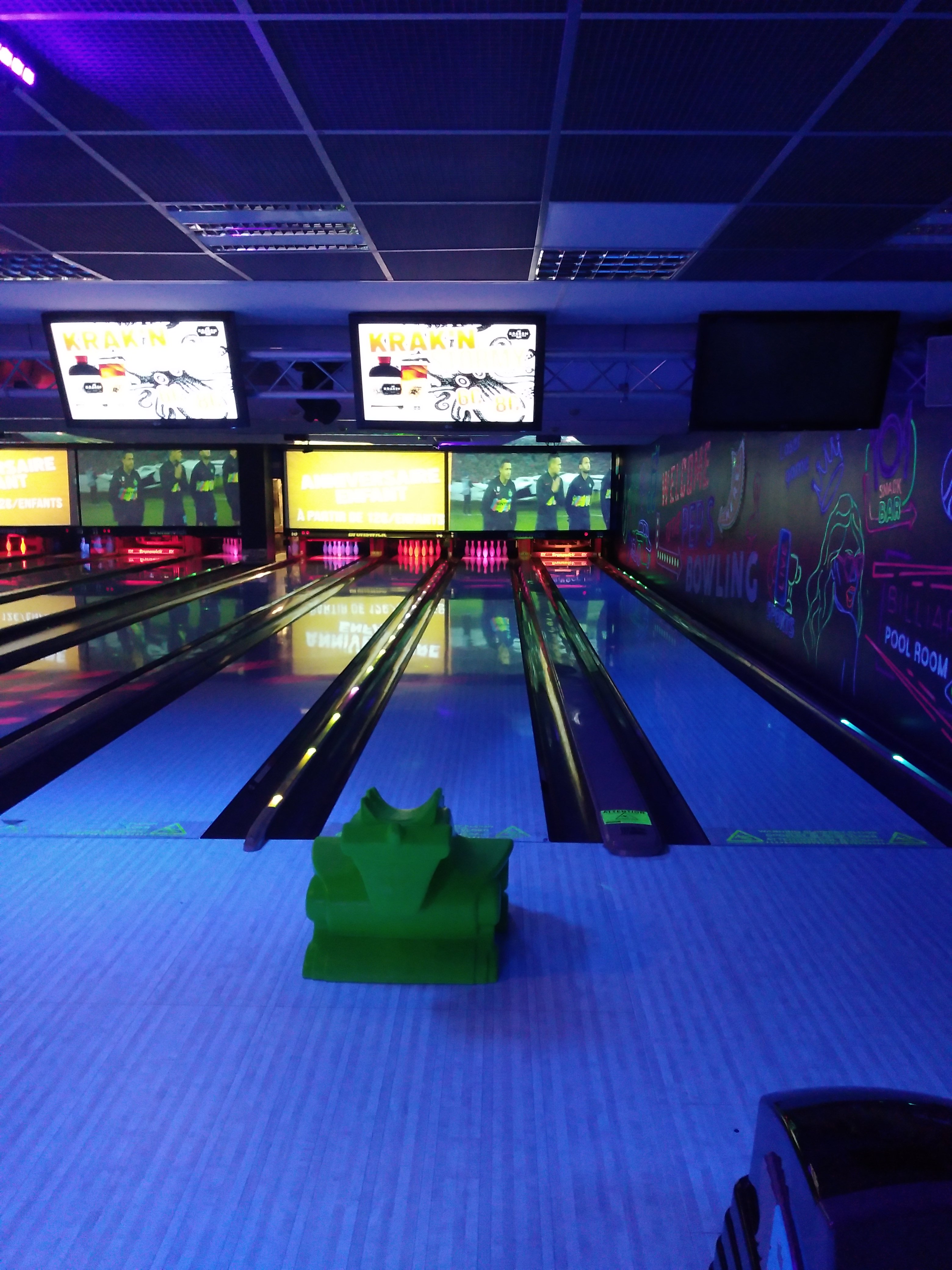 Excellent endroit avec une nouveauté des écrans de téles aux dessus des quilles