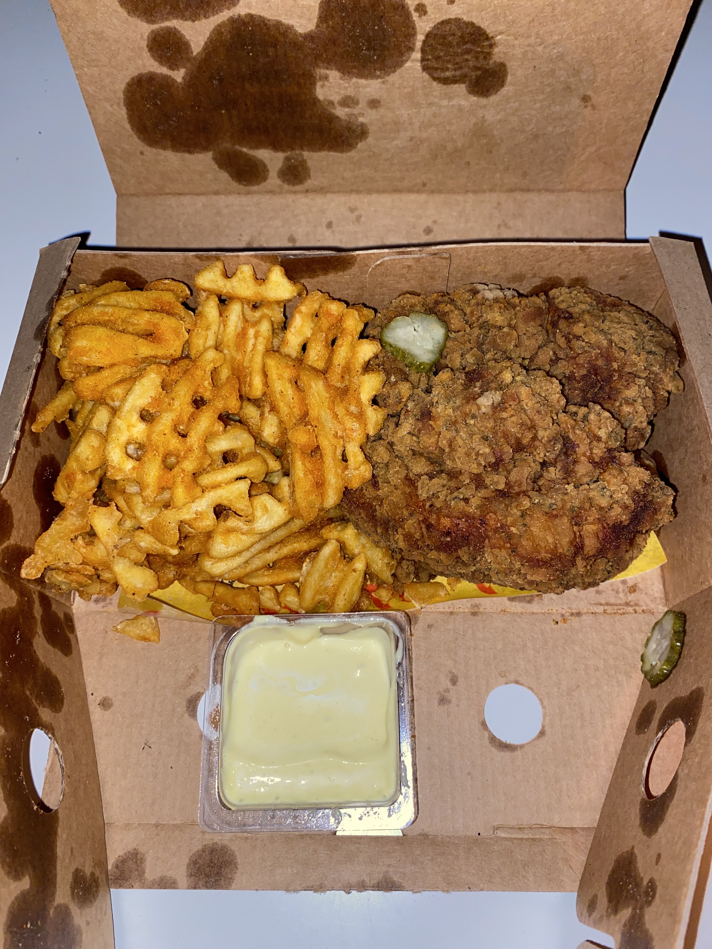 En fait c’est pas vraiment le poulet c’est plutôt la panure qui est super épaisse t’as l’impression de manger de la pâte avec un peu de poulet après les épices sont assez bonnes et pour ce qui est des frites ça va même si la cuisson pourrait être un peu plus élevée et la sauce verte qui est donnée avec Est bonne mais ça voudra pas une bonne sauce comme la crémé de luxe de McDo