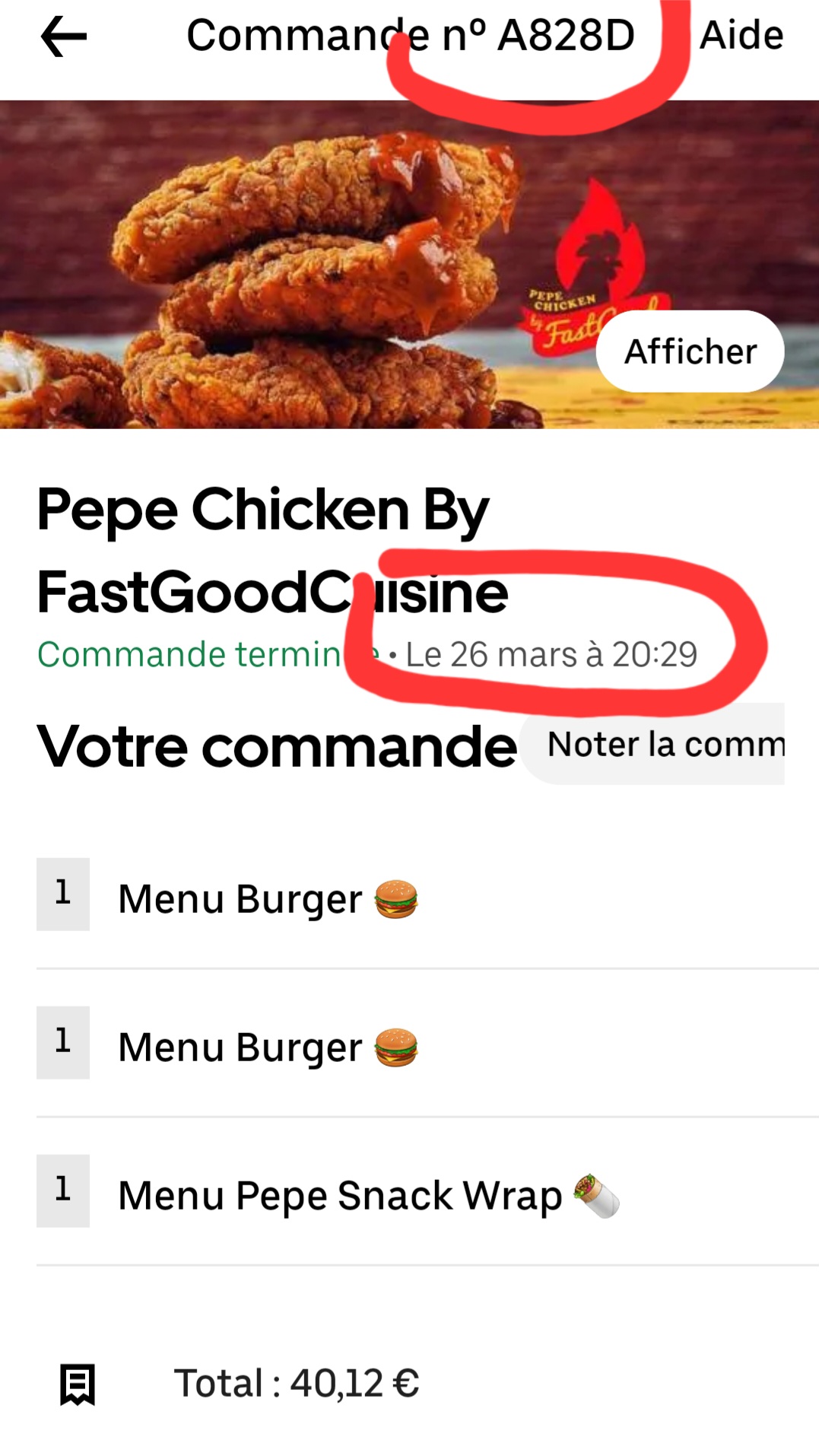 Nous avons commandé à 20h. 3 menus, livré 20min après au top ! Mais quelle surprise en voyant, 4 pauvres tenders se battrent en duel à la place de nos 3 menus. Uber eat, aucun numéro et aucunes réponses à nos réclamations sur la commande, commande à 40€ !! Et numéro de PepeChicken qui raccroche automatiquement. INJOIGNABLE. Honteux ! Impossible d'avoir quelqu'un. Nous avons demandé un remboursement, ... REFUSÉ !!! Alors qu'il ne s'agit ABSOLUMENT PAS de la bonne commande !! REFUSÉ !! Une honte ! Après 30min, et des photos largement suffisante pour prouver la légitimité de notre demande. Nous avons passé malgré tout une 2ème fois la même commande. Cette fois ci sans erreur. Mais 3h après toujours aucunes nouvelles de notre remboursement.