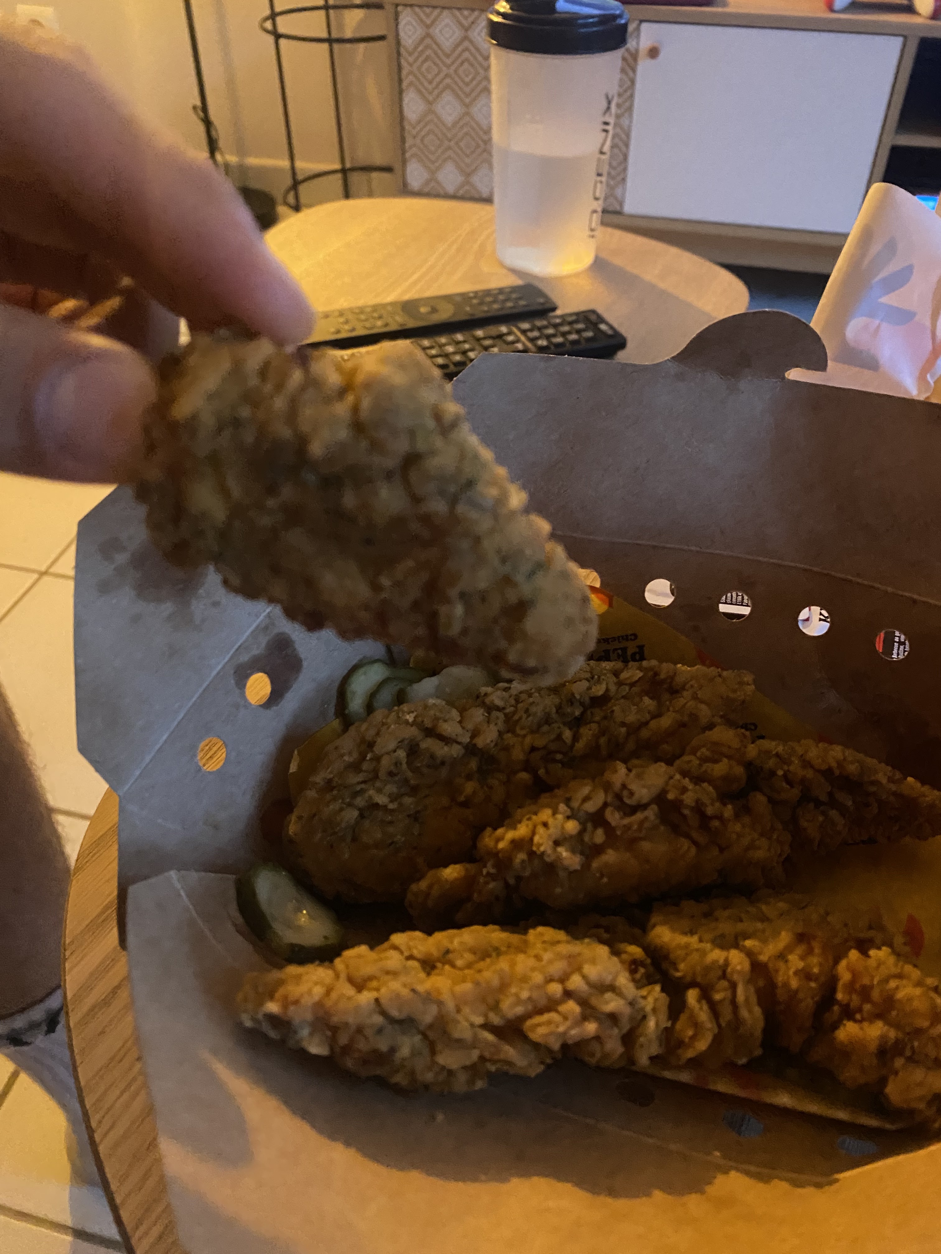 Après avoir récupéré notre commande, nous avons découvert que le Burger était en vrac mais super bon. Les tenders normalement doivent faire 320g, pas que je suis au gramme près, mais il y’en avait que 3 gros et 1 tout petit (je pense pas 320g) pour 11€ environ. Néanmoins le poulet est super bon !