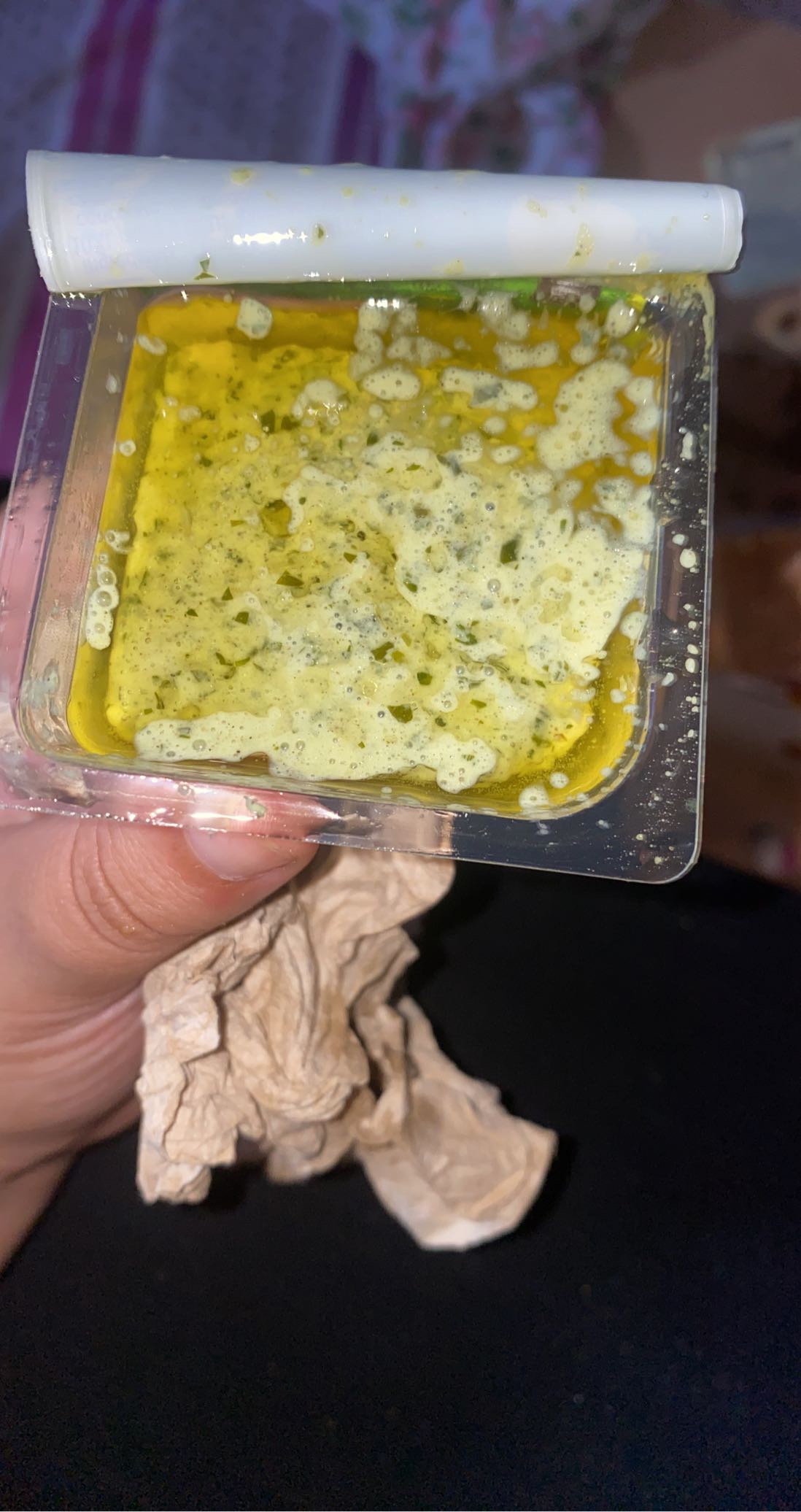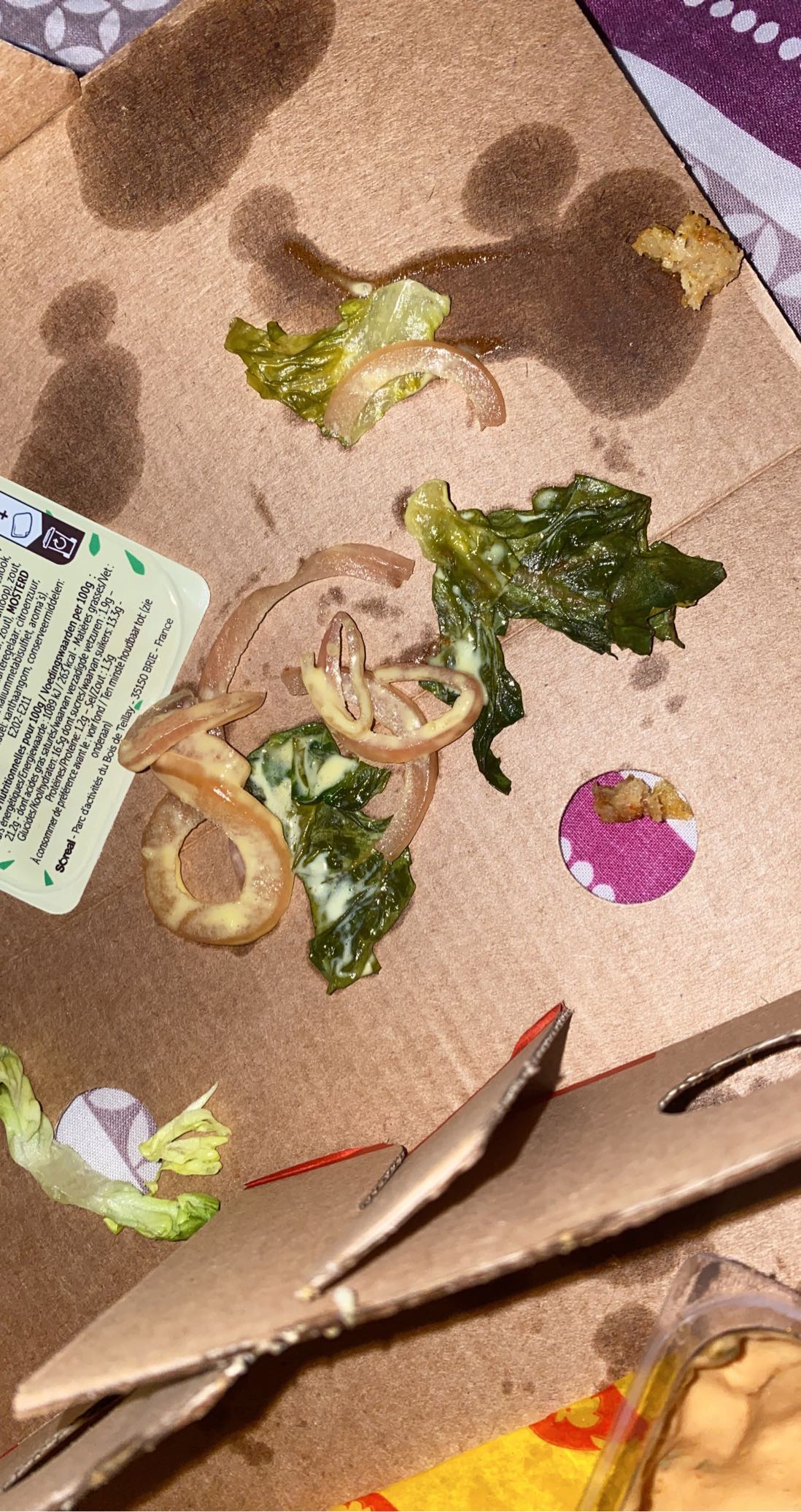 À fuir ! J’espère que c’est une blague vous allez me dire que la sauce est en bon état, sachant qu’avant de la prendre en photo je l’ai secoué. Elle est clairement périmé et la salade soi-disant devenue moue à cause de la chaleur du poulet vous me prenez vraiment pour une idiote assumer juste que vous avez mal fait votre travail.