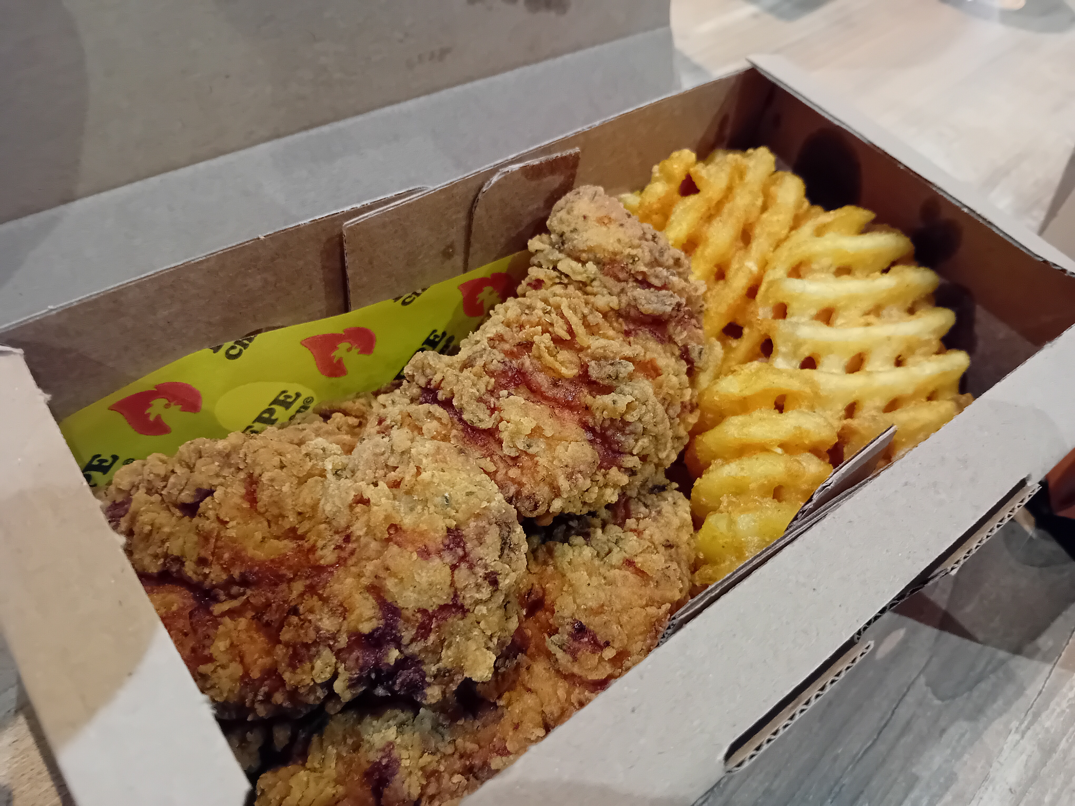J ai découvert pépé chicken par hasard , j ai commandé sur place via l application, le personnel super souriant, j ai pris un menu les waffles étaient croustillantes avec la sauce le poulet super bon ..... J ai adoré, a renouveler rapidement.😋