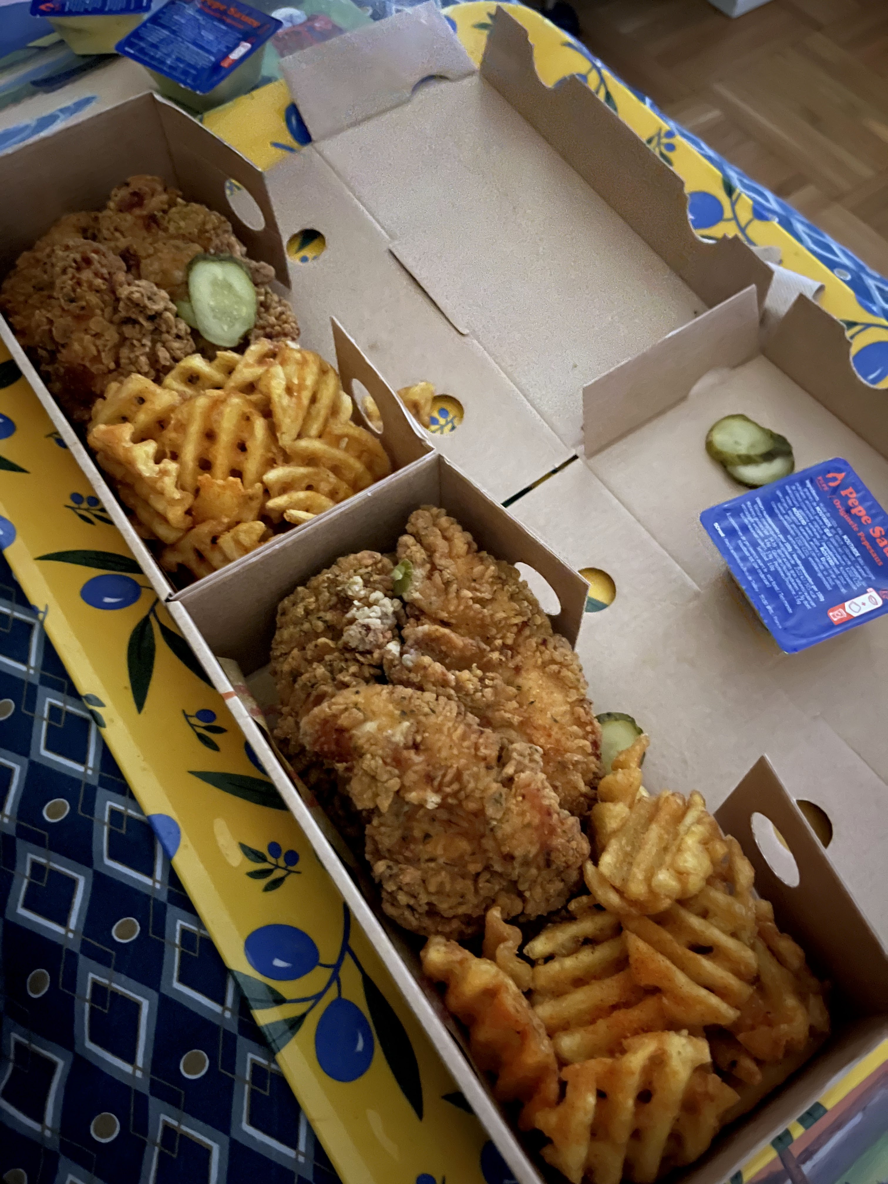C'est une dark kitchen, j'ai pris à emporter et je l ai mangé 5min après. Les tenders étaient donc encore bien chauds et croustillants. Une petite merveille ! Le poulet était tendre et juteux, les épices sont douces, la panure croustillante à souhait. Il n'y a que 4 morceaux mais c'est suffisant. La sauce pepe était pas mal et fonctionne bien avec les tenders. L accompagnement était bon mais je n ai pas été subjugué comme pour le poulet. A 15euros le menu j aurai bien aimé avoir une boisson avec. J'y retournerai volontiers!