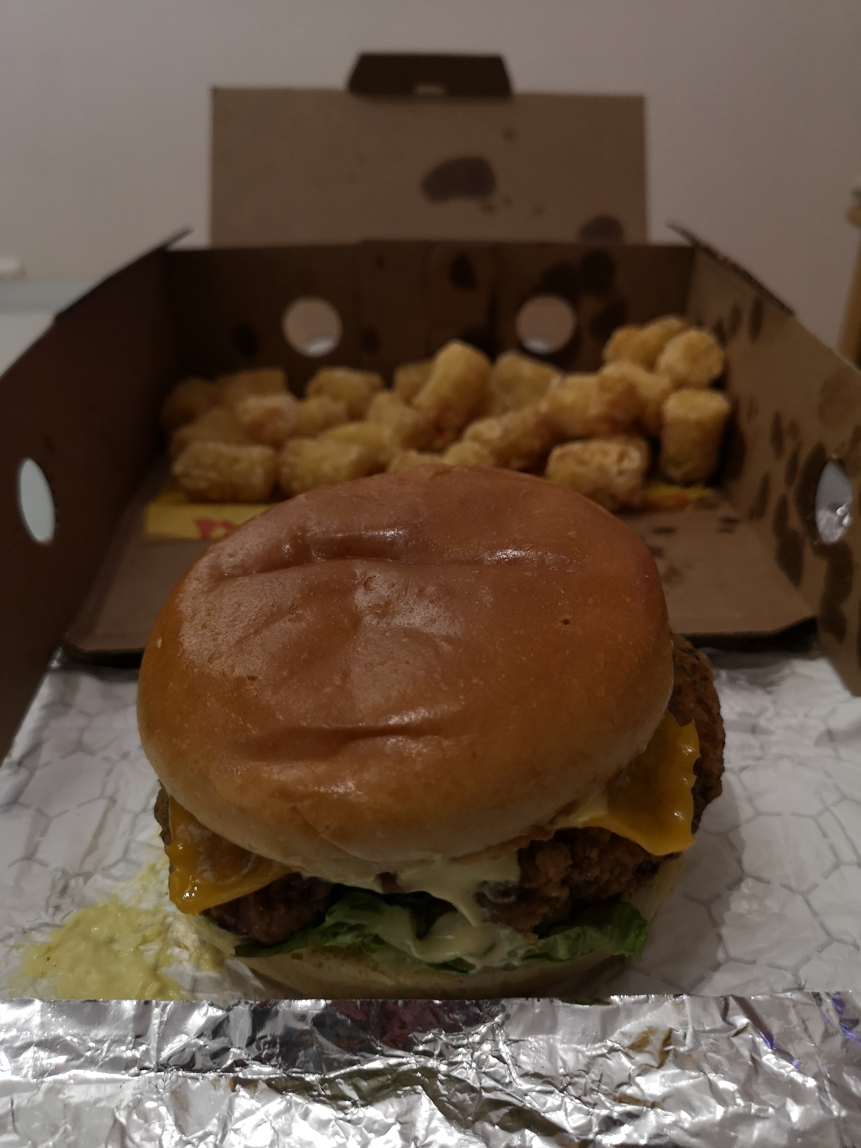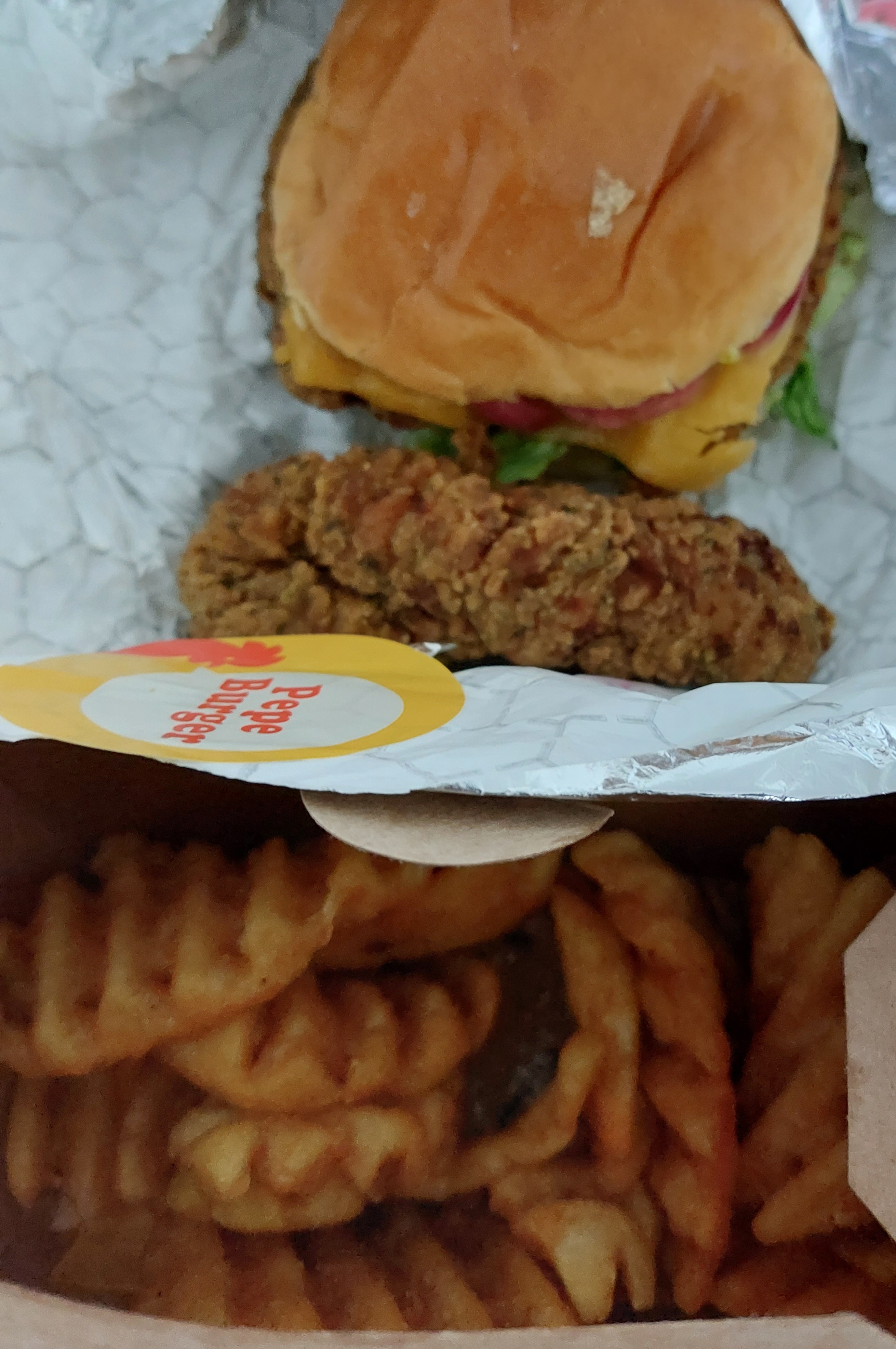 Première expérience après avoir vu un vlog sur YouTube. Franchement c’est pas mal du tout j’appréhendais un peu et finalement ça passe bien. Le burger est très bon et le poulet croustillant. On parle de la sauce pepe elle est ouf, la verte et moins ouf. Sinon le packaging est top top juste les frites molles mais livraison on comprends