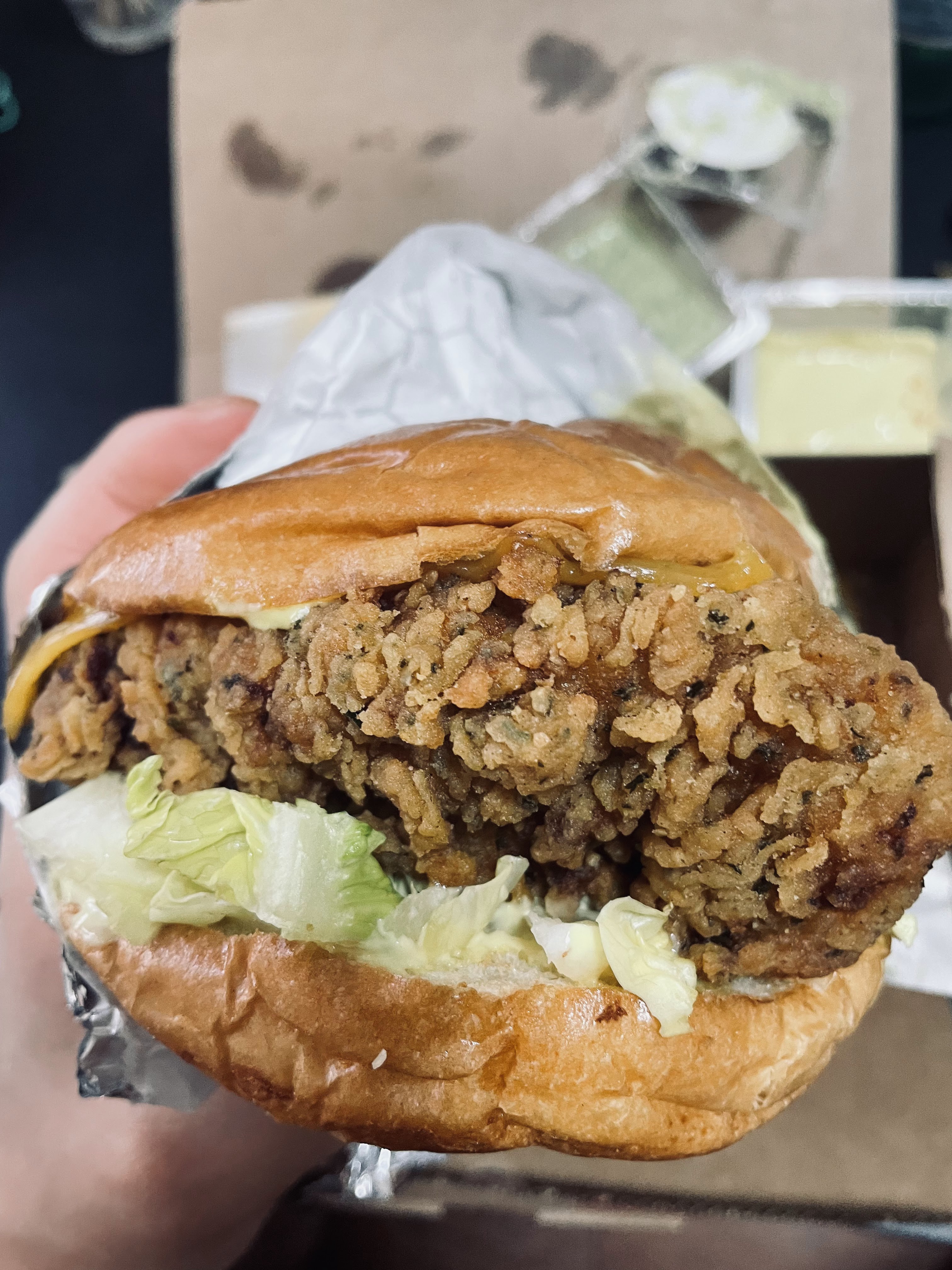 De loin le meilleur burger au poulet que j’ai mangé de ma vie. Les tenders sont ouf aussi! J’aurais préféré avoir de vraies frites de pomme de terre ou de patate douce mais ce qui est proposé est très bon quand même ! Le prix est un peu cher mais comme je suis beaucoup trop gourmande, je recommanderai 🤣