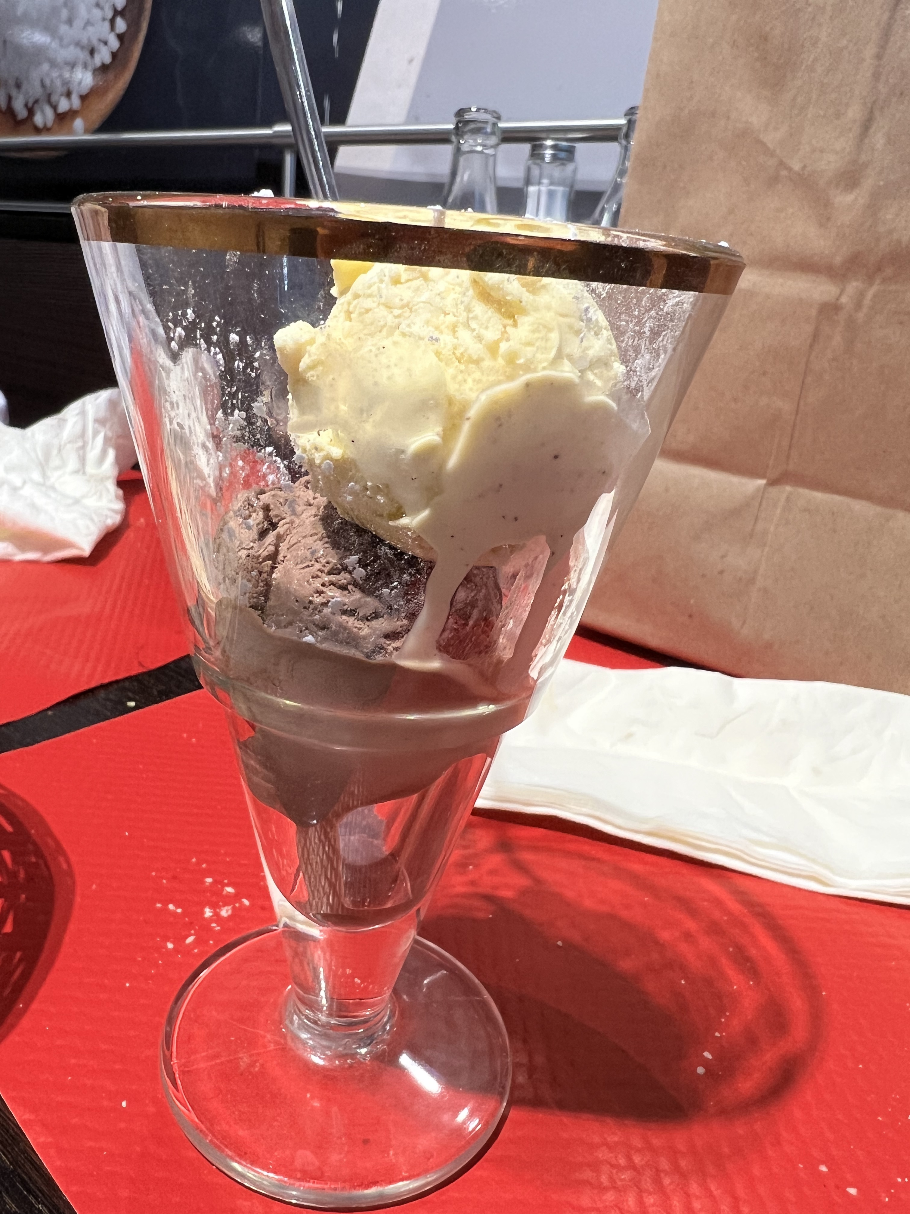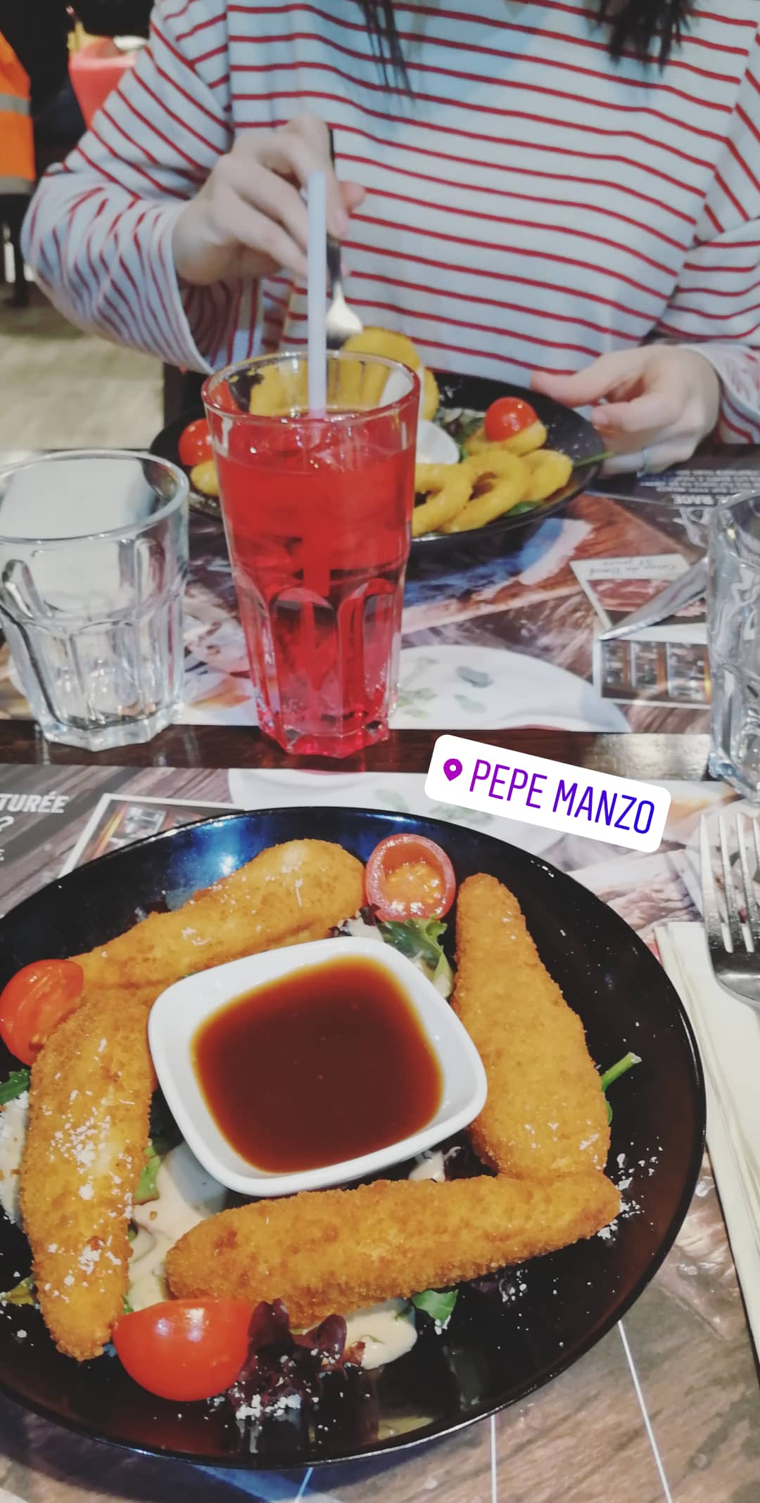 Je ne sais pas si la clime était activée, mais la température était très fraîche. Le rap fort dans les enceintes qui grésillent, c’est aussi désagréable. Les boissons qui arrivent en décalées. Mes amis ont le temps de manger la moitié de leur plat que le mien arrive enfin. Je demande les bricks chèvre sans miel, qui arrive avec du miel. Demande de parmesan à 2 répétitions, qui n’est jamais arrivé. Les escalopes sont sèches. Moment pas très agréable qui ne reflète pas l’image de Pepe Manzo que je me suis faites dans d’autres villes.