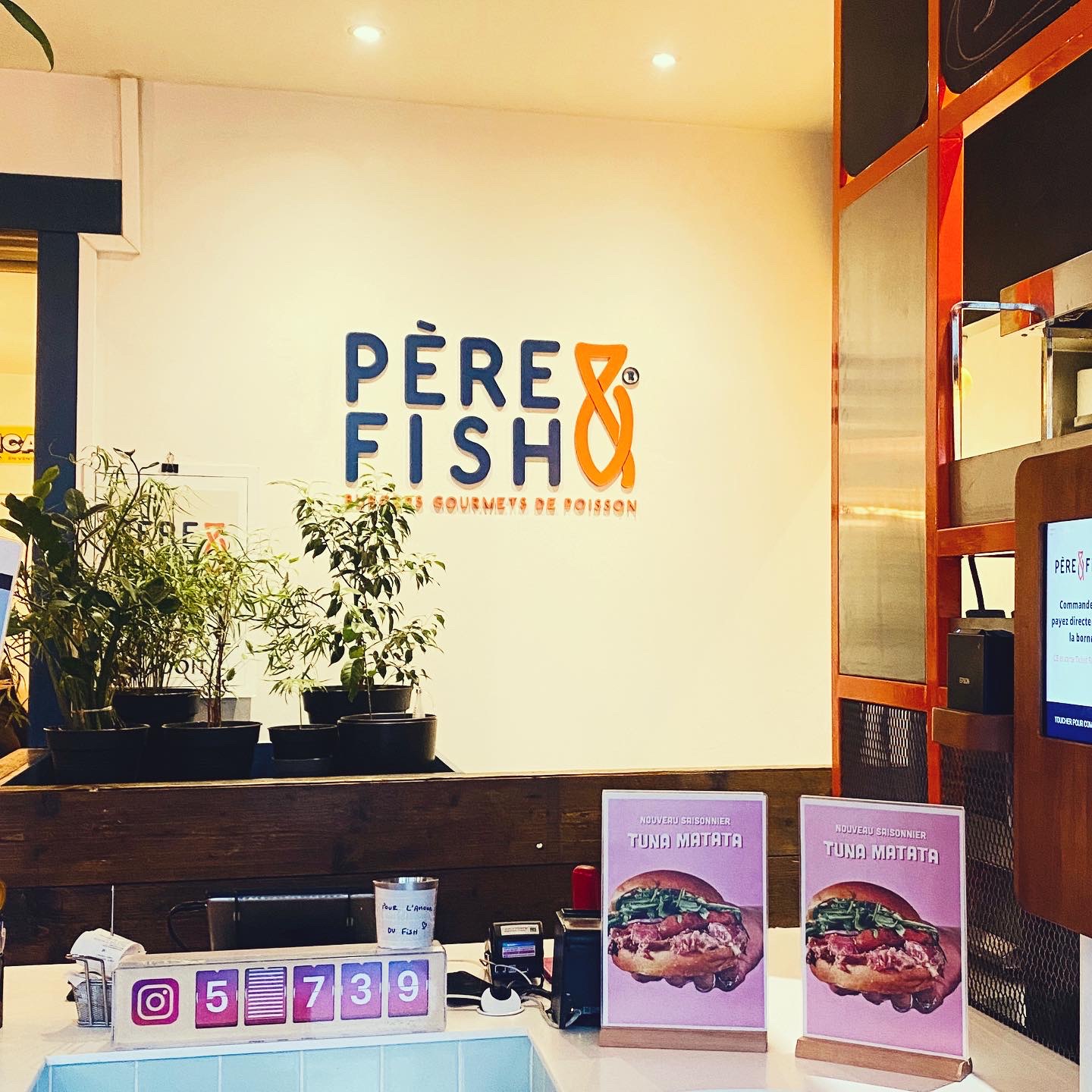 Je voulais venir goûter depuis très longtemps (avant le Covid, avant l'inflation) mais j'avais toujours eu la flemme (et puis je n'habite pas à côté, je suis de Montrouge). Ce mercredi matin, je décide enfin d'y aller pour le service de midi. Arrivé sur place il y avait pas mal de monde, sans parler des commandes des clients via les livraisons, j'ai attendu presque 14 ou 16 minutes avant d'être servi, c'est plutôt long mais je peux le comprendre au vu du nombre de clients à servir. Quand je me suis assis à une des tables pour 2 personnes, ma chaise n'était pas stable (je pense que vous connaissez le problème, il faudra la changer un moment ou à un autre), du coup je me suis assis à côté avec une chaise stable. J'ai commandé sur la borne mais je n'ai pas trop compris comment créer un compte chez Père & Fish, d'autant plus qu'après avoir validé la commande, sur la borne ça nous demandait notre numéro de téléphone pour des points (de fidélité?) mais idem je n'ai pas compris, j'ai mis mon numéro mais aucune idée si ça a été validé. J'ai commandé sur place un menu burger l'Ecossais avec frites, Coca zéro et un burger en plus (le Spicy). La canette de Coca zéro indique Coca sans sucres et honnêtement ce n'était pas du tout le goût d'un Coca zéro mais plutôt du Coca light, mais bon vous n'y êtes pour rien car les Coca Cola selon les provenances n'ont jamais le même goût mais en tout cas je n'ai pas reconnu le goût d'un Coca zéro. Les burgers l'Ecossais et le Spicy sont arrivés froids (pour les pains) mais l'intérieur c'était ok, et les frites sont arrivées trop chaudes, comme certains commentaires le disaient, vous devriez toaster les pains un peu plus longtemps, ou alors je n'ai pas eu de chance aujourd'hui à cause du monde et j'ai eu du pain de burgers qui ont tardé à être sorti, mais malgré tout c'était très bon (même froid), que ce soit l'Ecossais ou le Spicy, les frites maisons sont bonnes mais rien de spécial niveau goût par rapport à la concurrence. Je reviendrai un autre jour pour tester les autres burgers et les sides. Pas déçu du goût des burgers et de la qualité des poissons dedans, un peu déçu que les pains burgers étaient arrivés froids, que la canette de Coca zéro soit marqué Coca sans sucres et que ça n'a pas le goût d'un vrai Coca zéro. La longue attente je peux le comprendre au vu du nombre de clients à gérer, la création d'un compte Père & Fish ou les points gagnés en donnant notre numéro de téléphone devraient être expliqués car je n'ai pas trouvé l'information pour la création du compte. Et un peu déçu aussi qu'il y avait pas un des trois fondateurs de Père & Fish en y allant, mais là je chipote. Malgré tout j'ai bien aimé.