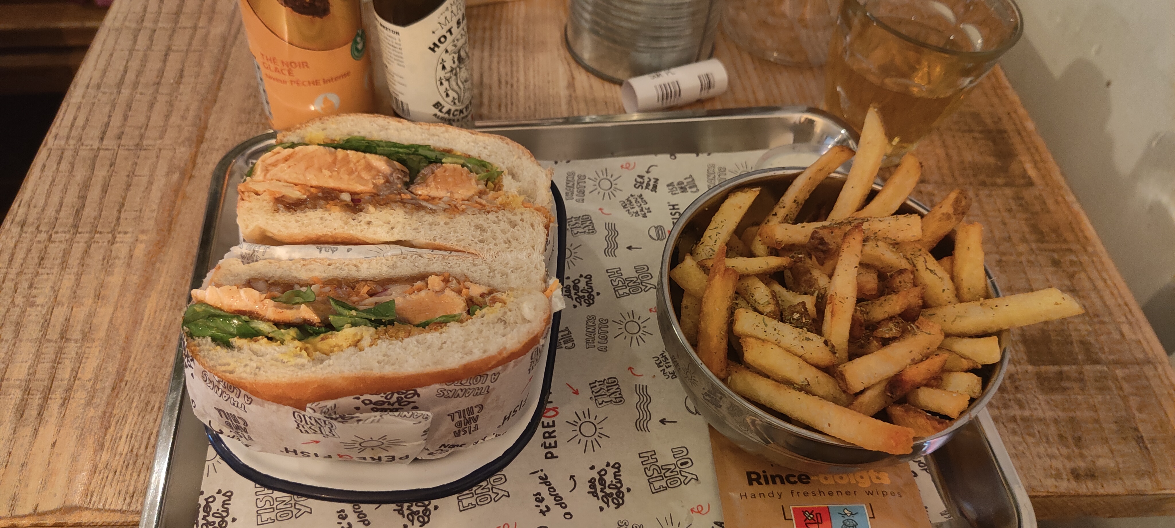 Super moment chez Père & fish, le service était très sympa et ultra rapide! Les gambas au panko hyper croustillantes et les burger super bons! La cuisson du saumon etait parfaite, les garnitures bien assaisonnées avec un petit twist d’originalité La portion de frite généreuse… un sans faute! Il manquerait juste d’enrichir un peu la carte des desserts pour les becs sucrés comme moi qui aiment finir sur une touche de gourmandise 😁