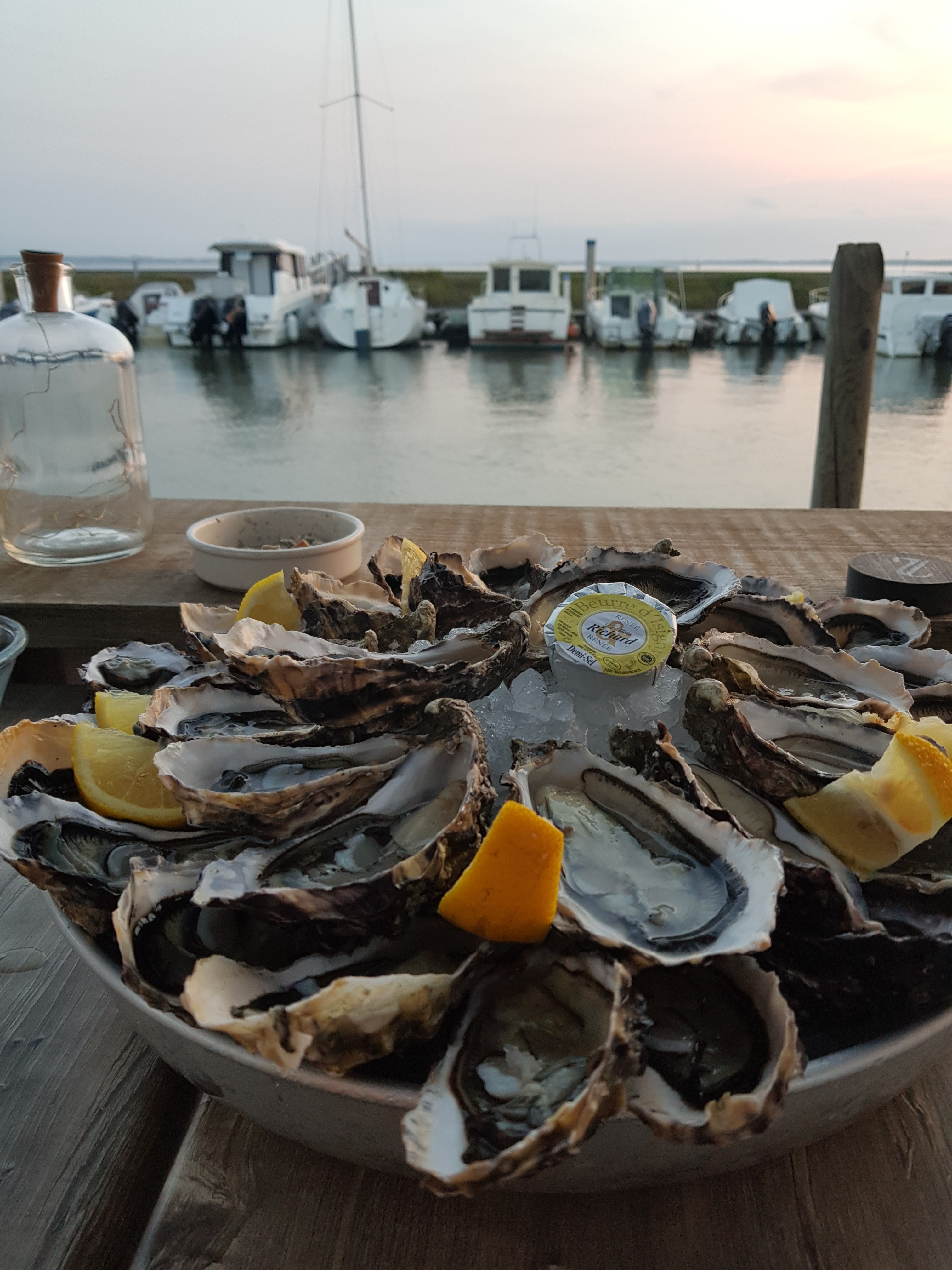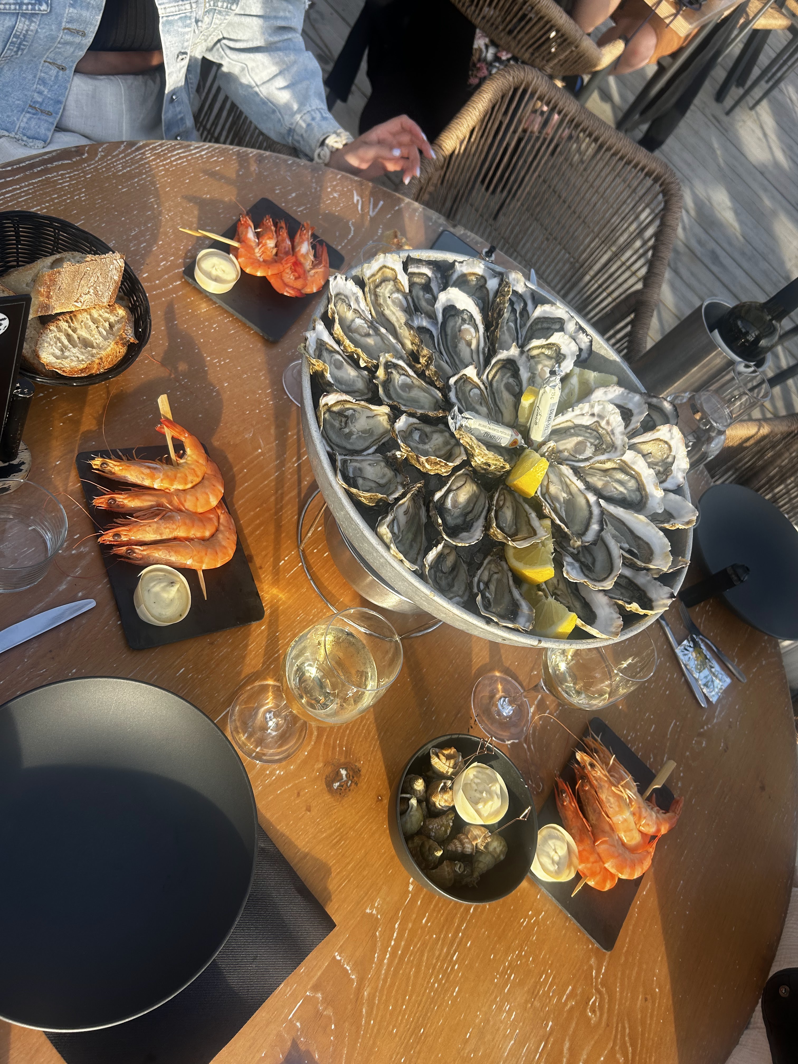 Délicieux moment, dégustation d’huîtres fraîches, crevettes, bulots dans un endroit décoré avec goût devant un cadre splendide avec coucher de soleil vue sur le bassin d’Arcachon.