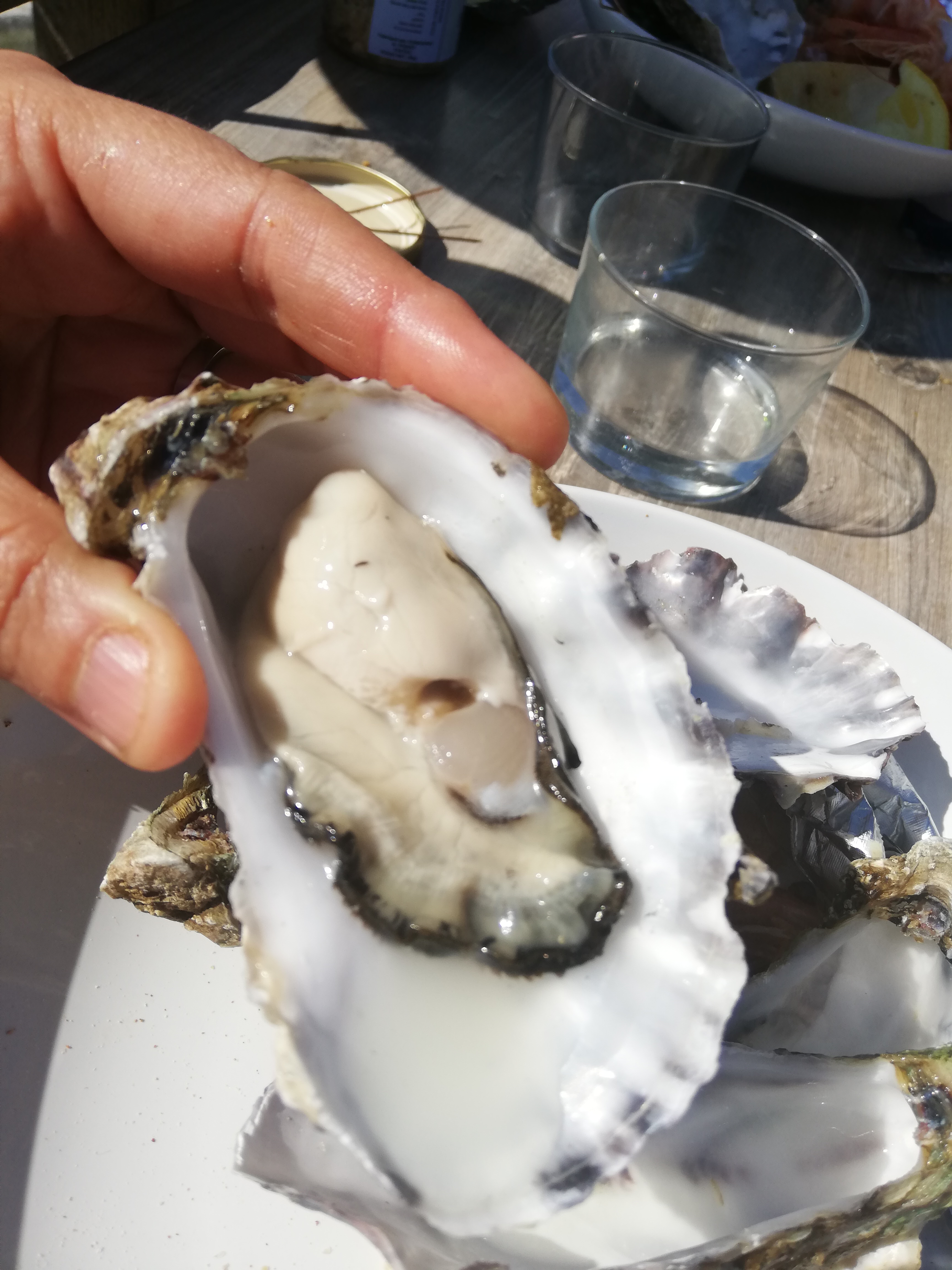 Une dégustation d'excellentes huîtres parfaitement ouvertes, accompagnées de bons pain frais, beurre salé et vin blanc fruité. Le tout servi par Pauline au sourire omniprésent : que demander de plus ?