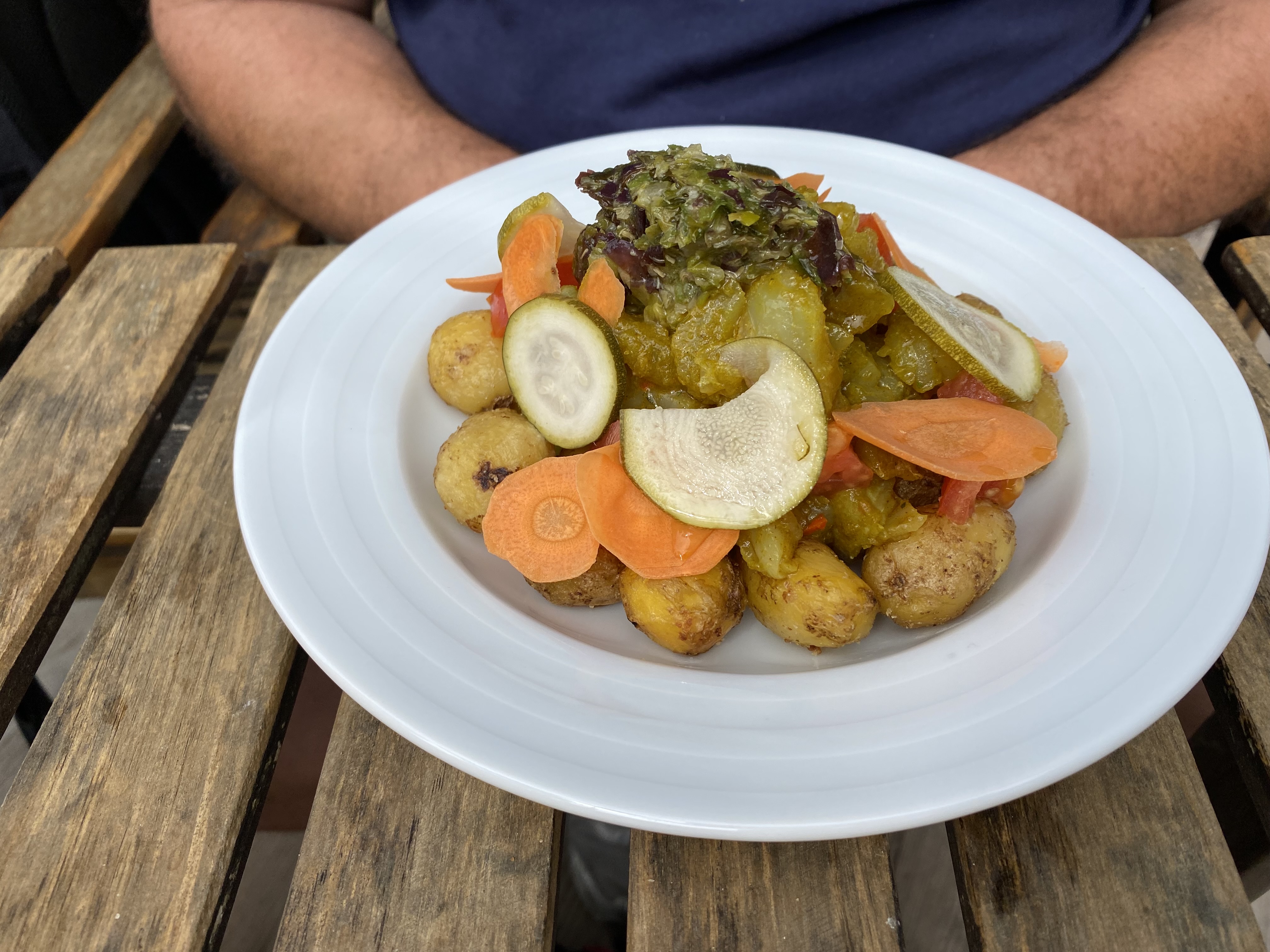 Un peu de marche pour trouver ce bel endroit mais ça vaut le coup, croyez moi ! Vue sur mer, terrasse au calme, un peu de musique chill, c’est le top ! Et la restauration…Bière IPA locale, très bon vin et plats de mer excellent. On se croirait à l’île de Batz