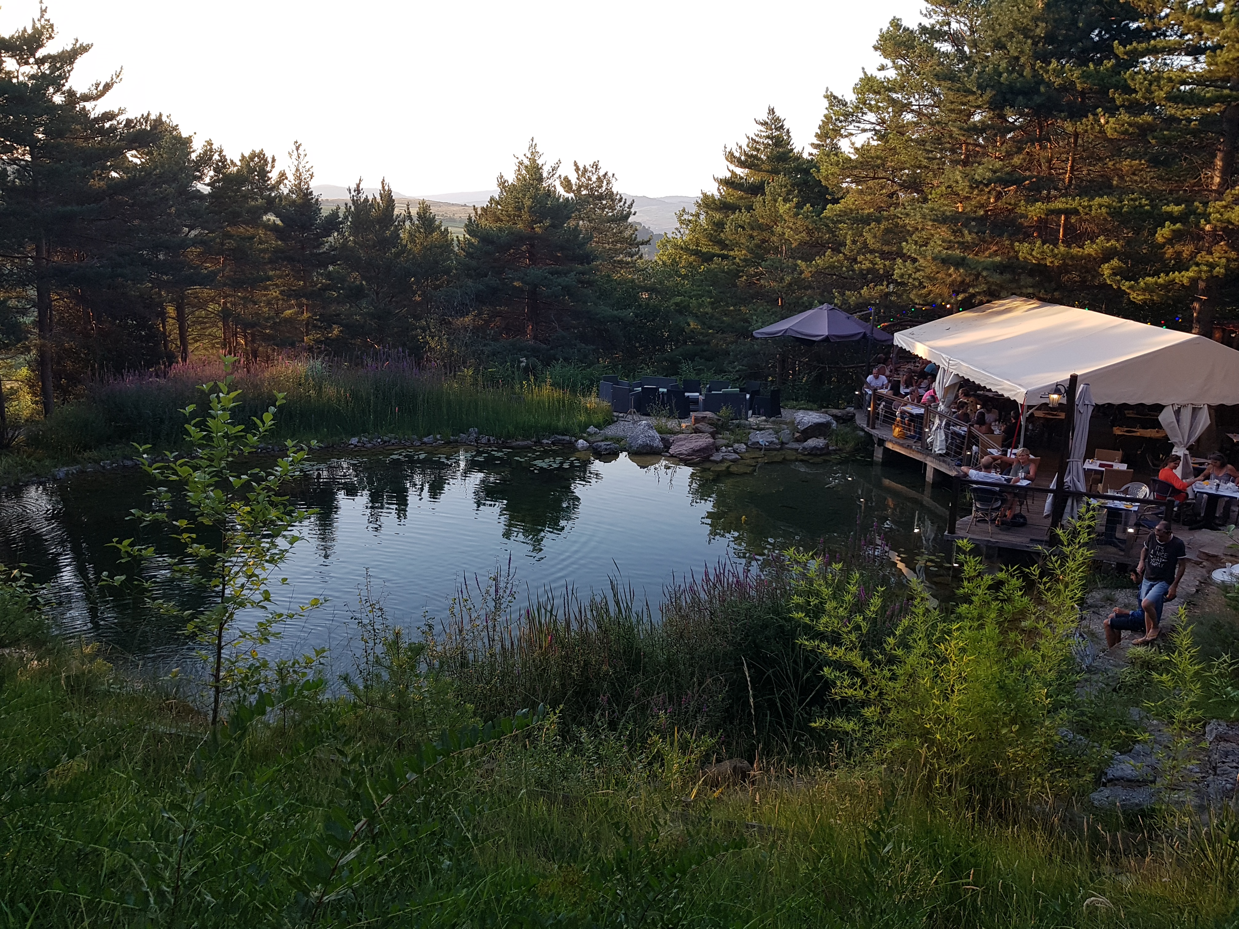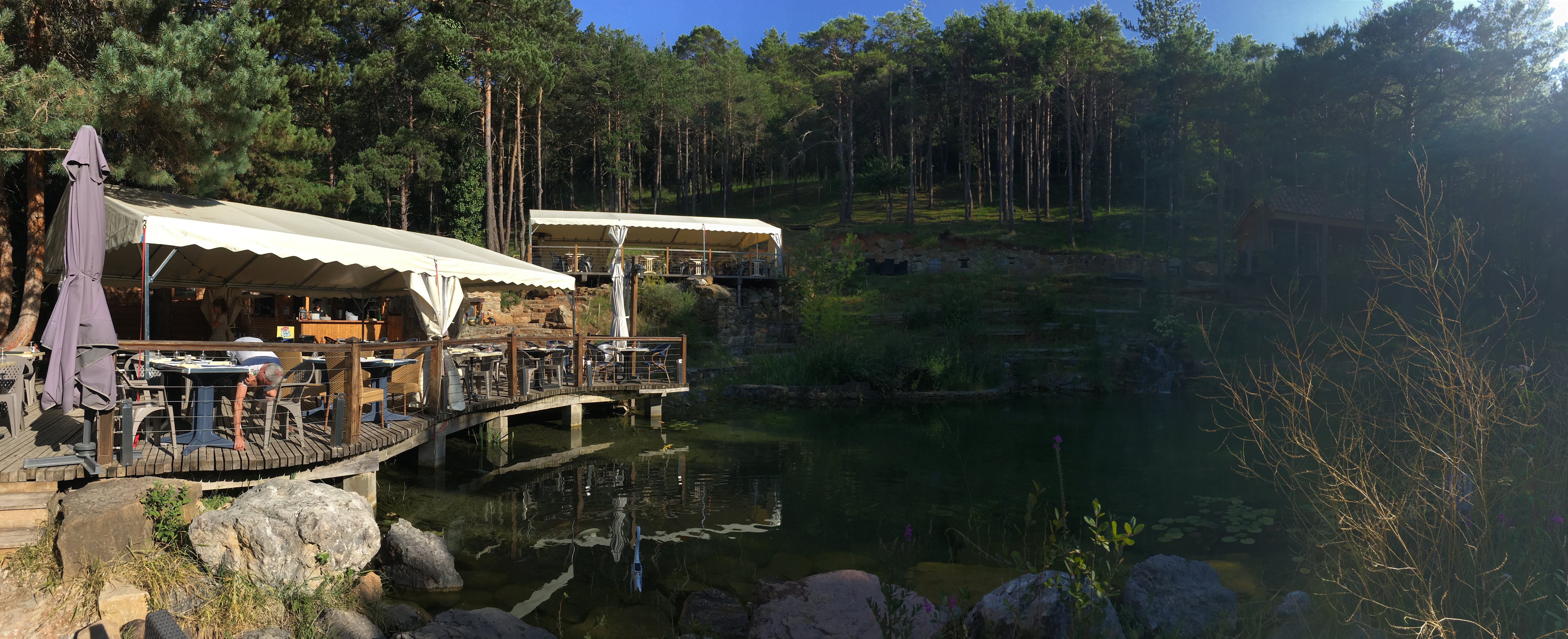 Mon fils et moi avons découvert ce magnifique endroit, au cœur de la nature, aménagé de belle façon, en gradins, autour d'une charmante mare soulignée de lampions. Vous serez séduits par son accent minéral qui assume, de jolie manière, le lien entre les origines et le présent. L'accueil et la cuisine y sont bons. Cependant, l'accès à ce restaurant se mérite, obligeant à emprunter une voie carrossable caillouteuse et pentue menant à un parking aux emplacements comptés.