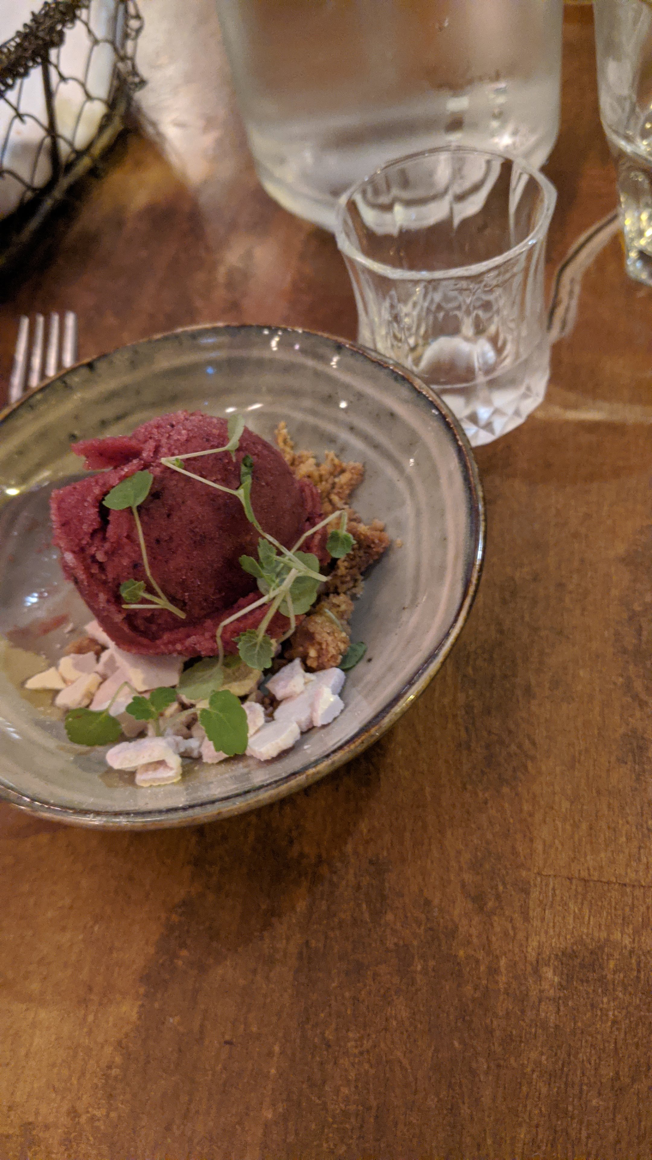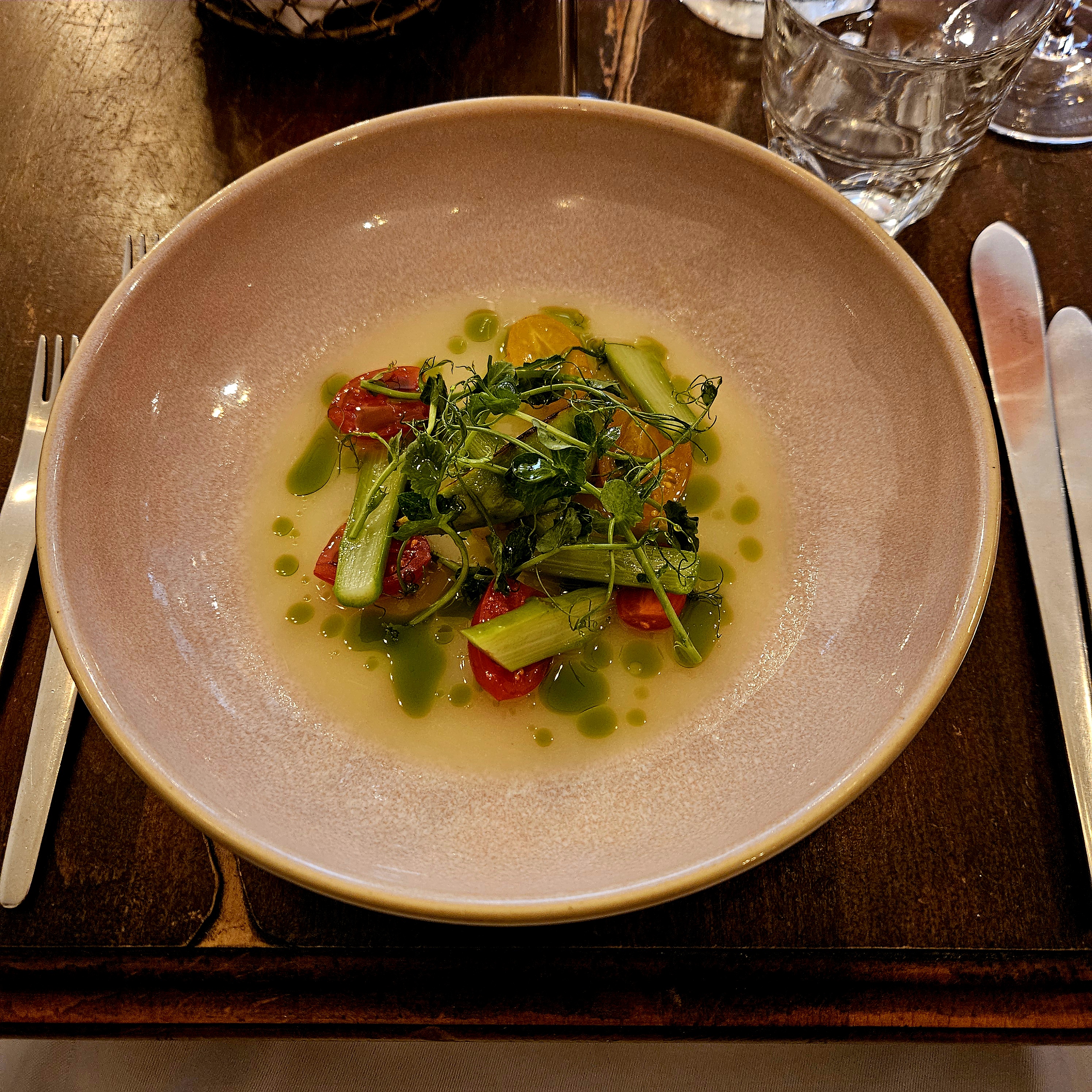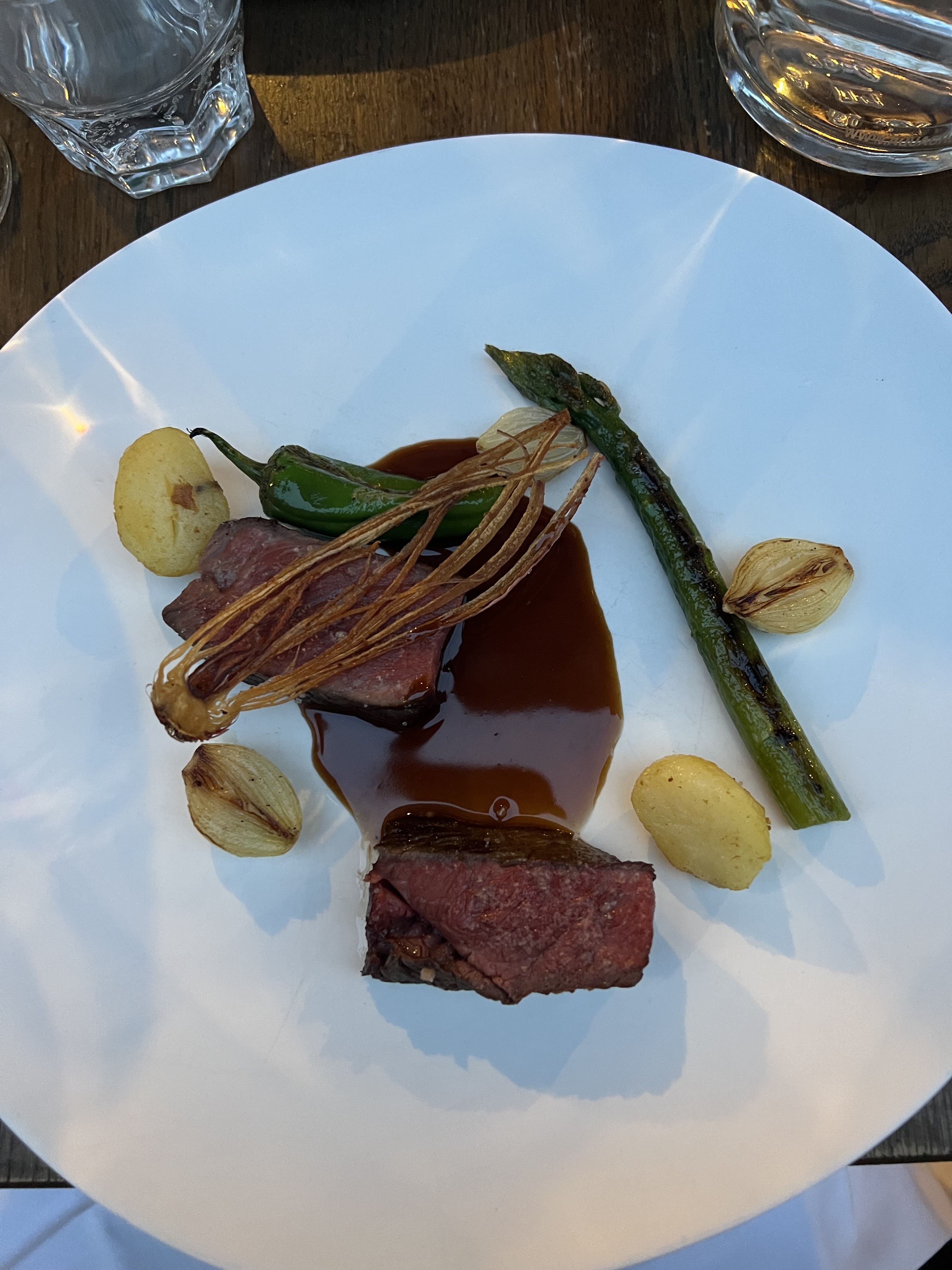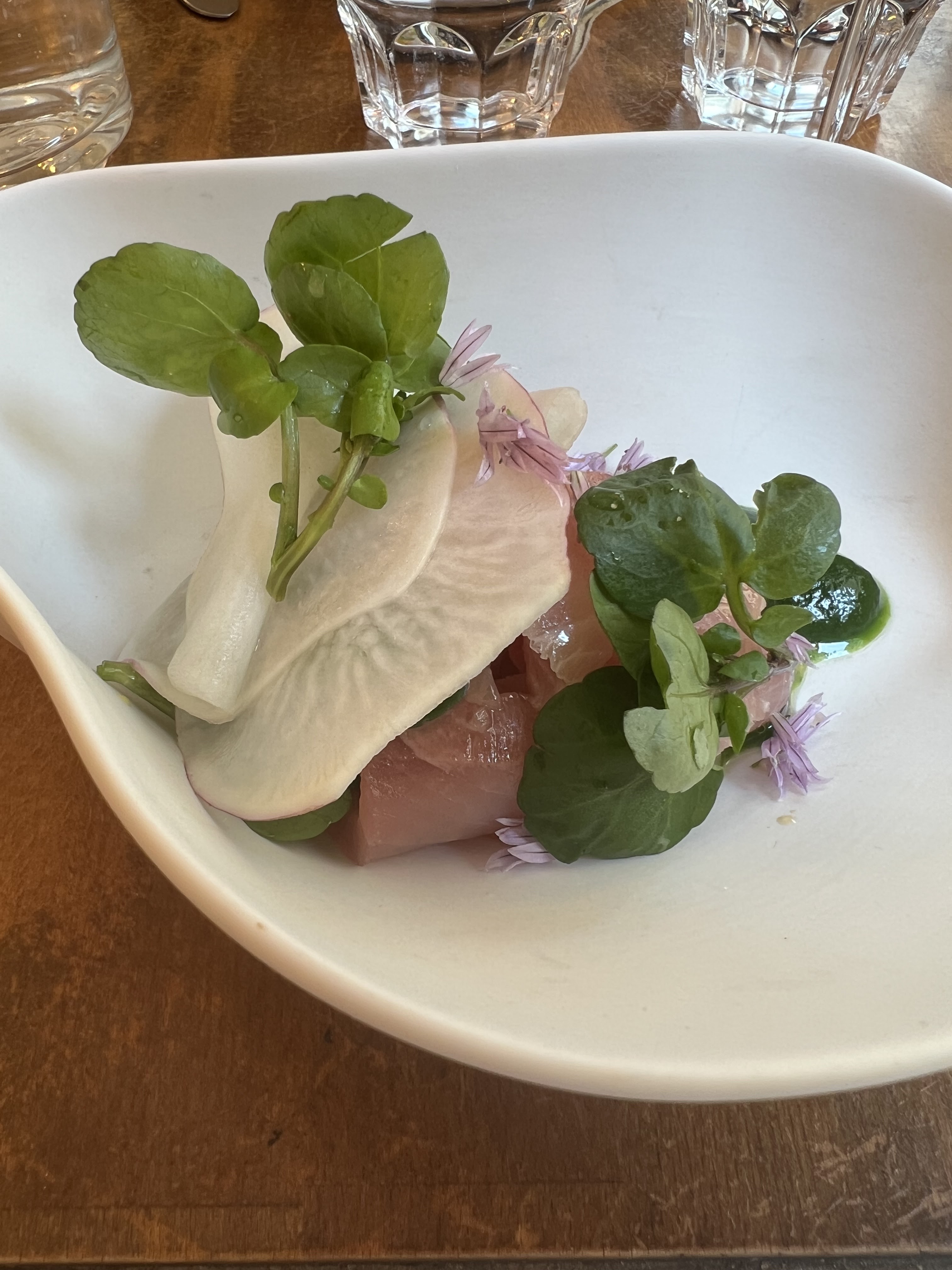 Des plats propres et bien exécuté. Quelques bonne surprises dans le choix des légumes et herbes qui agrément les plats. Parfois les sauces auraient pu être un plus généreuse et les assaisonnements un peu plus horse mais c’est un dîner délicieux et très calme que j’ai beaucoup apprécié