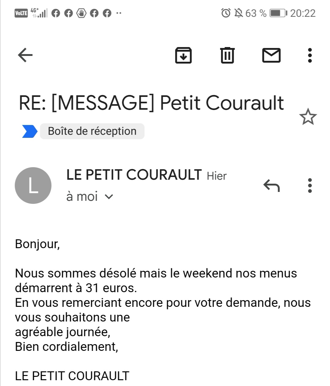 Nous avons dîné au Petit Courault hier soir avec mon mari, nous sommes enchantés! Le lieu est charmant, la salle de réception est chaleureuse et décorée avec goût. Le personnel de salle très accueillant et le conseil est parfait, une belle complémentarité! Le repas était délicieux, raffiné, la présentation soignée.. quel plaisir ! La cheffe utilise des produits locaux et de saison. Nous reviendrons sans aucun doute ! Merci à toute l’équipe
