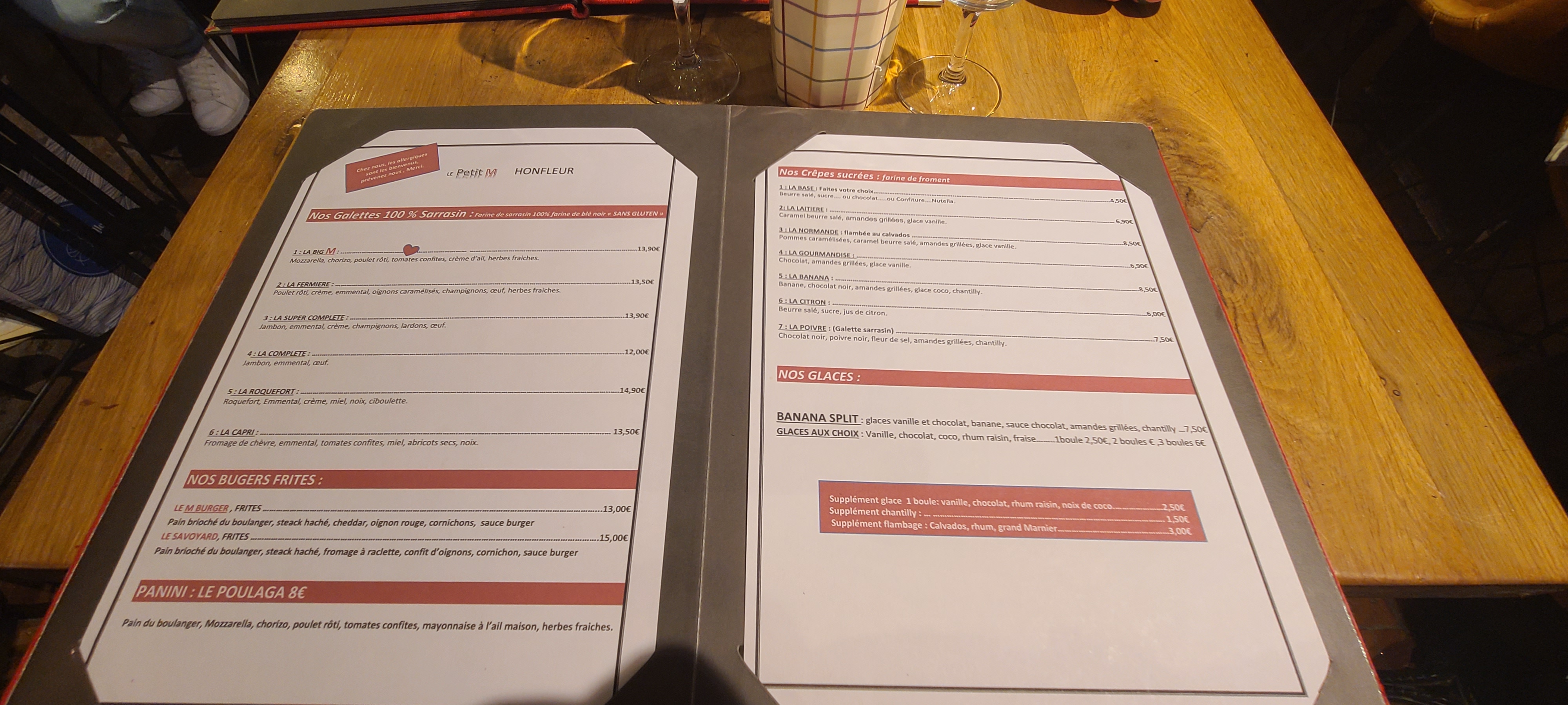 Visite de Honfleur, ballade en bateau pour découvrir le Normandie. Durant notre visite du centre, un petit creux beaucoup de choix de restaurants. On se retrouve devant le petit M, avec une déco sympa, originale... Un service au top, que des produits frais. On a passé un très bon moment. On ne regrette pas notre choix, n'hésitez pas.