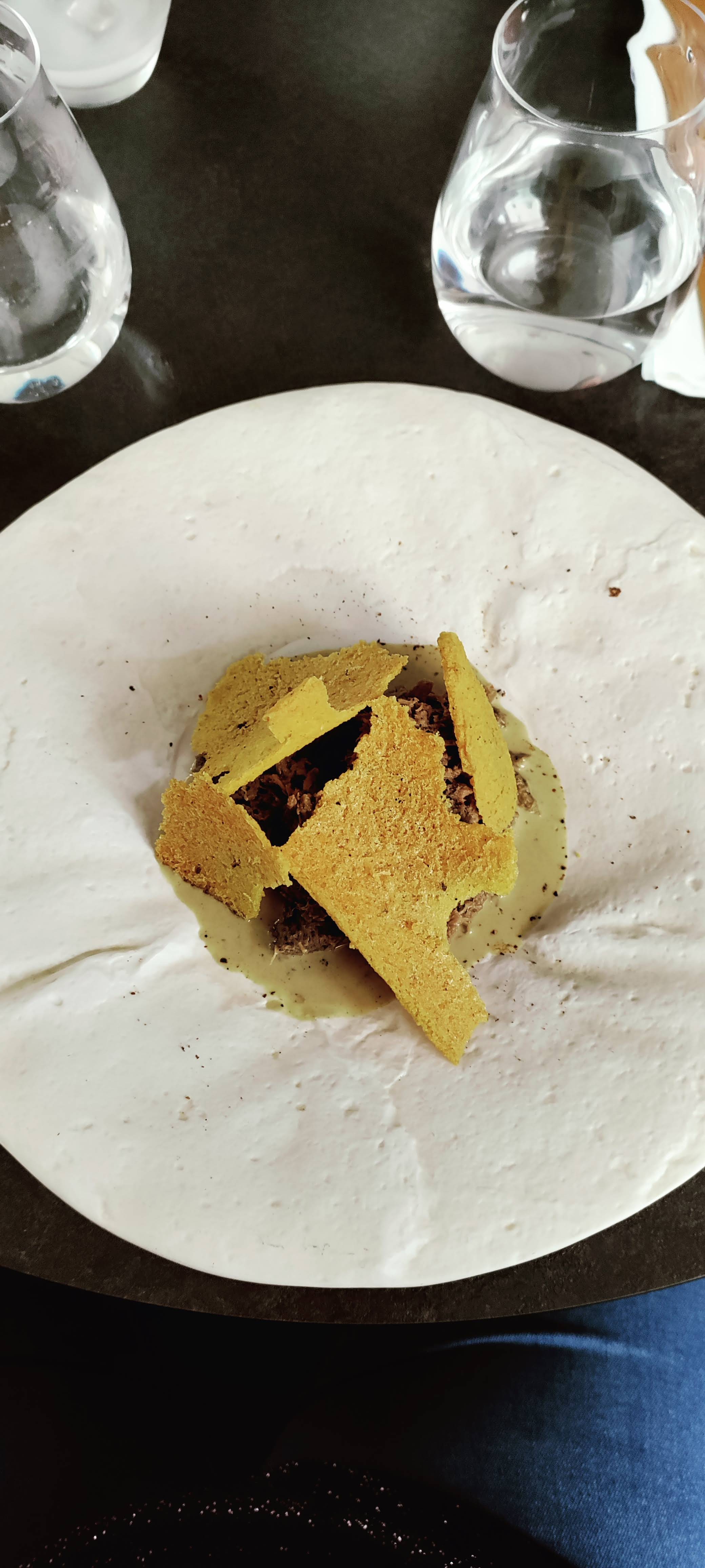 Une belle decouverte mais un peu déçue de retrouver des éléments de l'entrée dans le plat (chips) un peu redondant. Et déçue de la tarte chocolat pas assez forte en goût