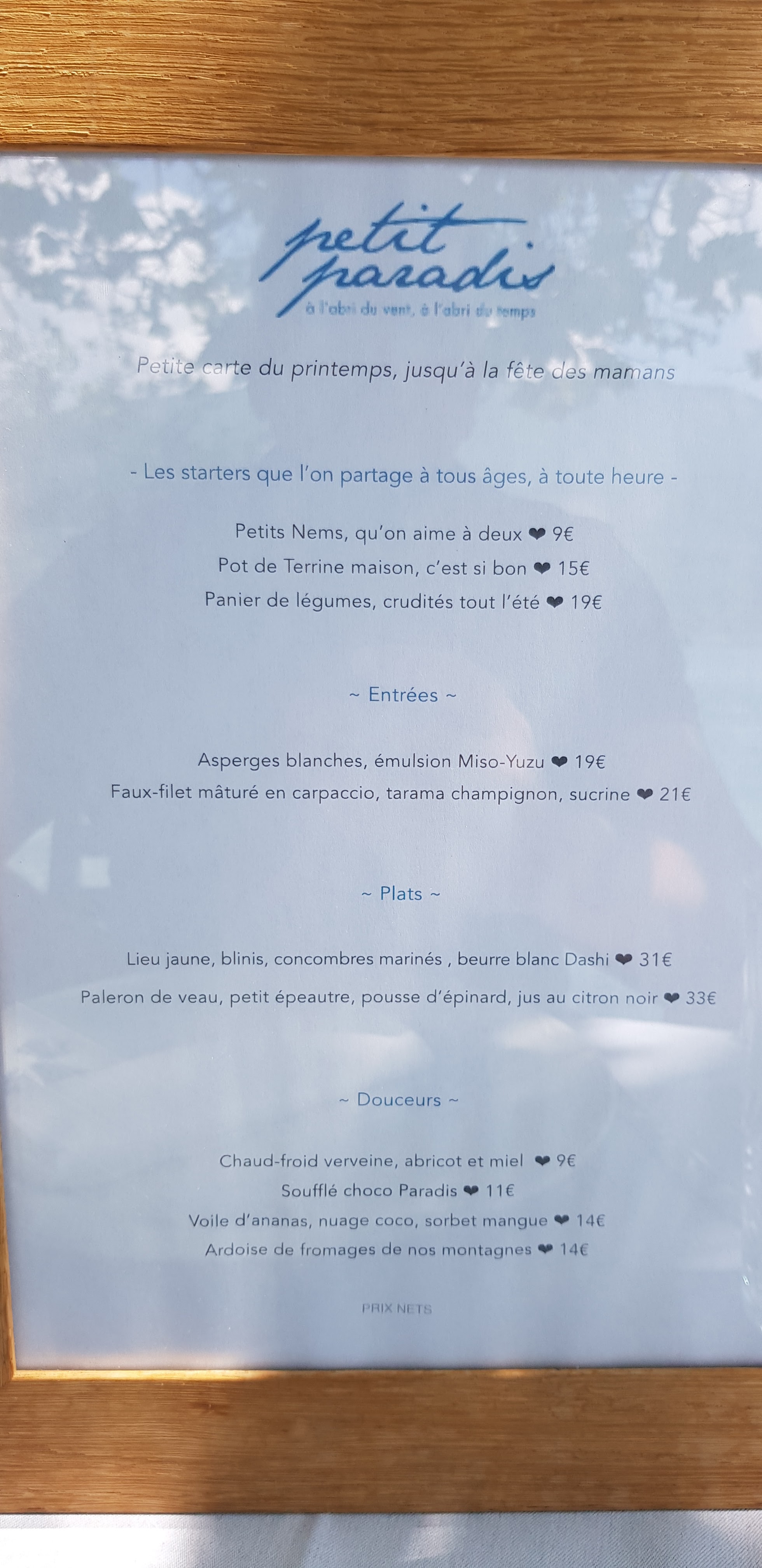 L’endroit comme son nom l’indique est un petit paradis. L’ambiance et la décoration vous transporte aussi ! J’adore l’esprit familial de l’endroit avec les enfants de la famille qui participent au service. J’ai beaucoup aimé les apéros à partager, les nems étaient super bons et la terrine était à tomber ! Pour mon de Rumsteck, les sauces accompagnant n’étaient pas à mon goût (cela ne veut pas dire que ce n’était pas bon !). Le système de réservation pourrait être géré en ligne pour plus de simplicité car aujourd’hui il faut appeler 3 jours avant le jour J pour réserver.