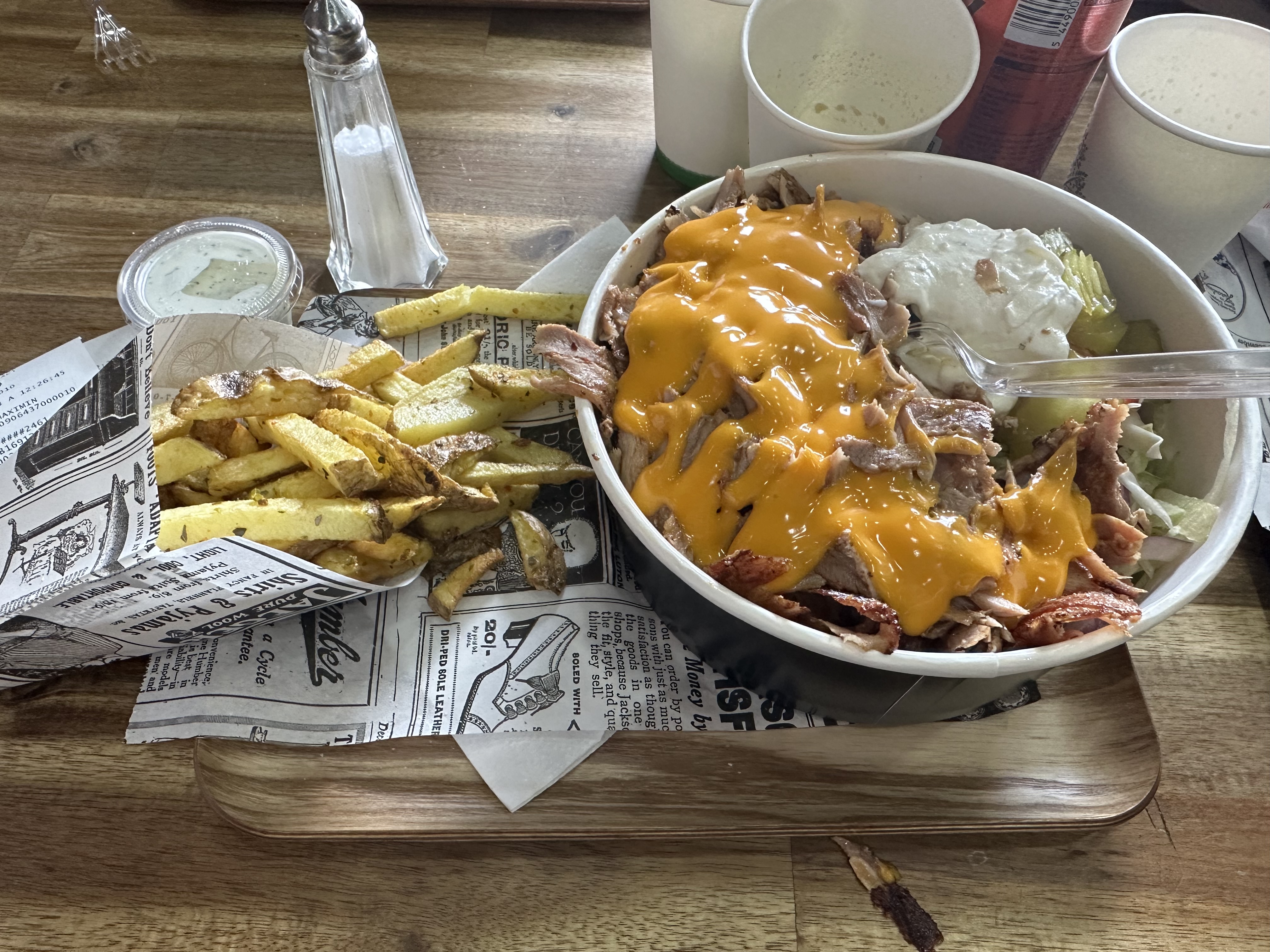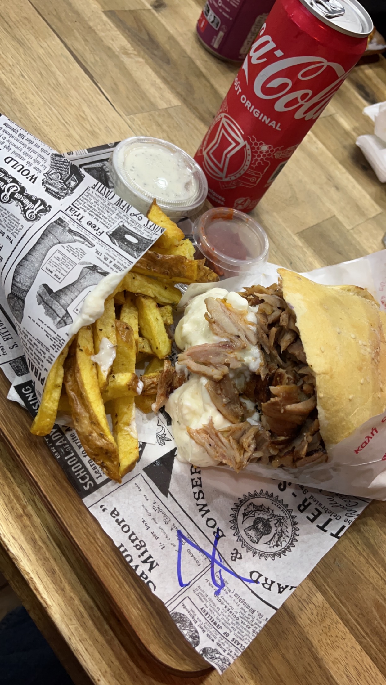 Ca faisait longtemps que j’avais pas manger un kebab pareil ! Incroyable, la pain maison, la cuisson au feu de bois de la broche maison, la sauce blanche, si vous connaissez la saveur des grec en Allemagne ça vaut 100%