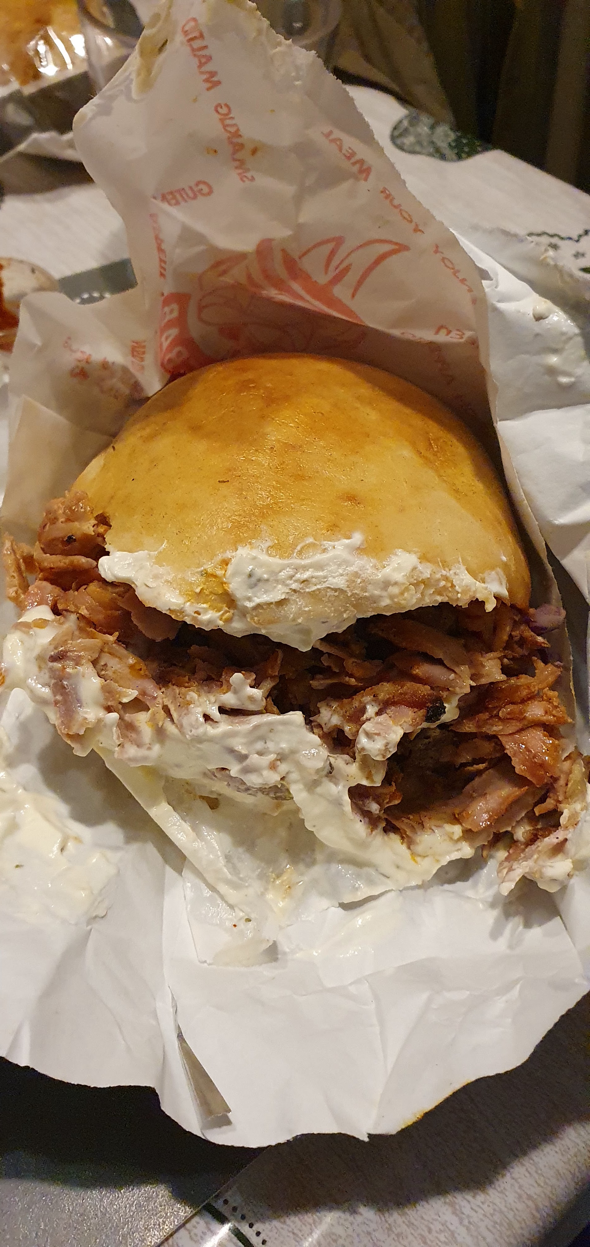 Très très bon grec, la broche est cuit ah feu de bois et sa change tout. Le pain est chaud la sauce du chef est bonne Allez y les yeux fermés.