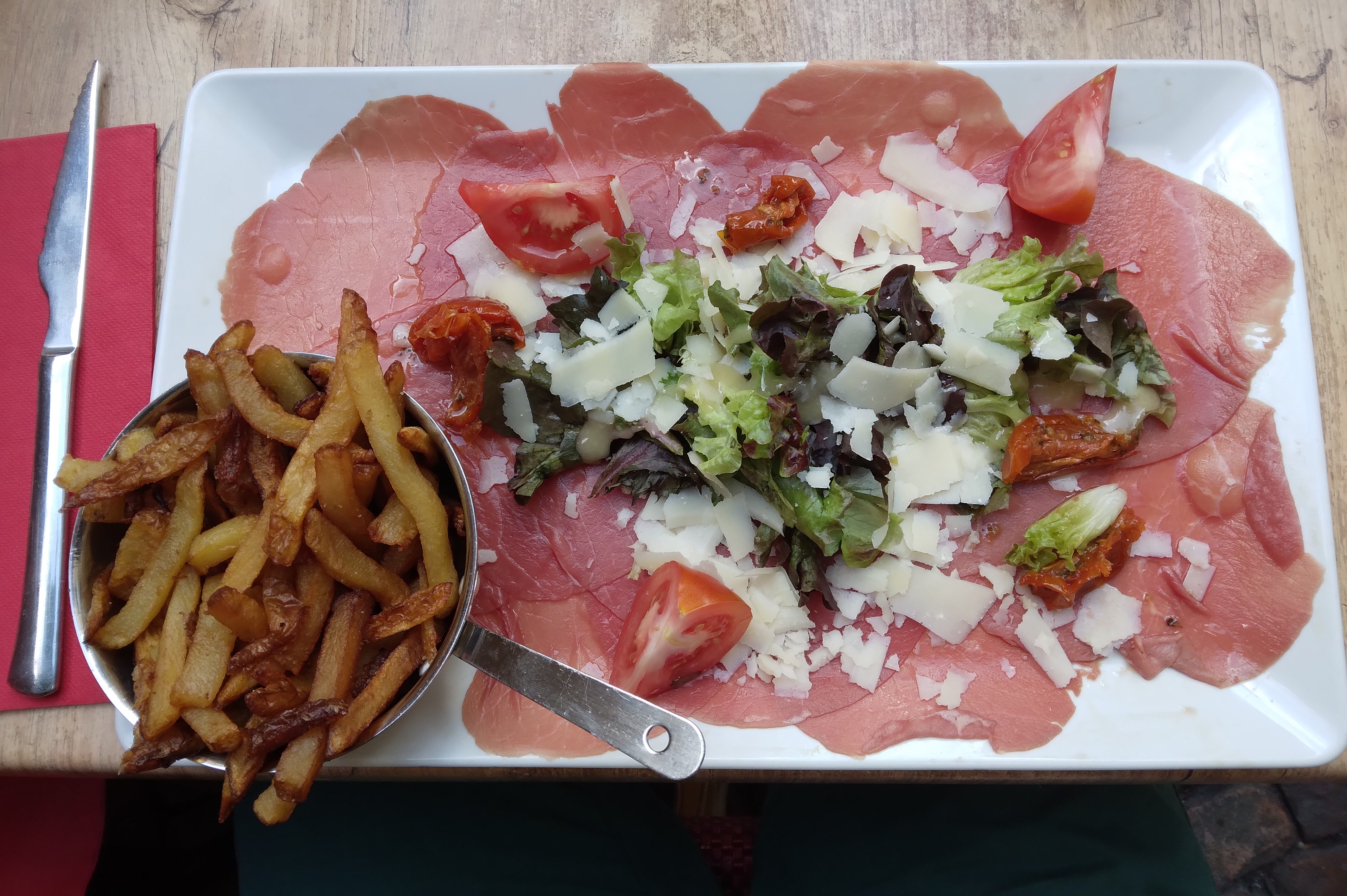 Des tranches de bœuf italiennes avec des frites et de la salade, accompagnées d'une bière également. Le menu était basique et simple et notre serveuse était très sympathique (grande dame blonde)