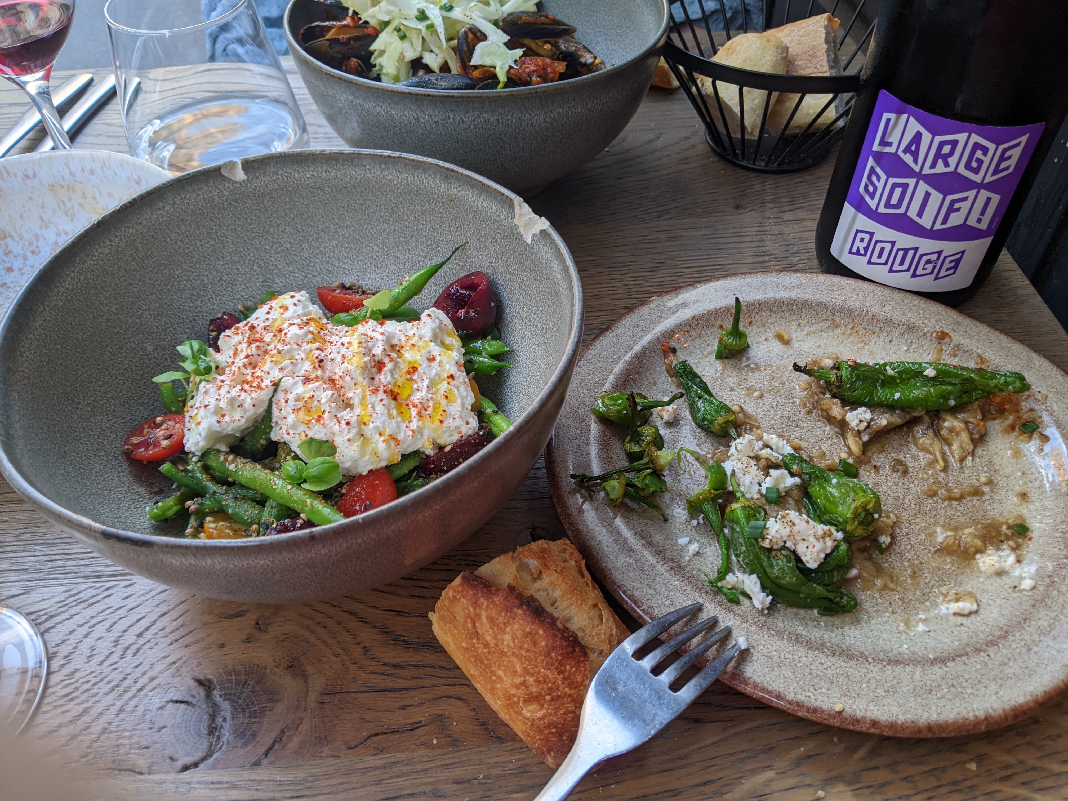 Fantastique petit restaurant avec de la bonne nourriture et du bon vin et une équipe jeune et motivée. Des créations extraordinaires avec un concept pour partager 4-5 plats pour deux. La moitié des plats sont végétariens et conviennent même aux amateurs de viande et de poisson : gaspacho, salade de haricots verts à la burrata, baba Ghanoush à la feta. Encore mieux si : le plat de thon était un peu plus faible que les plats végétariens et le cheesecake était de sortie 😢