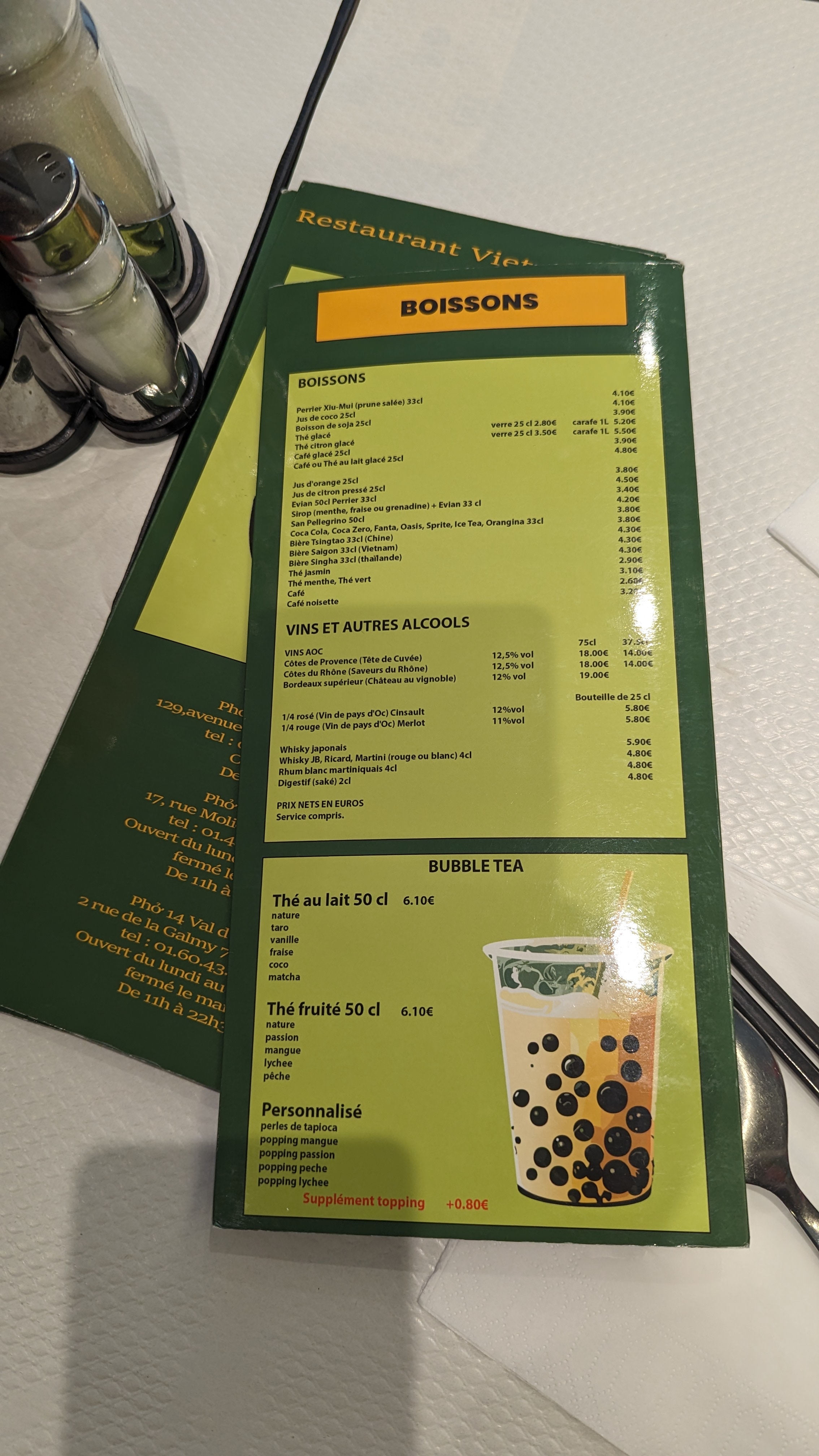 Pho poulet très très bon. Serveurs très agréables et disponibles. Petite terrasse assez calme. Une bonne adresse même tout seul
